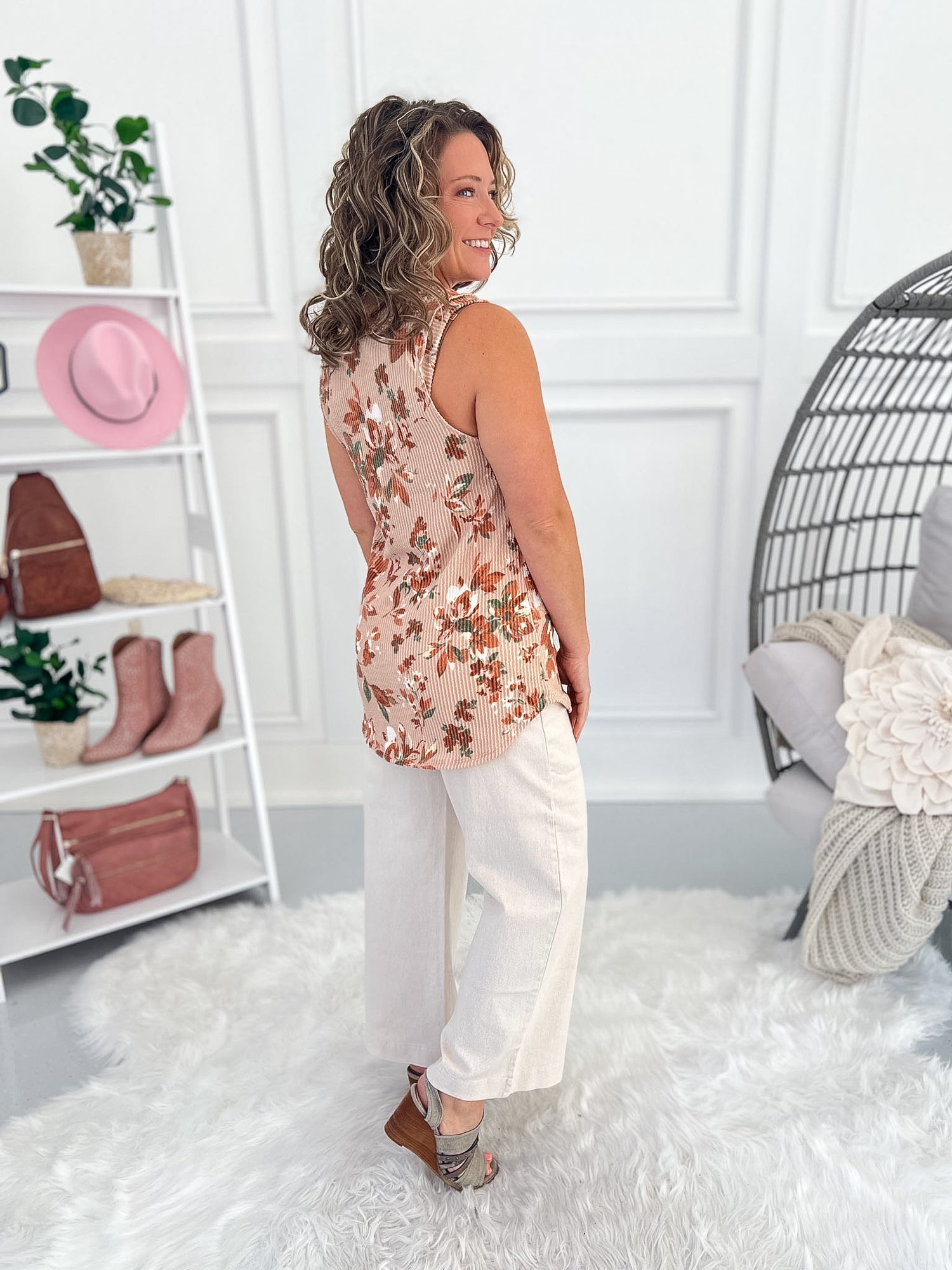 Pair this tank with white denim, linen pants, or your favorite summer shorts for an easy warm-weather outfit. The earthy floral tones give it a soft, elevated look that works perfectly from casual days to dinner out.