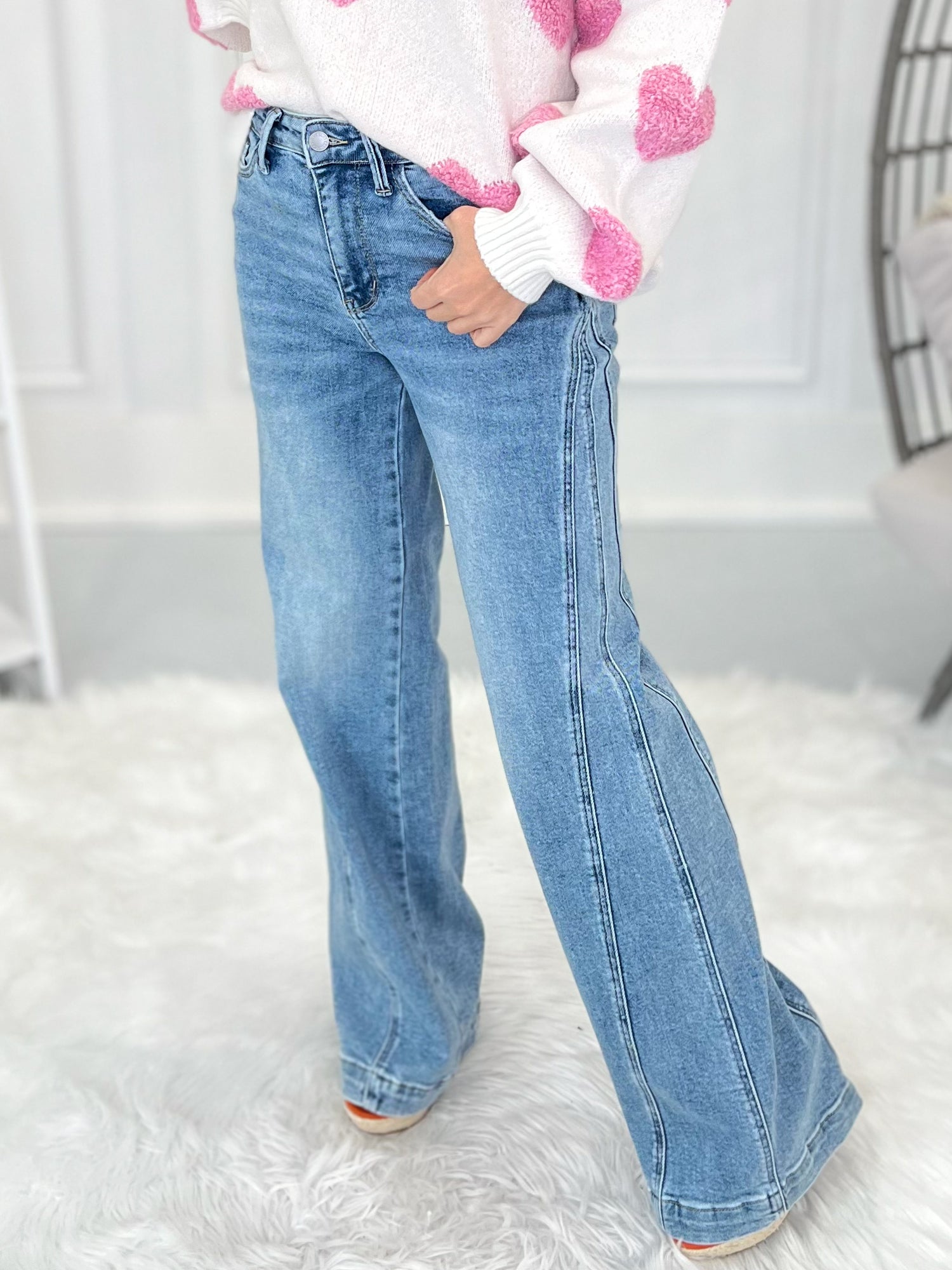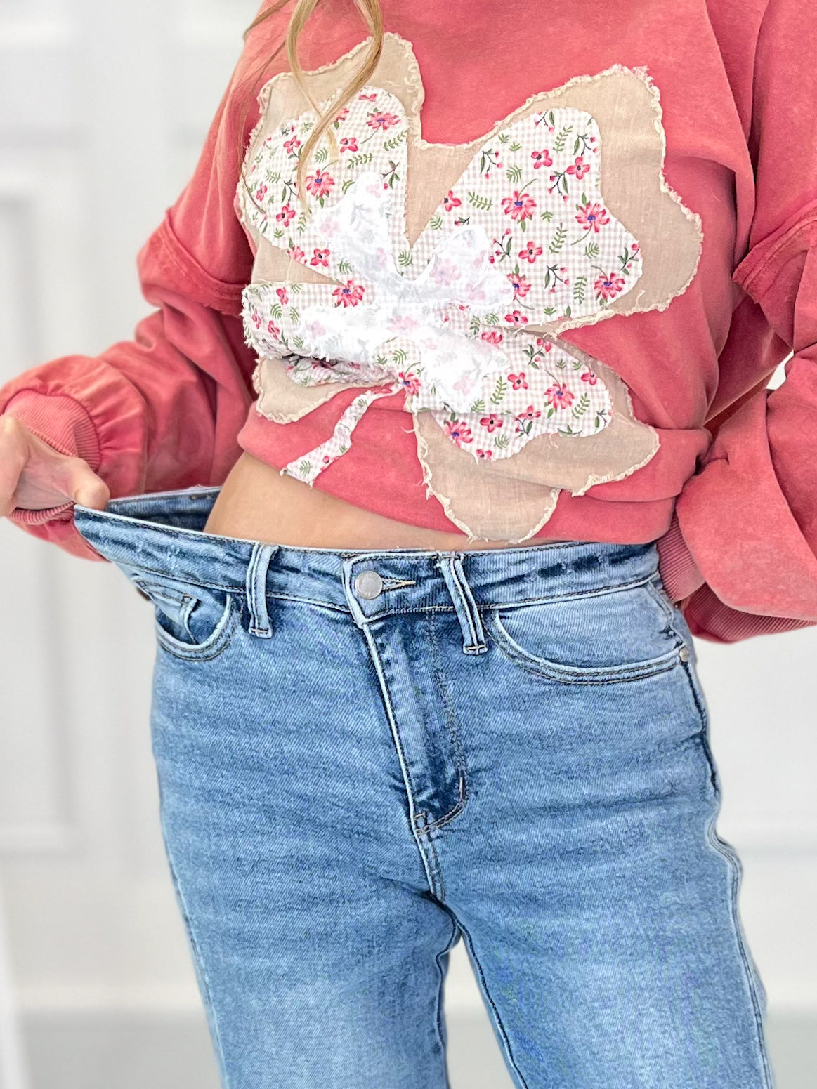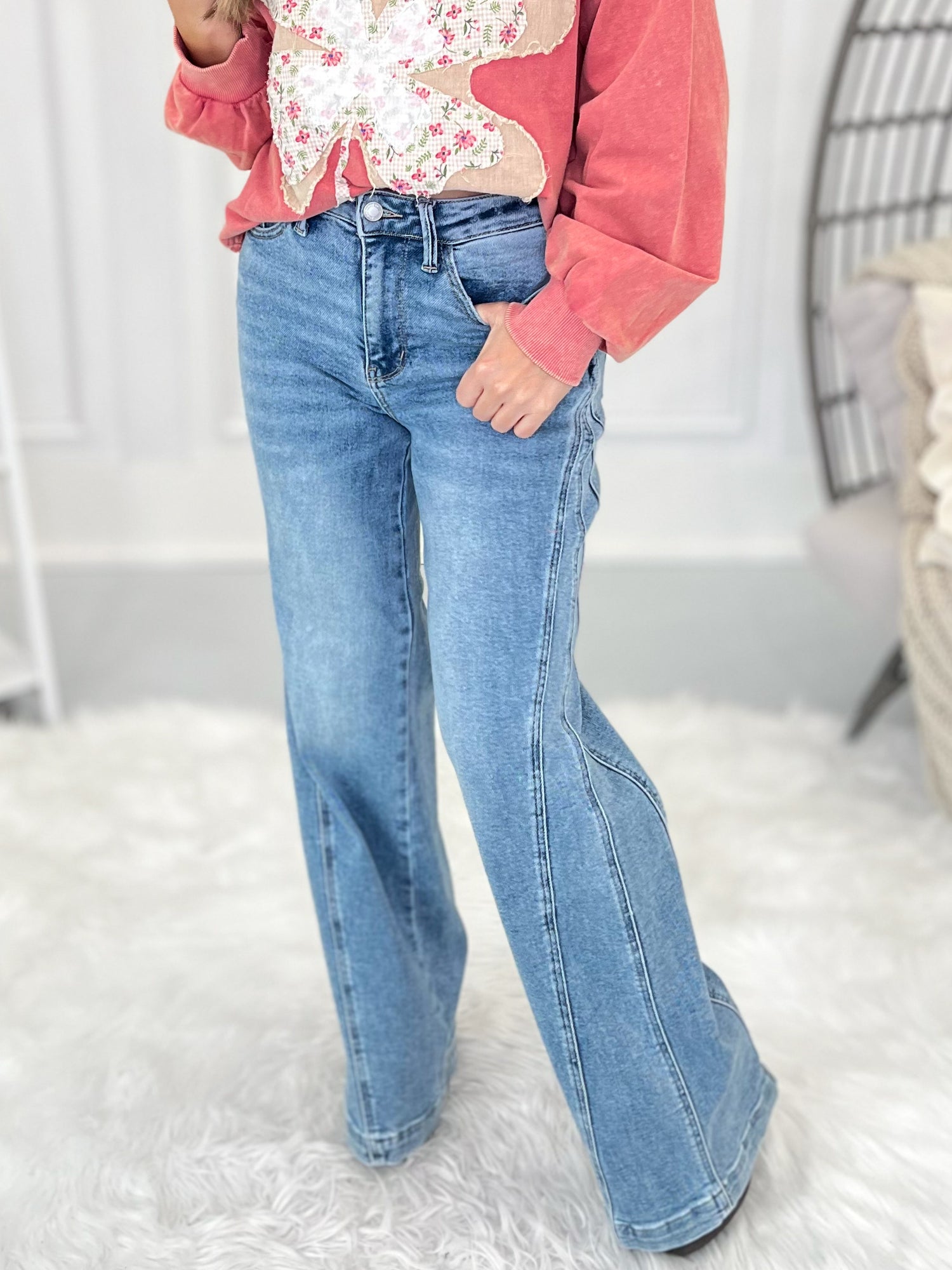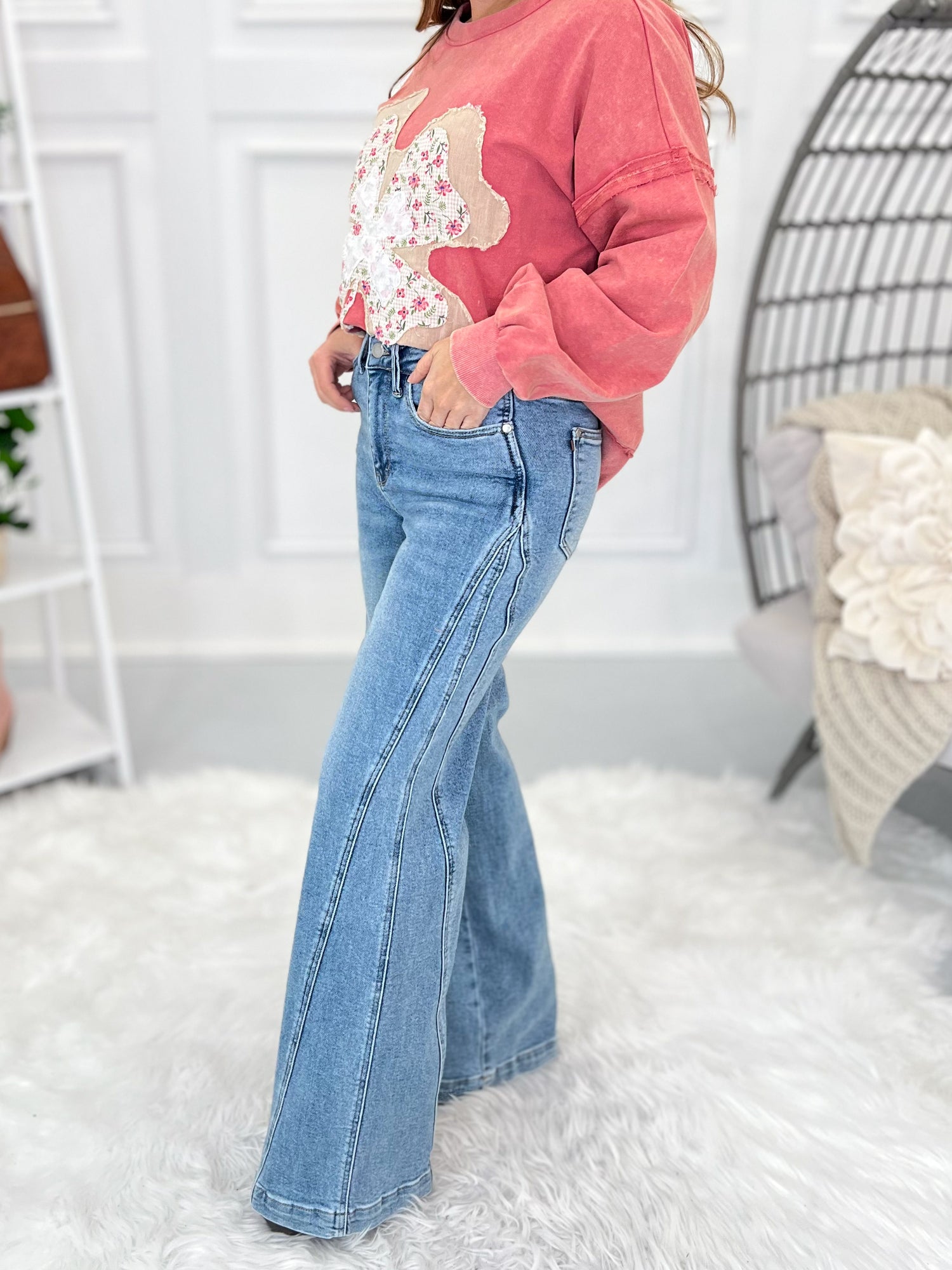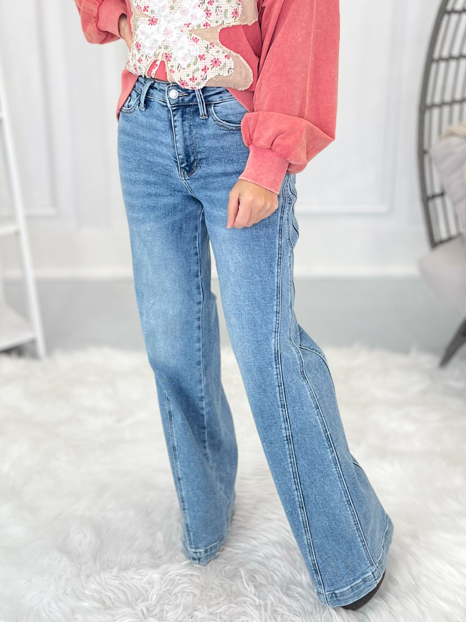 To get your perfect fit, first, let's find your true Judy Blue size. This will be your starting point for all Judy Blue jeans. This brand is generously cut, so you'll find your true Judy Blue size by taking your even, department store pant size and subtracting a number. Once you have determined your true Judy Blue size, then take a peek at the product description of each pair of jeans to see how we recommend sizing! This part is super important - they all fit and stretch a bit different! Lastly - don’t forget to check the item details to see the inseam, rise and fabric for each pair of jeans! Remember that rise is body type dependent (so a high-rise on a short torso may be a mid-rise on a long torso) and we all have multiple inseam preferences depending on the style of jeans we are shopping for!