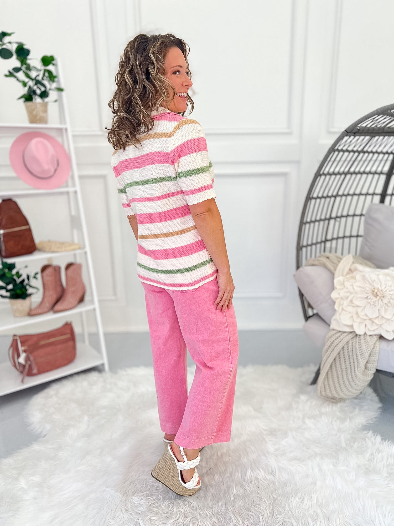 This striped knit top blends preppy charm with casual comfort in an ultra soft, stretchy boutique sweater knit. Featuring a flattering open collar neckline and fun color stripes, it’s an easy piece to style for everyday wear.