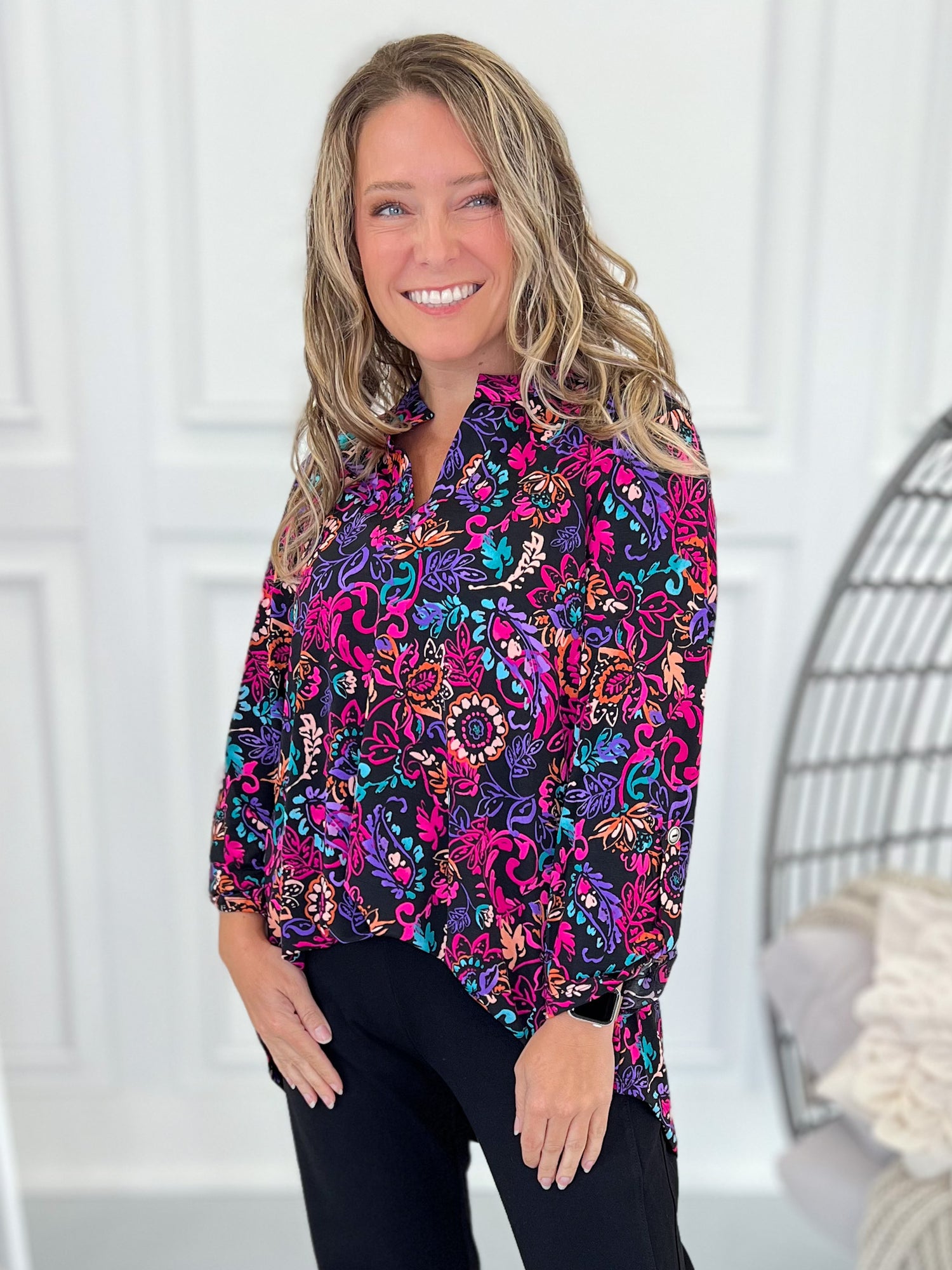 Bold, bright, and totally effortless — this Lizzy top brings instant joy to your wardrobe. The colorful floral print pops against the black background, making it a standout whether you’re heading into the office or out for fun. Lightweight, stretchy fabric keeps you comfy while the relaxed silhouette flatters every shape.