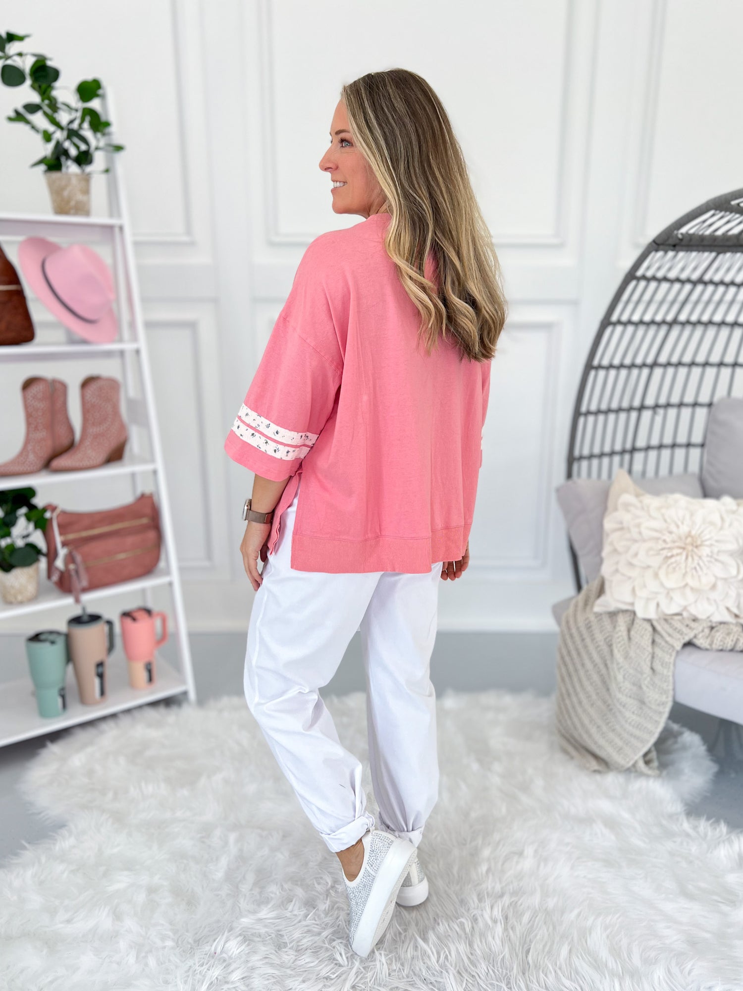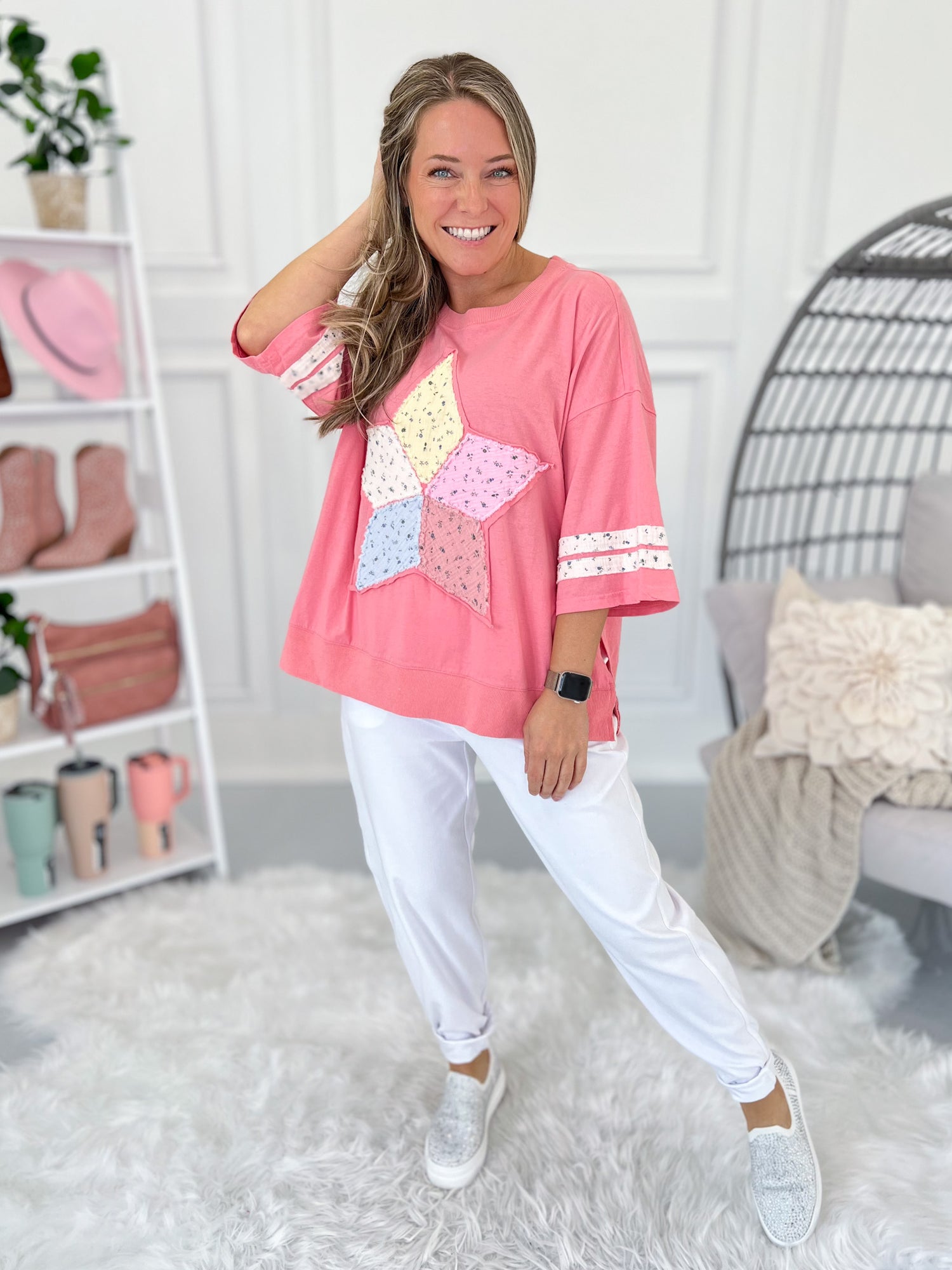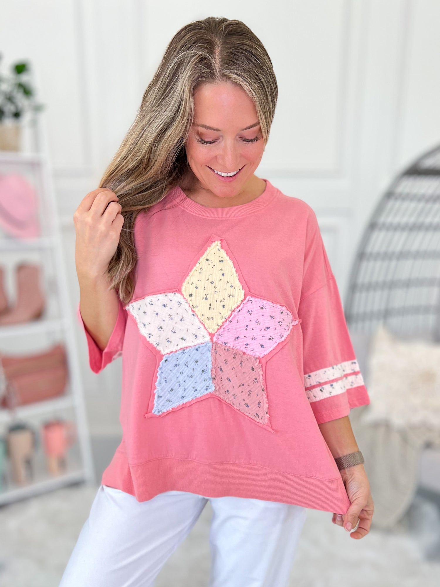 A little sporty, a little sweet—this top brings all the playful vibes. With a soft, sweatshirt-like feel and the cutest patchwork star front and center, it’s an easy throw-on that still makes a statement. Style it with denim, joggers, or shorts for an everyday look that feels just a little more fun.
