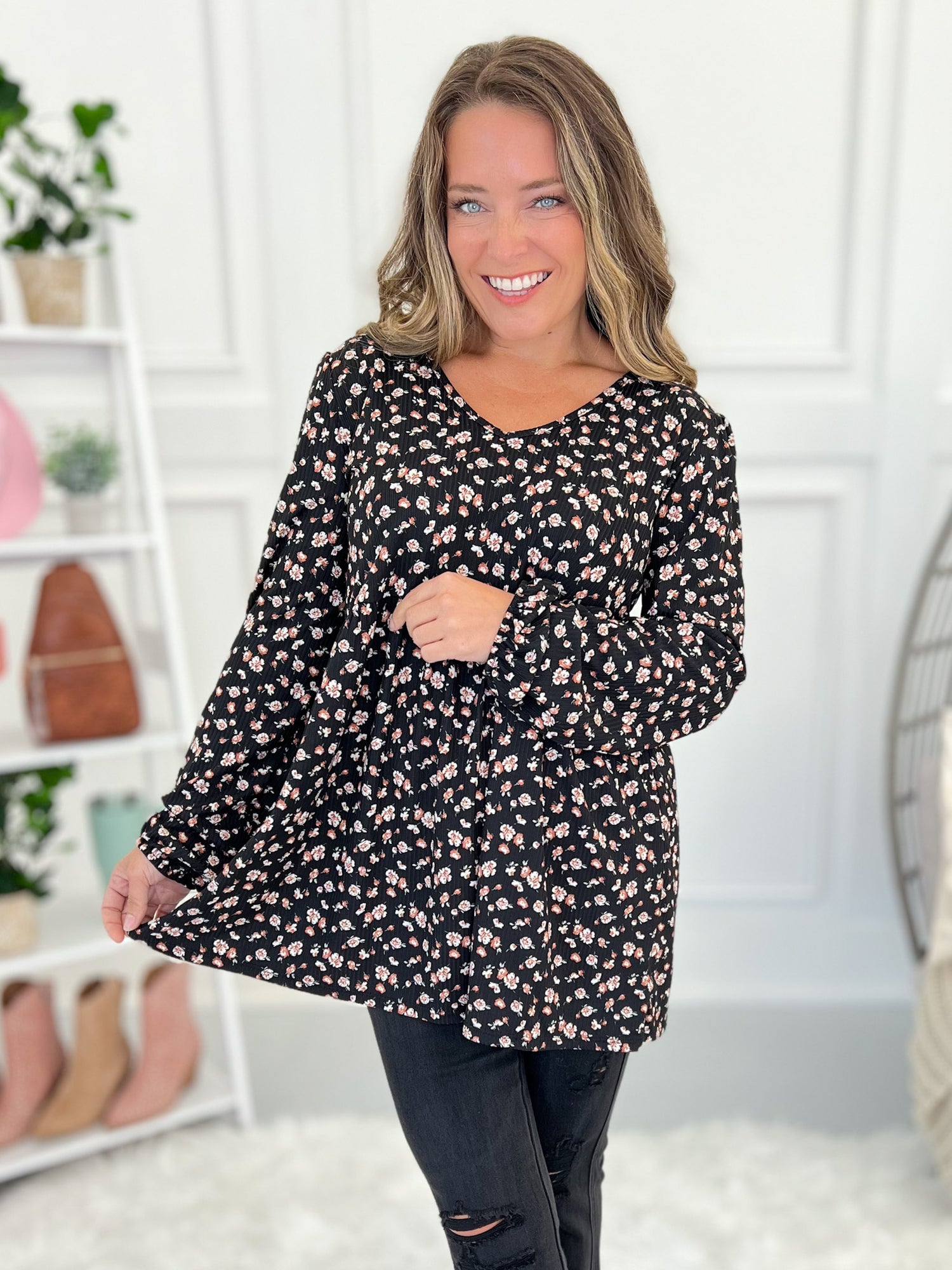 Slip into the effortless beauty of our Making The Most Top. With its dainty floral print on a classic black background, this top is the perfect choice for an easy, yet stylish look. The Babydoll silhouette flatters any figure, and the self-tie back detail allows for a customizable fit.