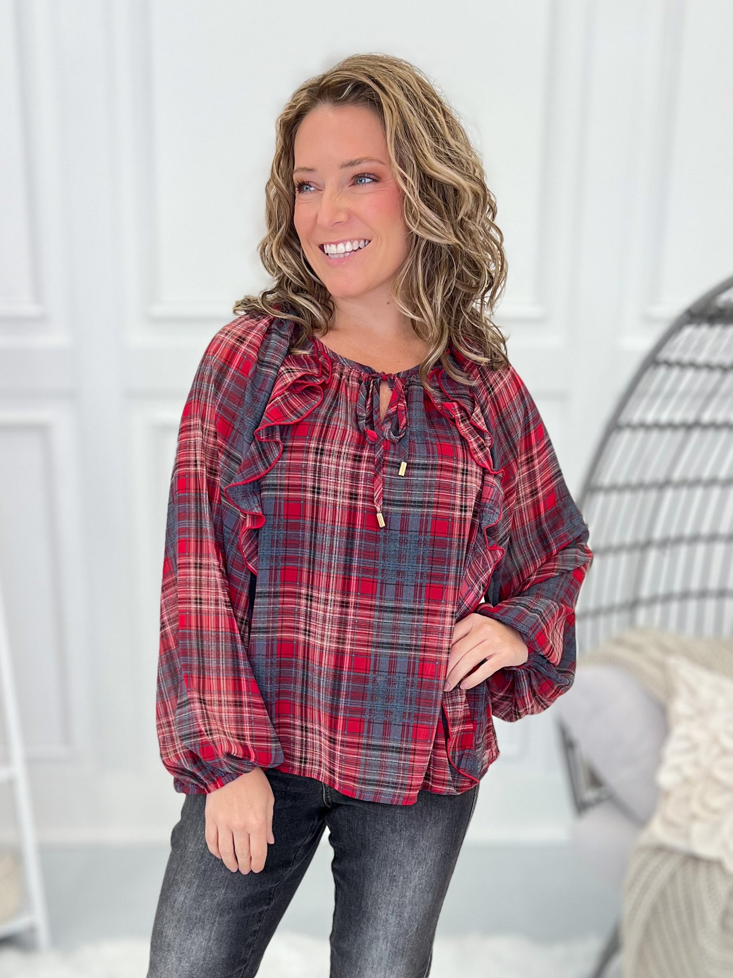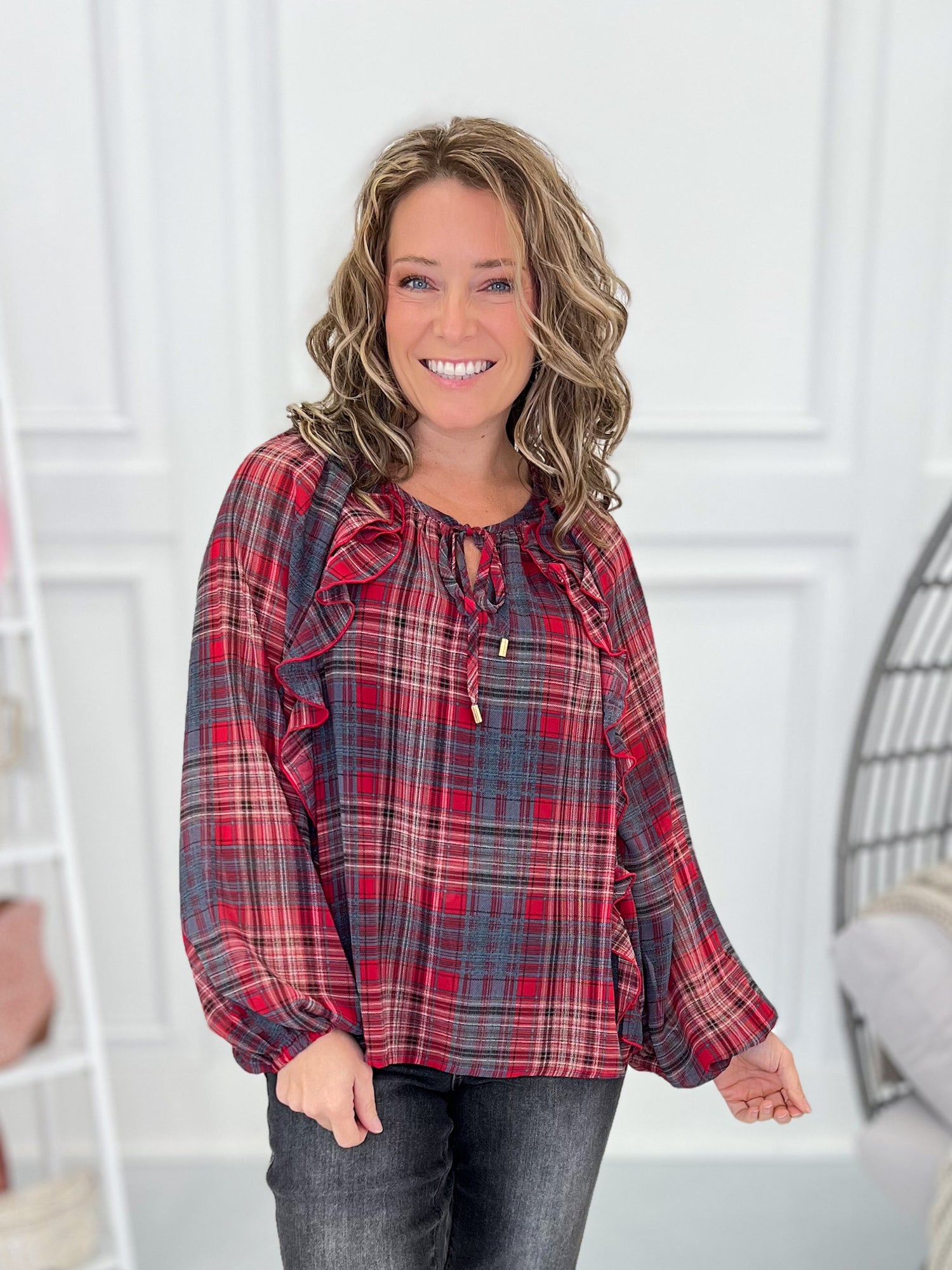 This lightweight plaid blouse is one you’ll want to wear on repeat! The airy chiffon fabric and flowing drape make it easy to dress up for work or down for a casual day out. Ruffle details and a tie neckline add just the right touch of charm.