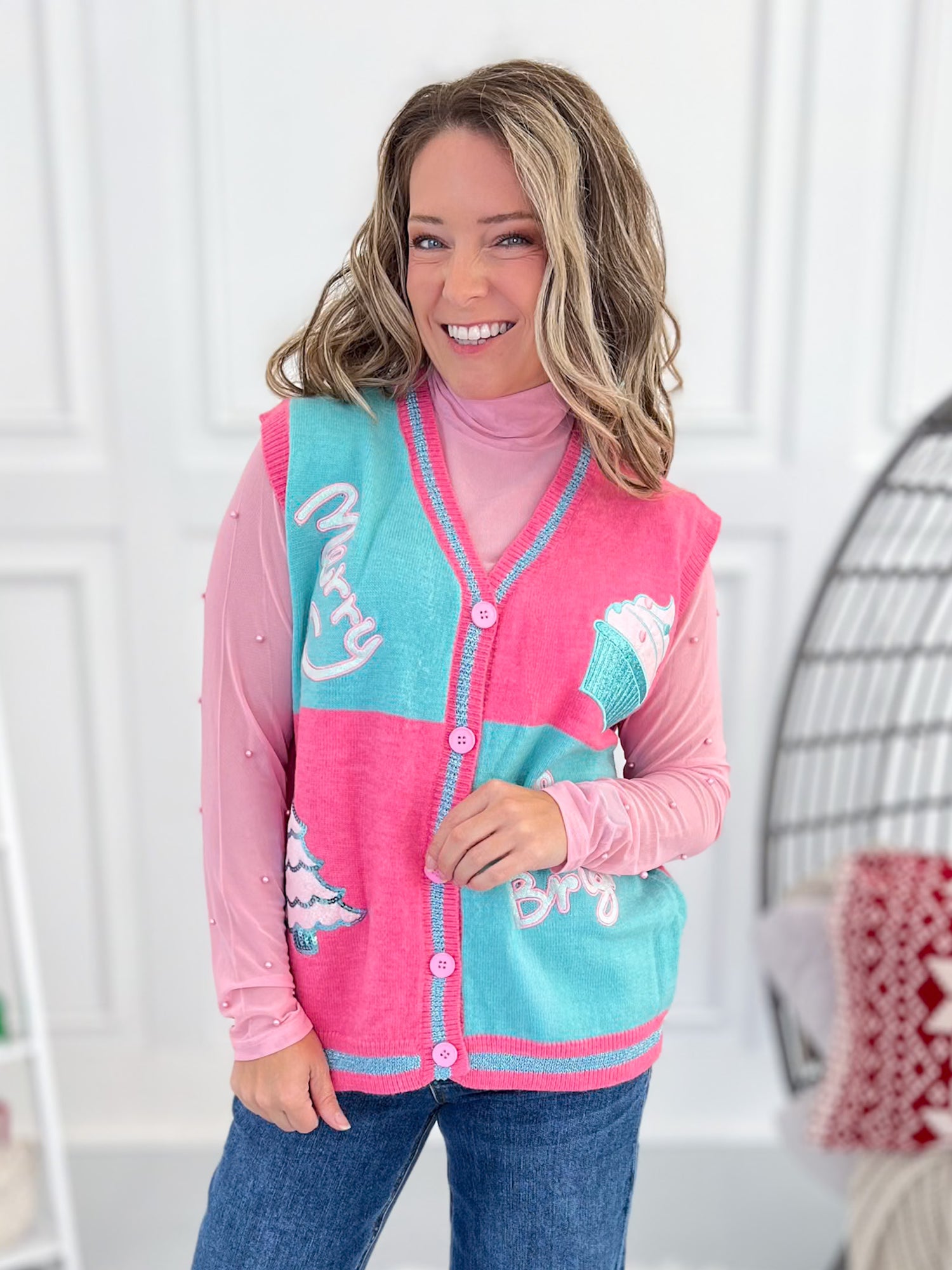 Get merry, get bright! This whimsical sweater vest is full of festive cheer with embroidered glitter patching, pearls, and sequins all over. The glittery varsity trim gives it a playful designer vibe that’s just as cute layered over a turtleneck as it is over a classic button-up or mesh top.