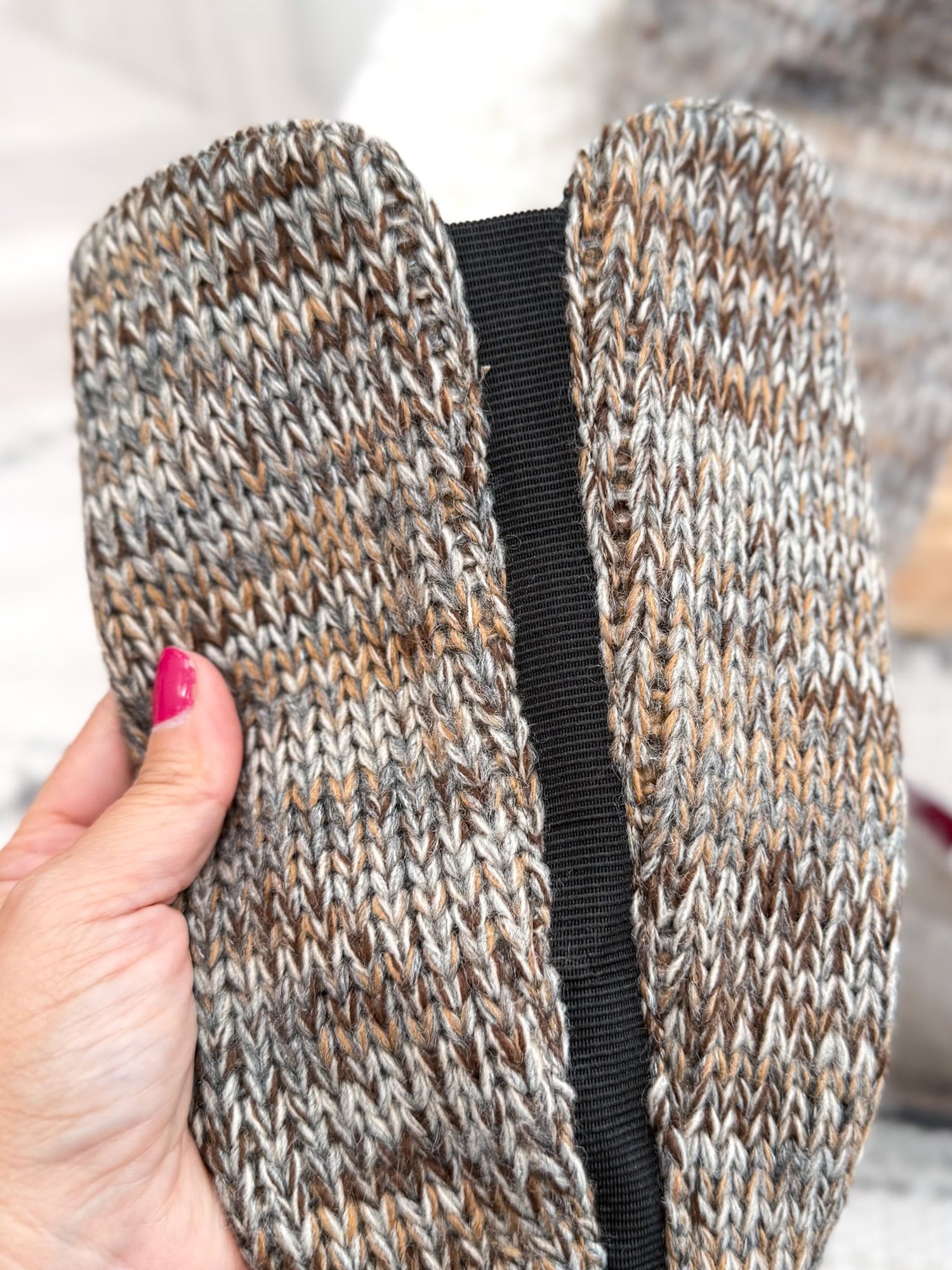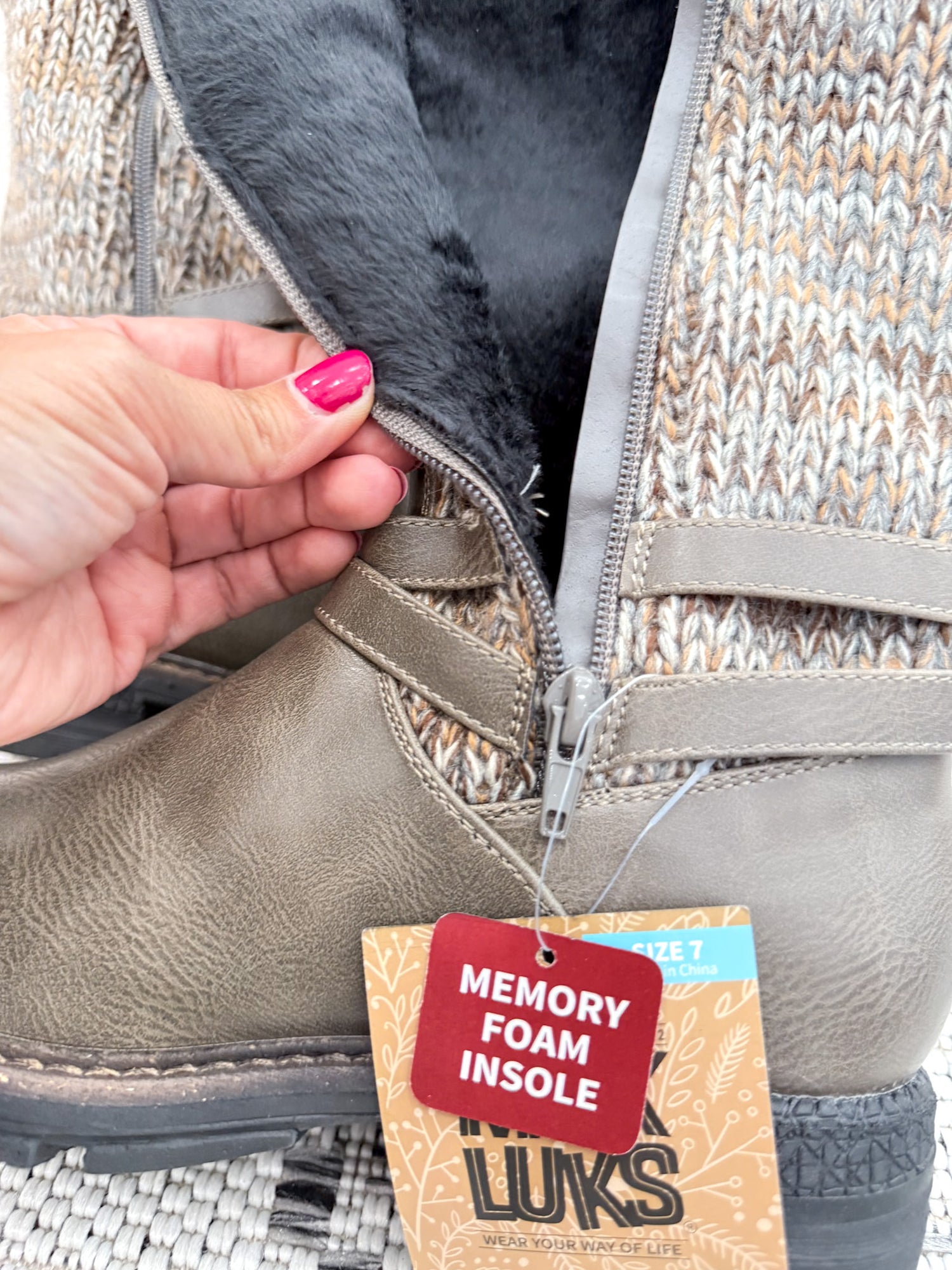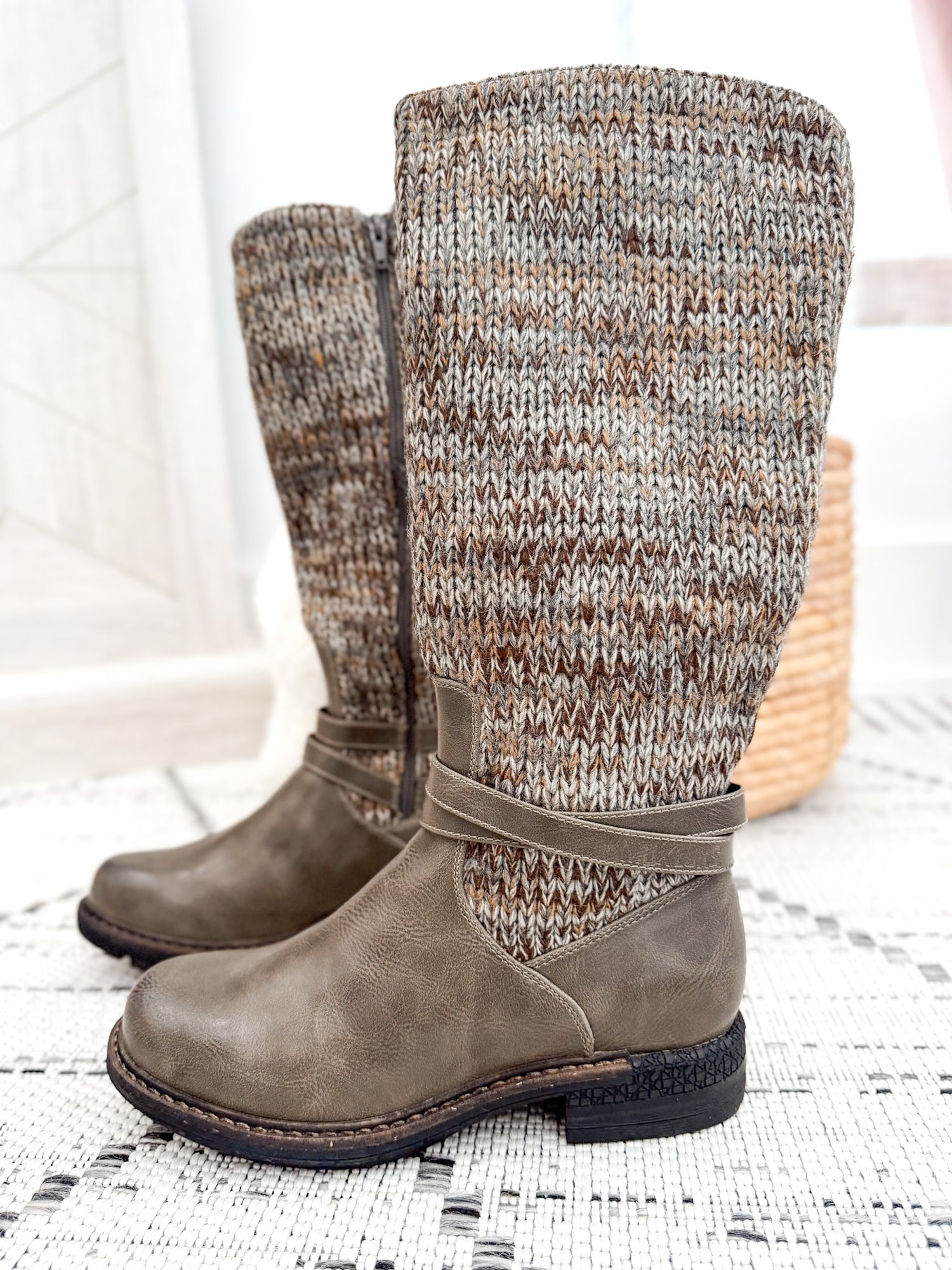 - Tall & Stylish: Stone grey boot with knit accents and buckle detail