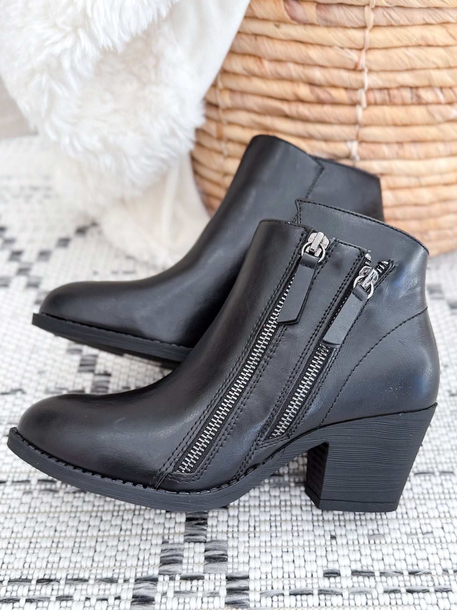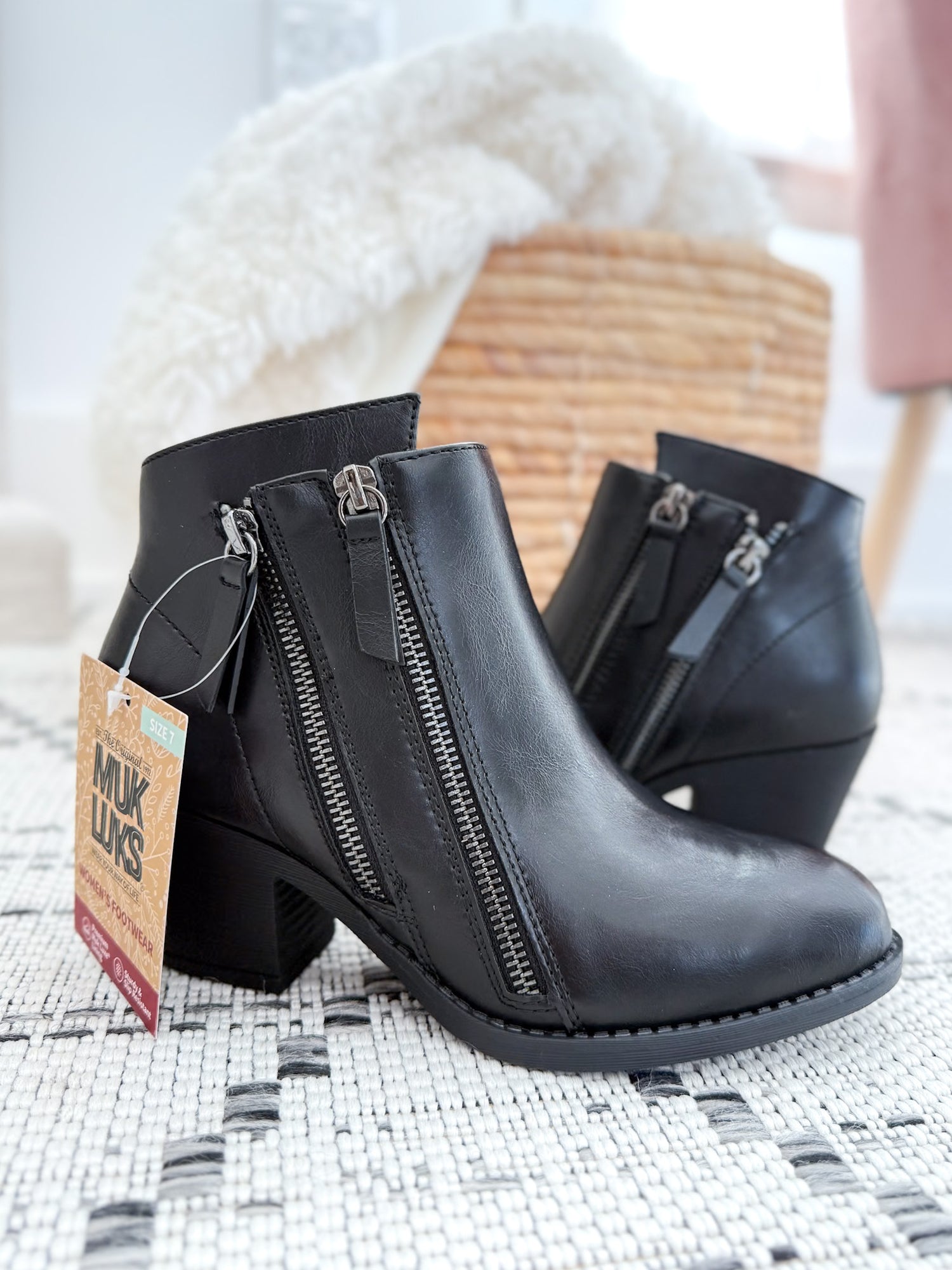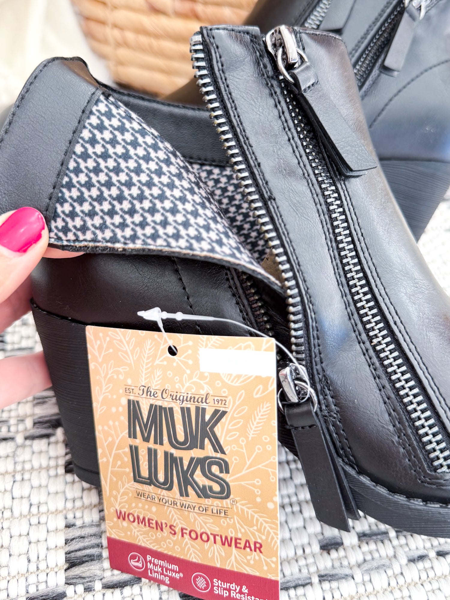 Classic with a touch of edge—the Yellowstone Yardley Boot by Muk Luks is your must-have ankle bootie in sleek black. With its double zip detail, asymmetrical ankle cut, and chic almond toe design, this boot is as versatile as it is stylish. The houndstooth lining adds a playful surprise, while the memory foam insole and supportive block heel keep you comfortable all day. Dress them up with skinny jeans and a blazer or keep it casual with leggings and a cozy sweater.