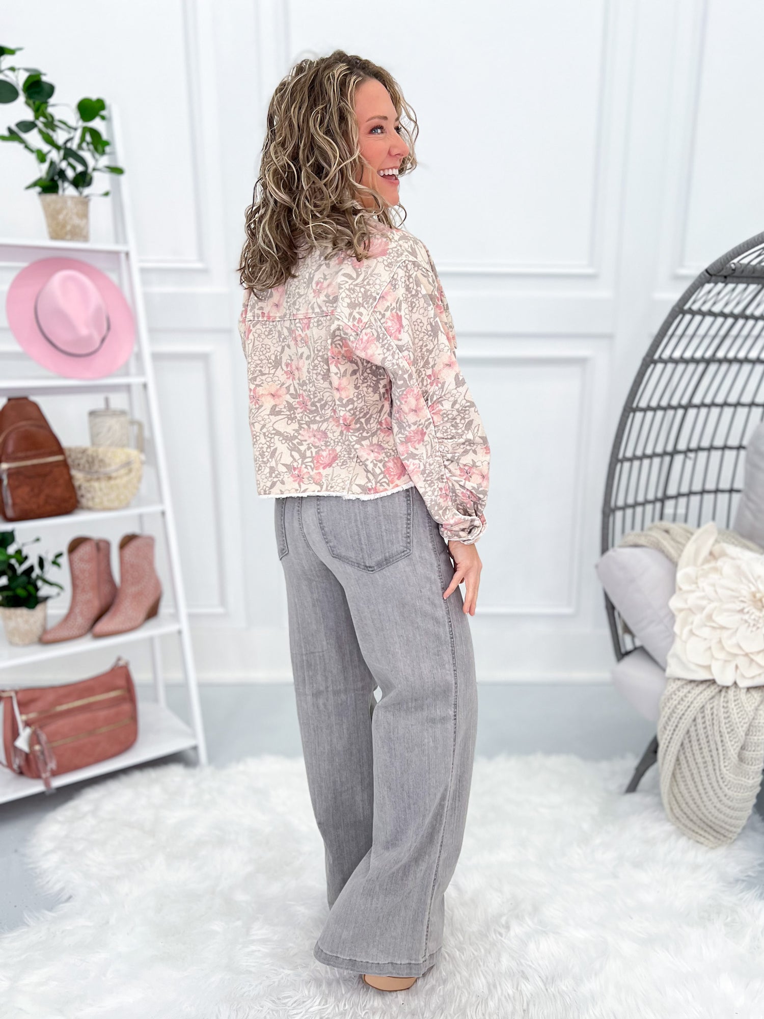 Soft florals meet effortless layering in this cropped denim jacket that instantly elevates any outfit. The feminine print and lived-in finish make it perfect over tanks, dresses, or lightweight knits for casual days, brunch dates, or cool evenings. Easy, flattering, and just the right amount of boho charm.