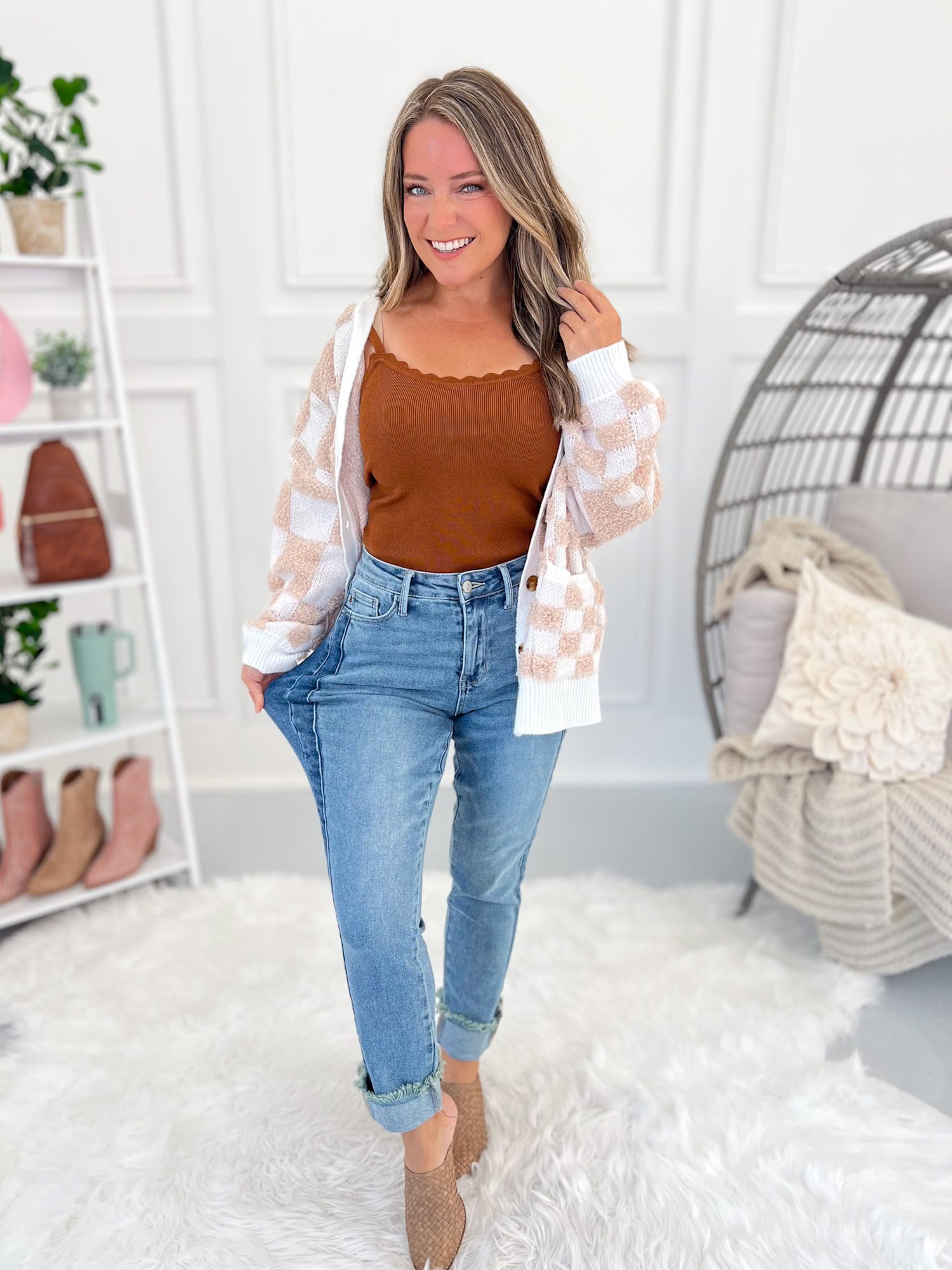 To get your perfect fit, first, let's find your true Judy Blue size. This will be your starting point for all Judy Blue jeans. This brand is generously cut, so you'll find your true Judy Blue size by taking your even, department store pant size and subtracting a number. Once you have determined your true Judy Blue size, then take a peek at the product description of each pair of jeans to see how we recommend sizing! This part is super important - they all fit and stretch a bit different! Lastly - don’t forget to check the item details to see the inseam, rise and fabric for each pair of jeans! Remember that rise is body type dependent (so a high-rise on a short torso may be a mid-rise on a long torso) and we all have multiple inseam preferences depending on the style of jeans we are shopping for!