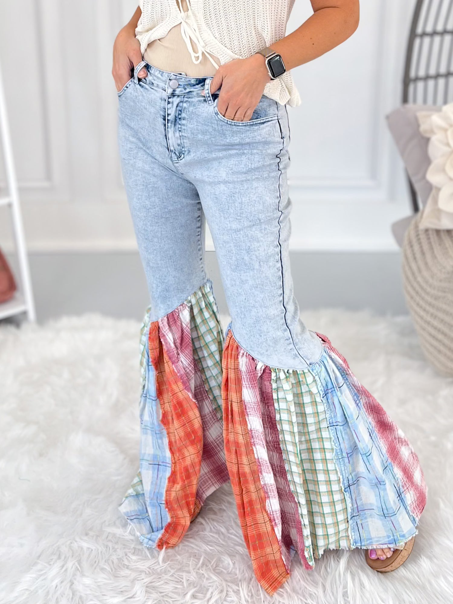 Calling all retro queens—your new favorite denim just arrived. These funky flares bring the vibes with a bold plaid patchwork and a comfy, stretchy fit that moves with you. Whether you’re hitting up a concert, farmers market, or just feel like showing off your inner free spirit, these pants do all the talking. Pair them with a simple tank, graphic tee, or even a crocheted top for a full-on boho moment.