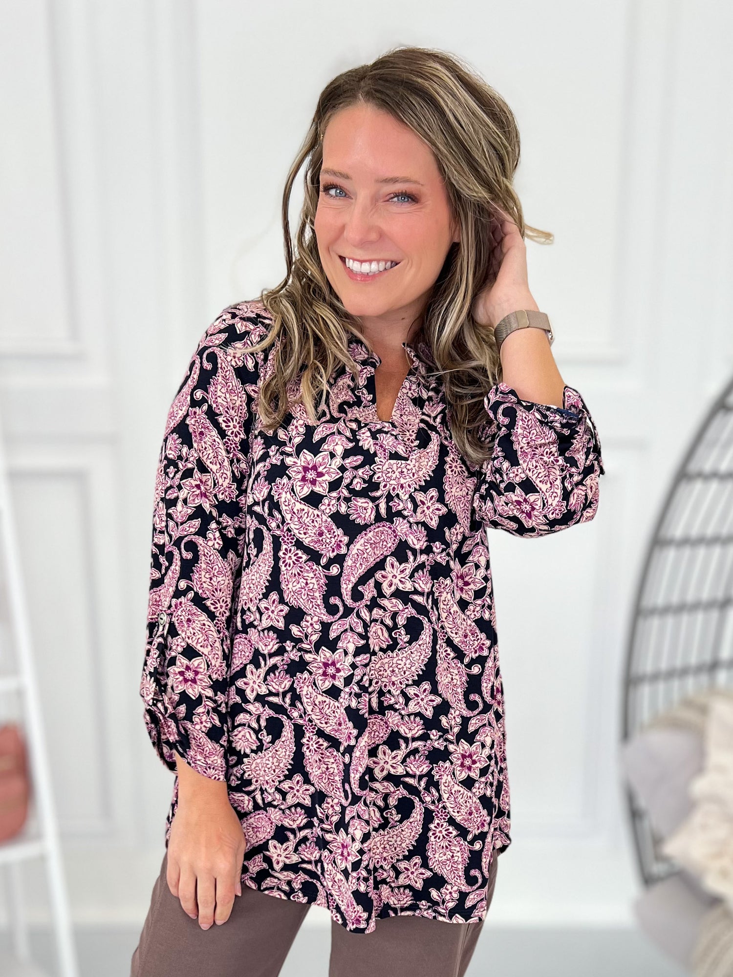 A refined pink paisley on black gives this Lizzy a dressier vibe—perfect with Magic Pants for work or black denim for a night out. With the elevated look, but effortless fabric, you can look good without the fuss!