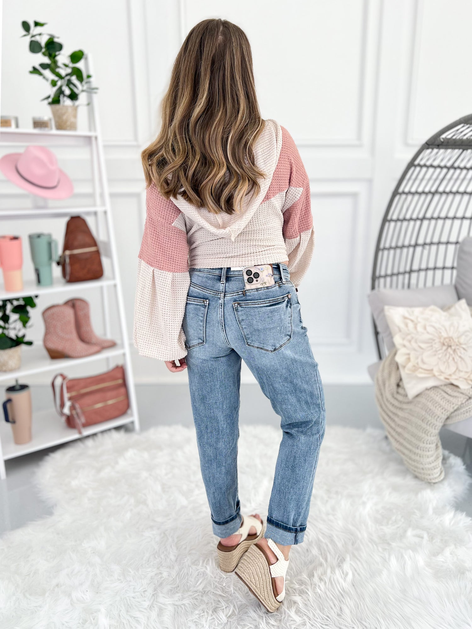 Slim fit jeans are always a hit with their tapered leg, that is more relaxed and comfortable than a skinny jean! They are so on trend with the casual and care-free vibe, and the tapered ankle means any shoe goes! The hidden cell phone pocket in this pair is so brilliant - rock them to a concert or event where you want to safely conceal your phone and be hands-free!