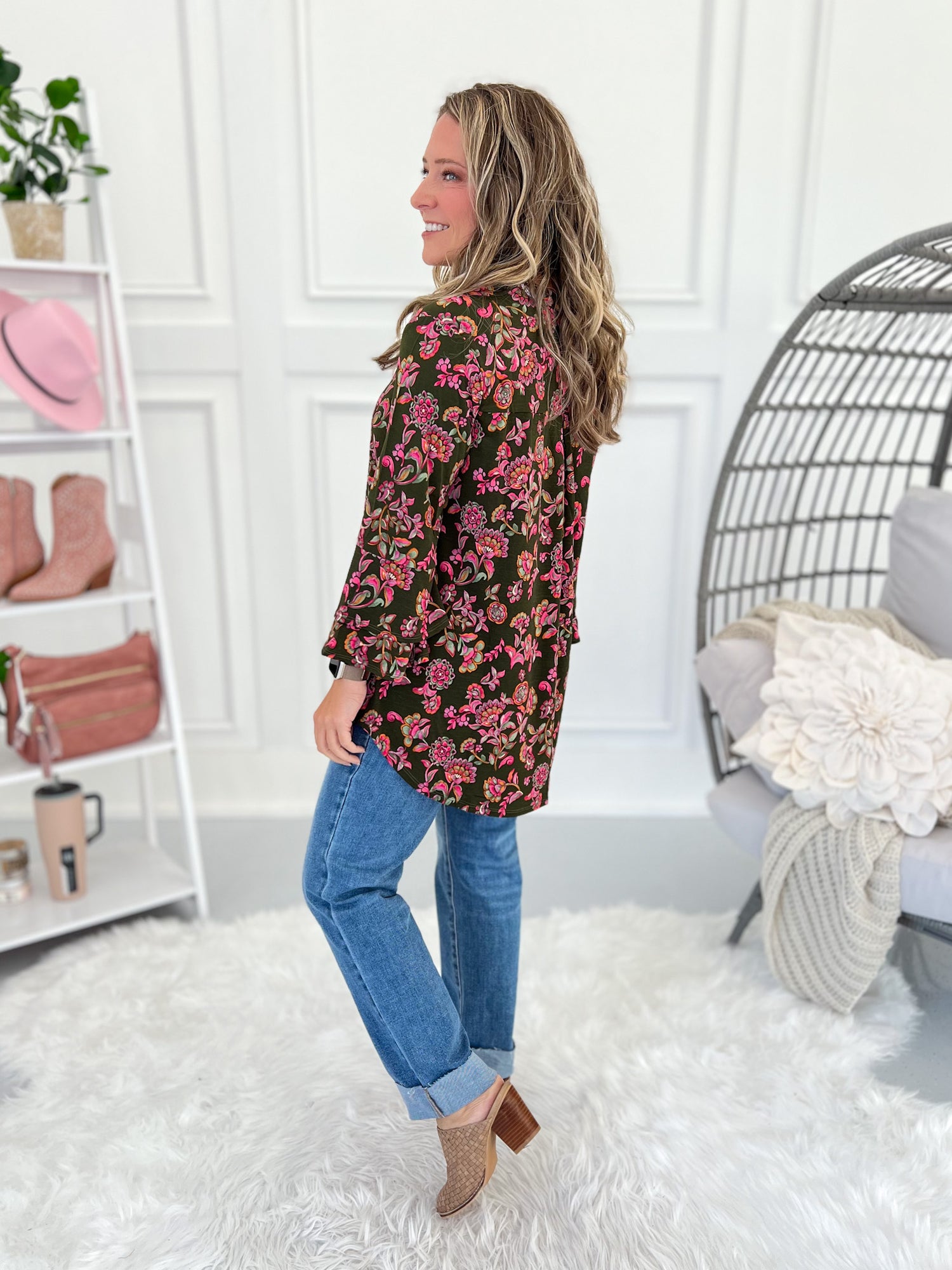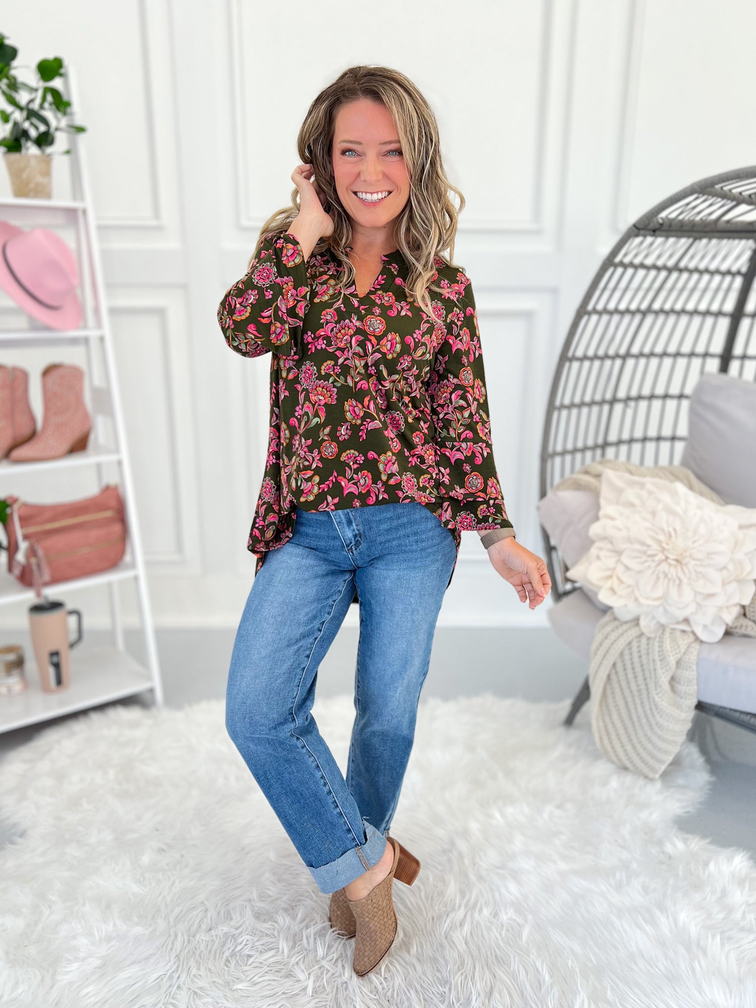 Brighten your wardrobe with the Dear Scarlett Lizzy Bell Sleeve Top in olive floral. The mix of bold pink blooms against the earthy background makes this top a standout. Designed with wrinkle-resistant, stretchy fabric and a flattering silhouette, it’s a go-to for work or play.