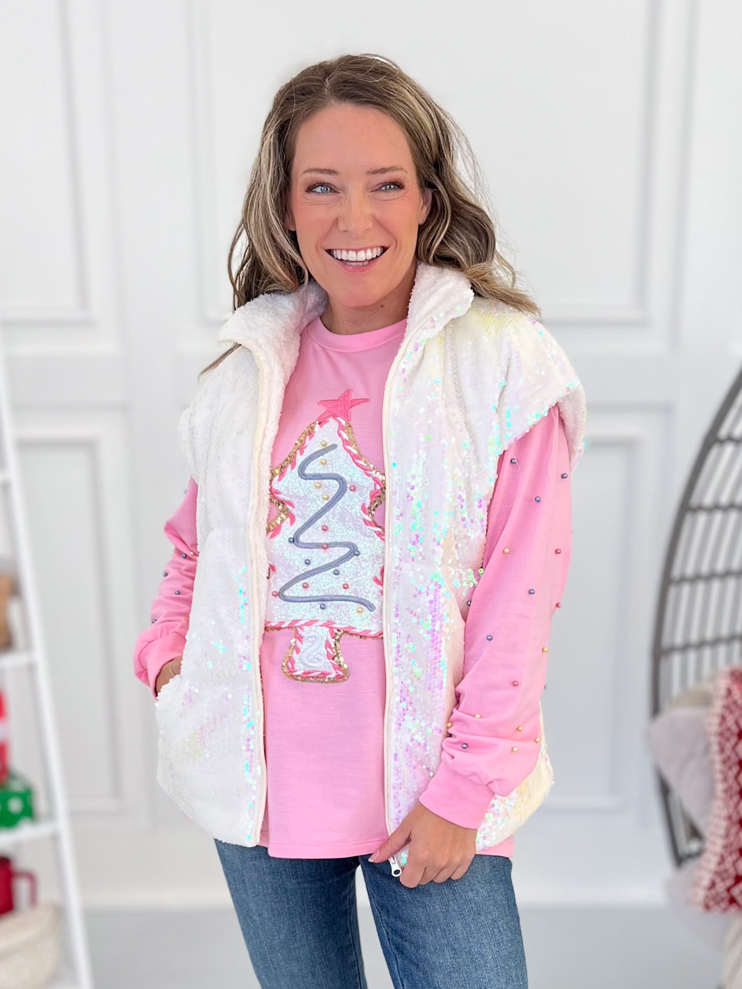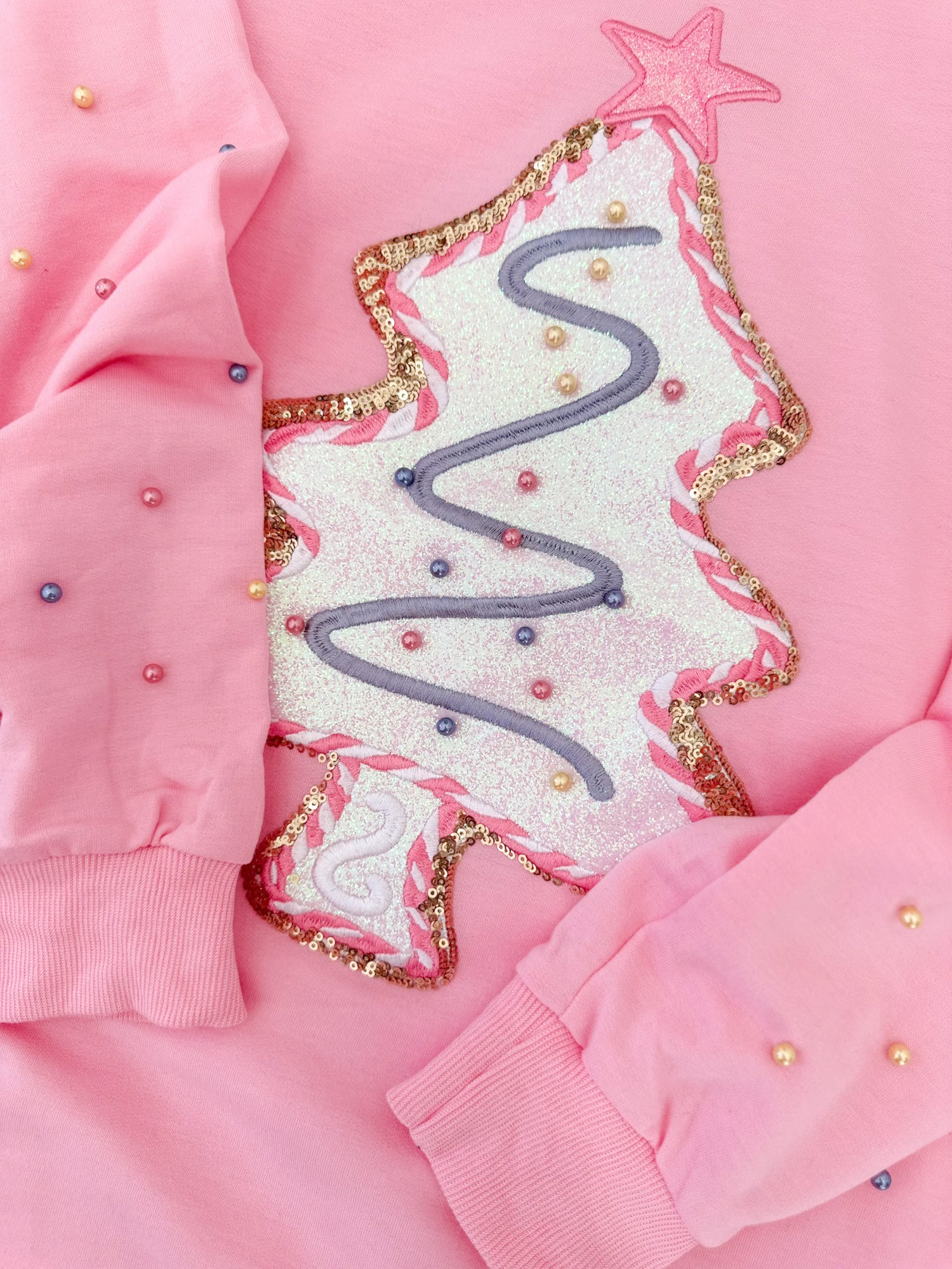 Sweet like sugarplums! This whimsical sweatshirt shines with an iridescent glittery appliqué trimmed in sequins, plus pearl-adorned sleeves for extra magic. Keep it casual with denim by day or slip into plaid lounge bottoms for movie-night cozy.