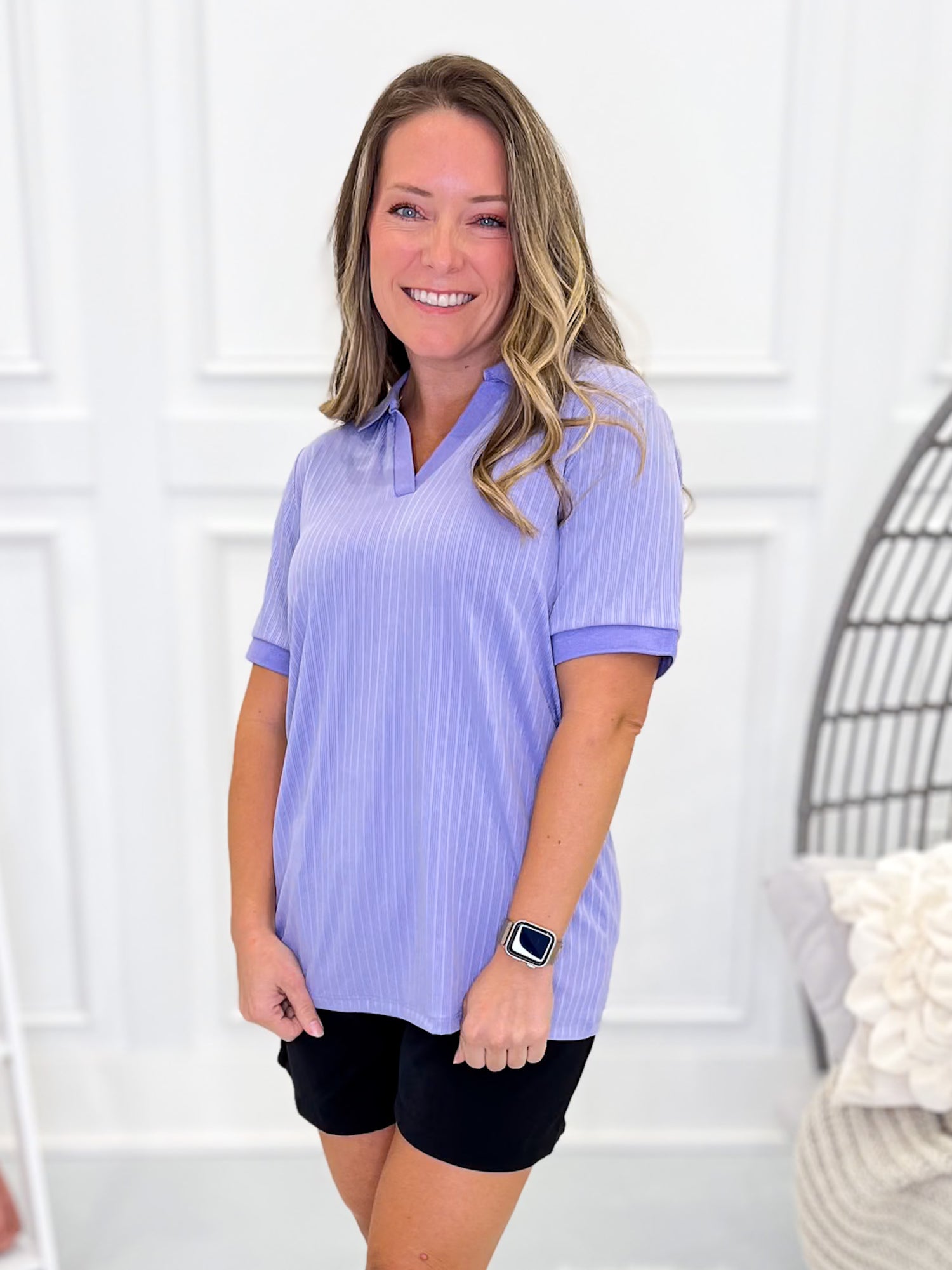 This isn’t your average polo—it’s your shortcut to looking pulled together without sacrificing comfort. The split collar adds a touch of polish, while the lightweight ribbed fabric keeps things breezy. Pair it with shorts for a sporty vibe or dress it up with wide-leg trousers and some slides. Either way, you're stepping out on the right foot.
