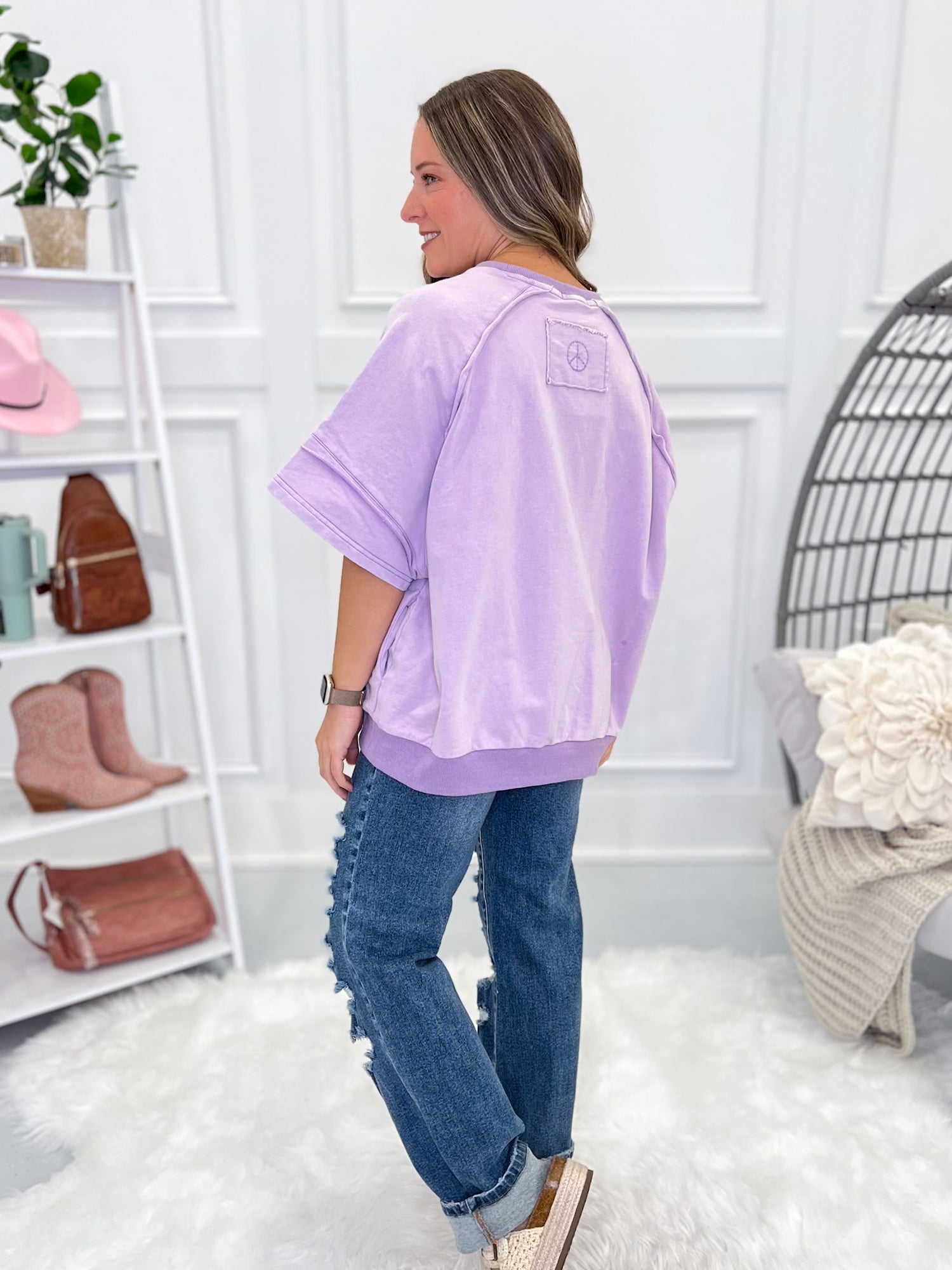 Laid back and effortlessly cool—this oversized sweatshirt gives you cozy comfort with a bold peace-loving statement. Try it with distressed denim and sneakers for that perfectly casual, little bit boho type of style!