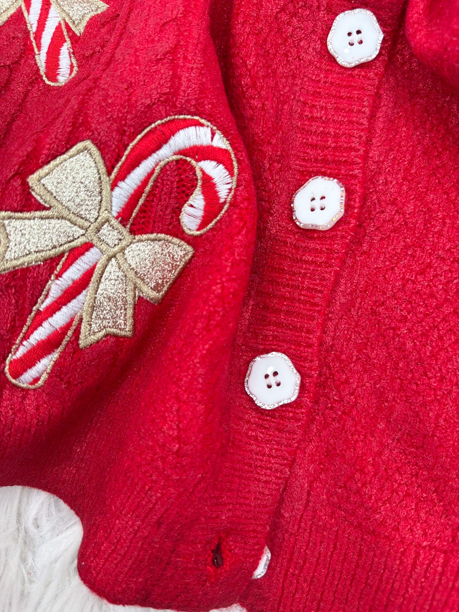 Add a little sparkle and a lot of holiday charm with the Peppermint Pop vest. The subtle metallic foiled cable knit catches the light just right, while sparkly candy cane embellishments and shimmer-trimmed buttons make it oh-so-sweet. Cozy up with jeans or plaid shorts for that timeless, playful look.