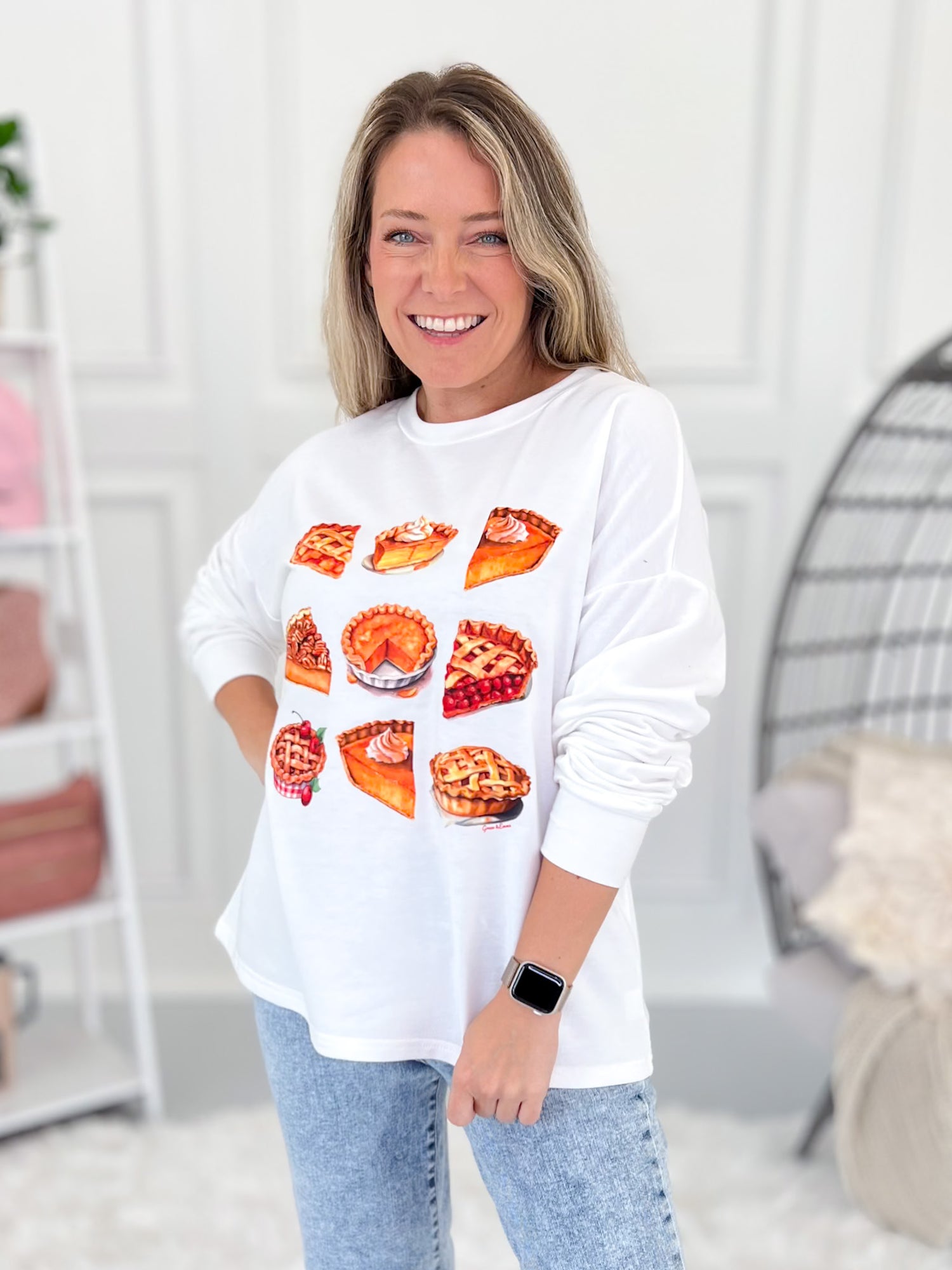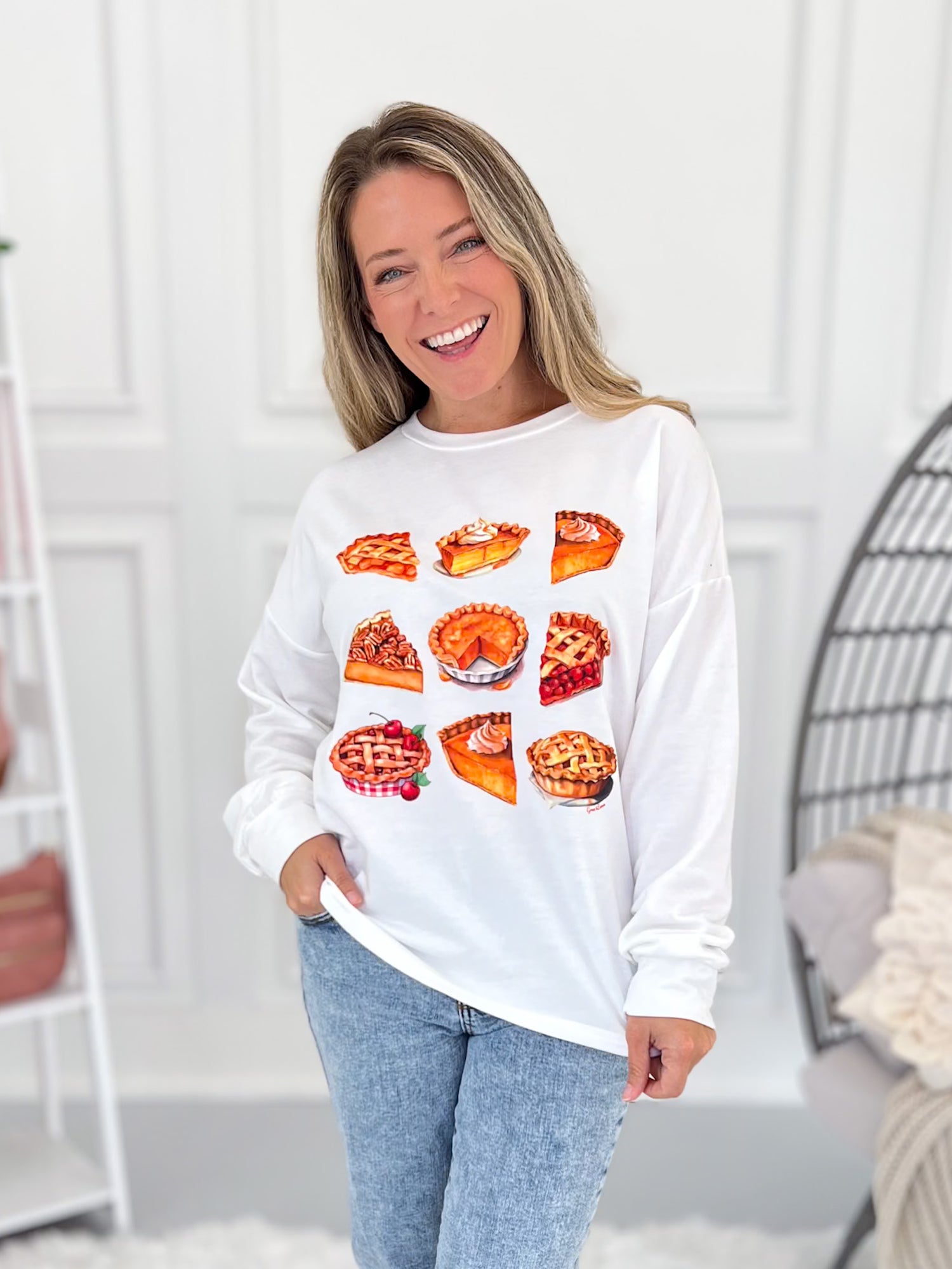 Fall vibes never looked so sweet! This long sleeve top is soft, stretchy, and lightweight with the cutest pie graphic that’s perfect for Thanksgiving, Friendsgiving, or just showing your love for dessert. Style it solo with denim or layer it under a plaid flannel for that ultimate fall mood.
