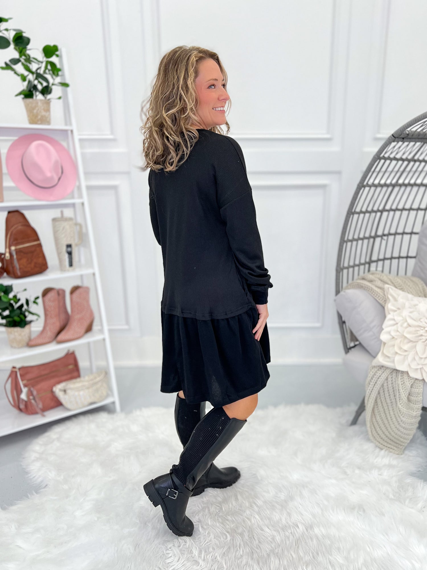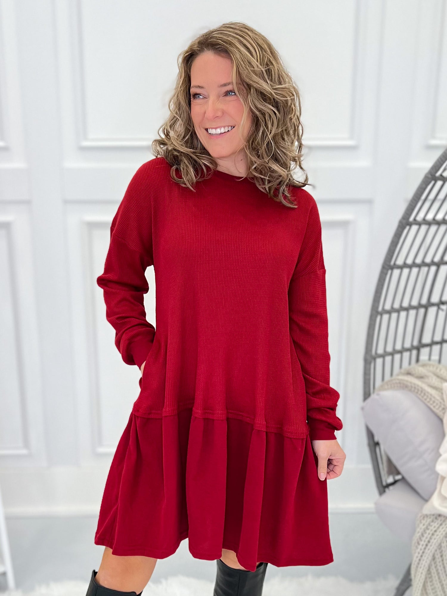 The comfy dress you’ll reach for again and again! With a soft thermal knit top and washed cotton ruffle hem, this flowy favorite is as easy to wear as it is to style. Pair it with boots and a jacket for a cozy look or sneakers for everyday casual vibes.