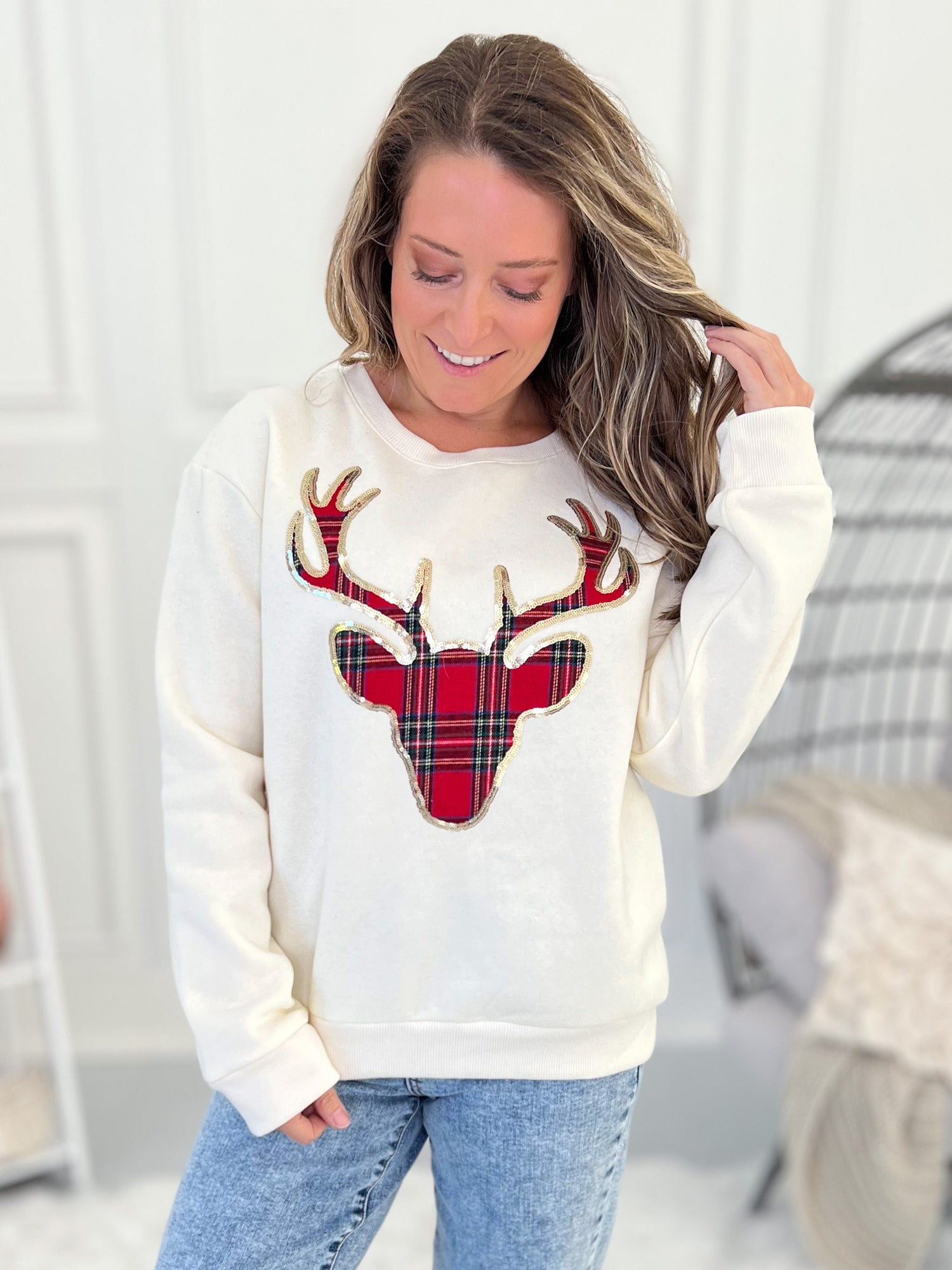 Cozy meets festive in this soft sweatshirt featuring a classic plaid reindeer design with gold sequin trim. It’s the perfect mix of comfy and cheerful for holiday gatherings, errands, or lounging fireside. Pair it with jeans or joggers for a look that’s merry, bright, and effortlessly cute.