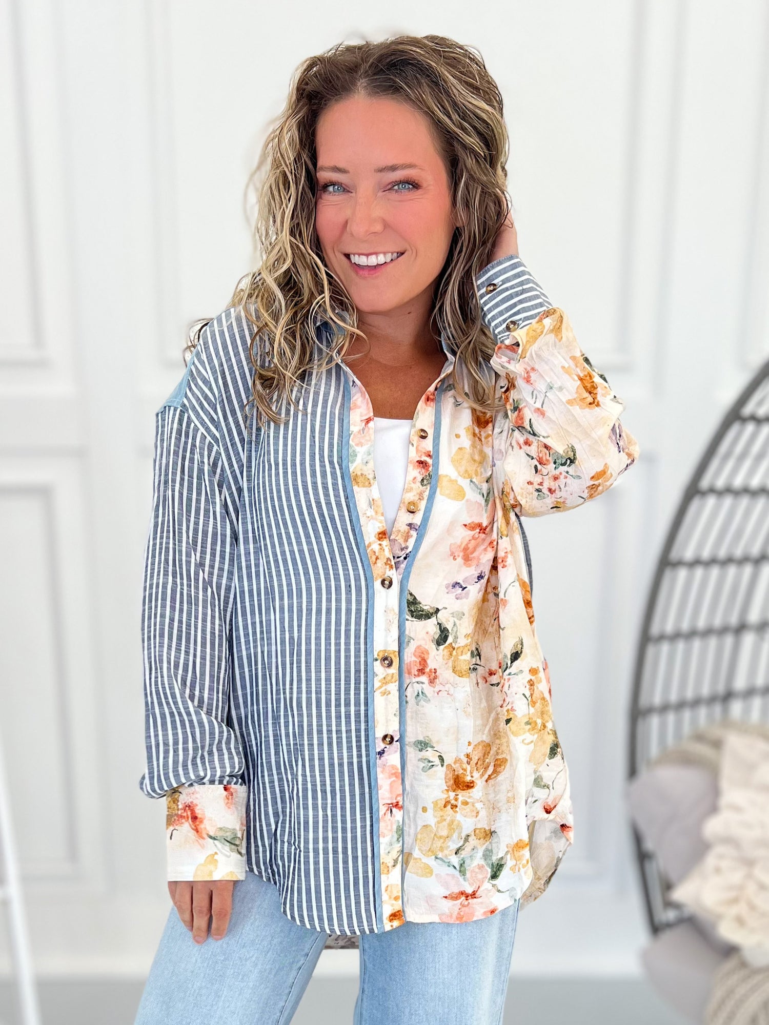 A gorgeous mix of stripes and florals gives this button up a playful yet timeless vibe. Lightweight and airy, it’s easy to wear year round—pair the golden rust tones with fall denim or highlight the soft blues for spring. Style it open over a tank, front tucked, or tied for that effortless boutique look.