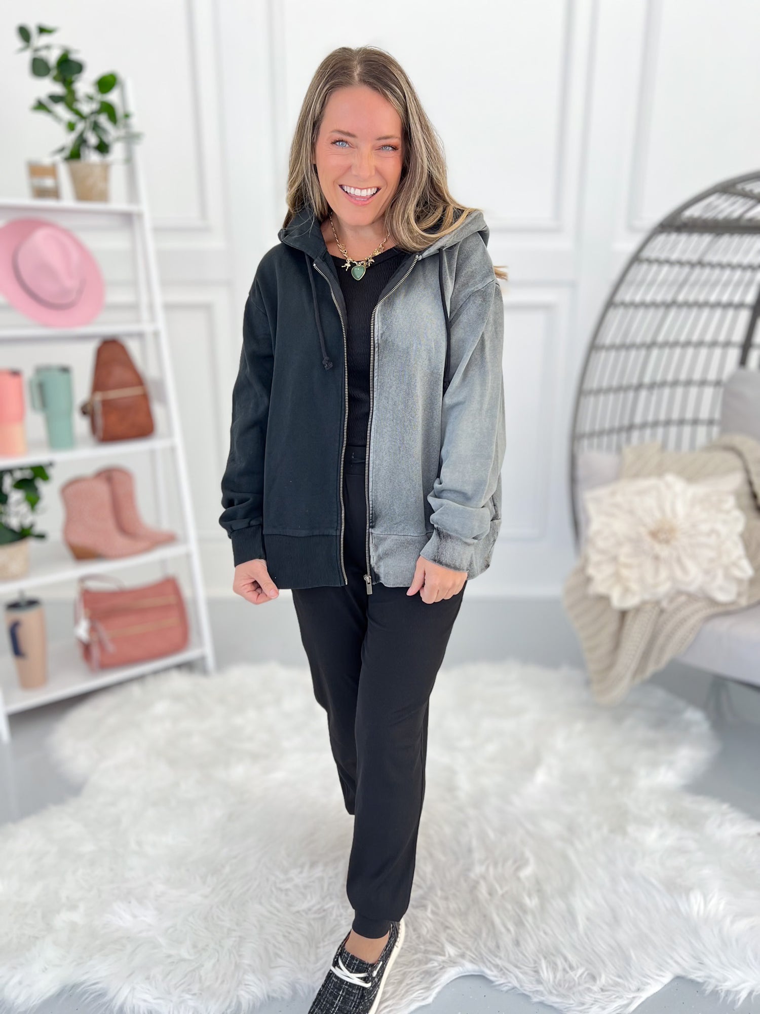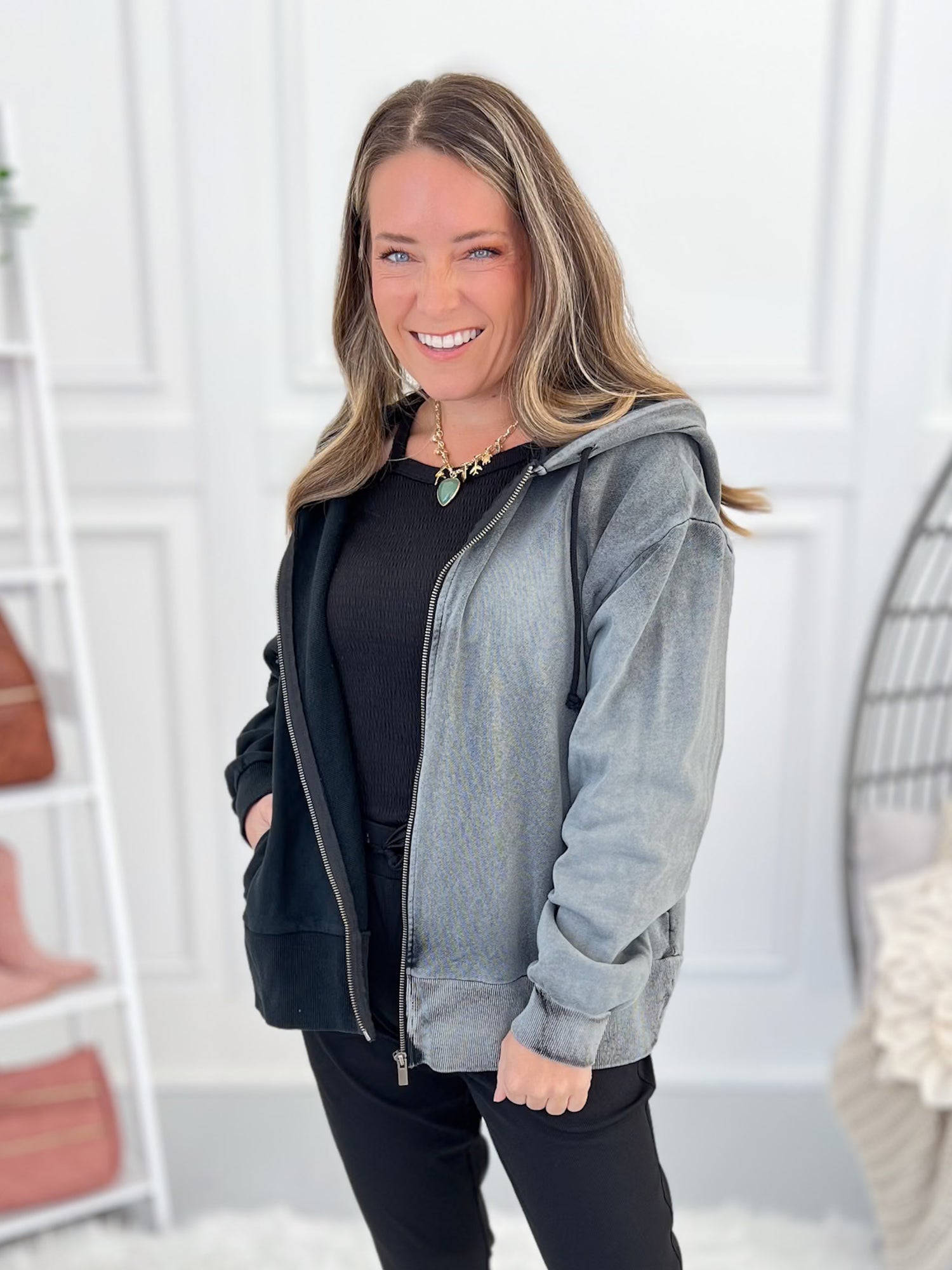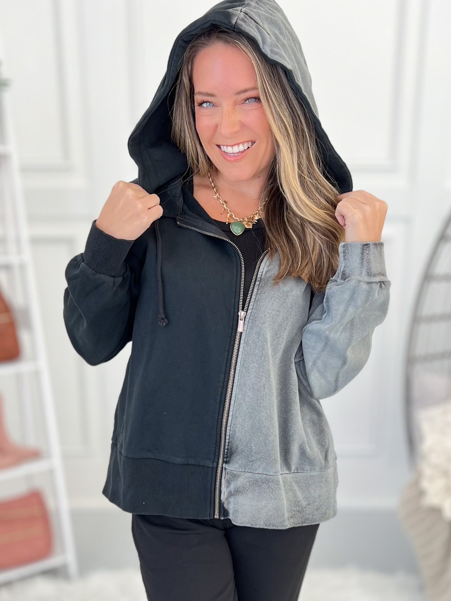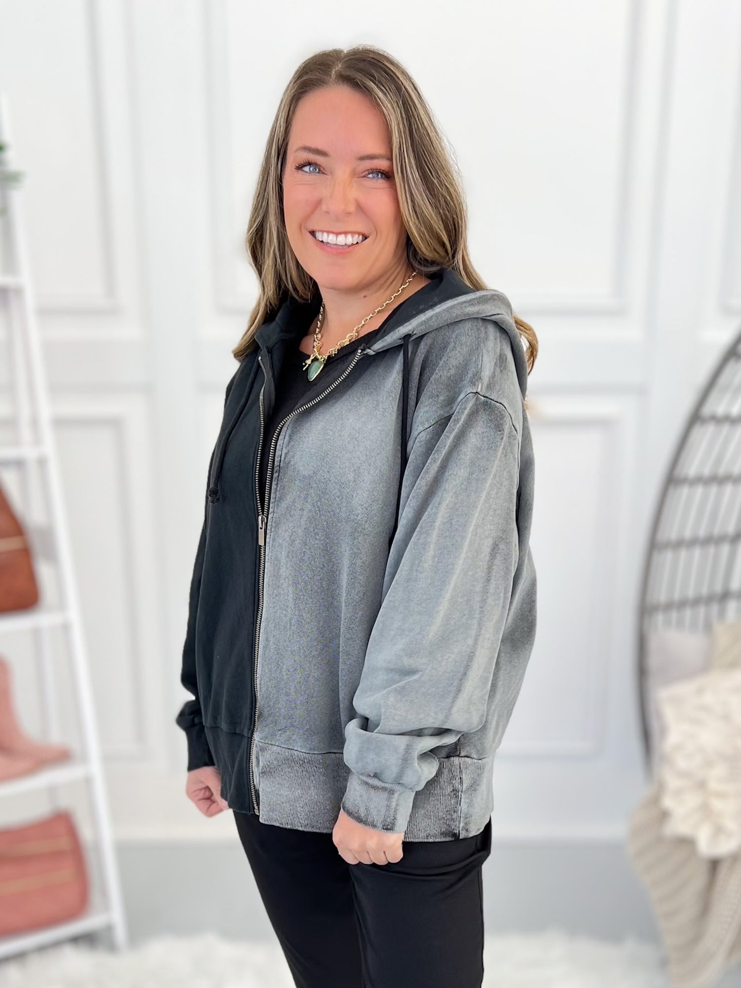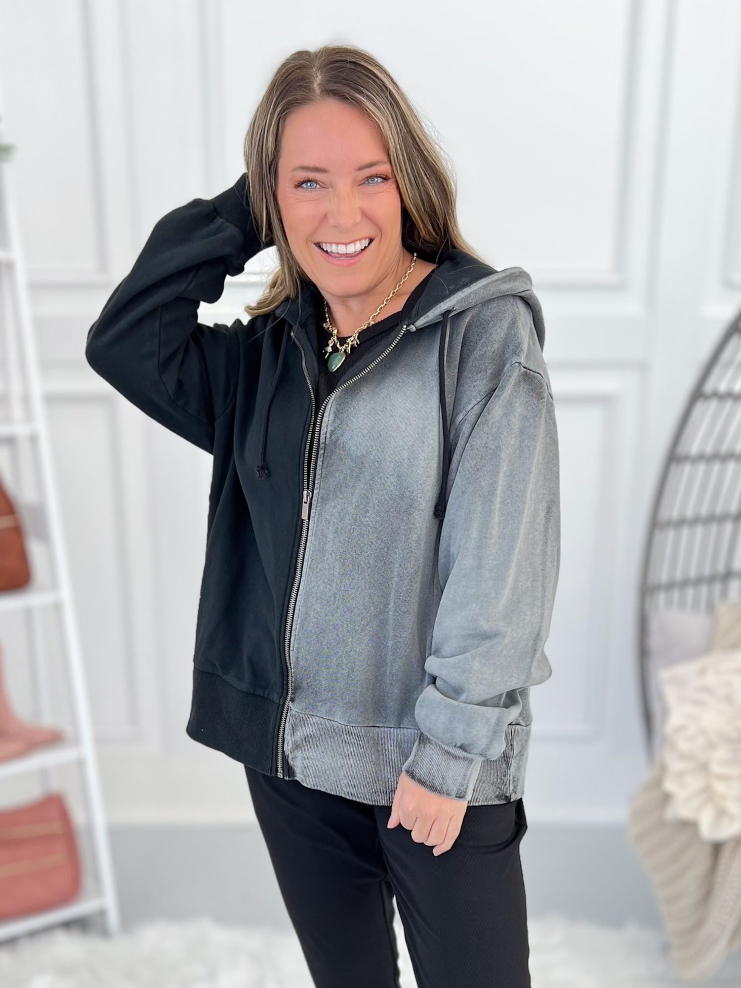 Edgy look that with neutral colors that can be layered for any casual day! Pair with black or grey denim, leggings, joggers or athletic wear. It mixes and matches with other colors, patterns or even a fun graphic tee with ease.