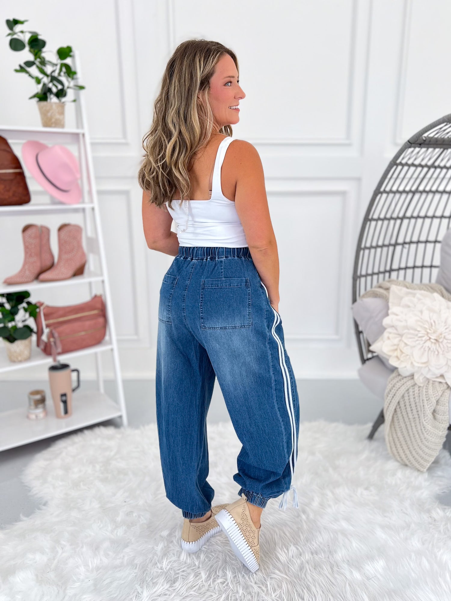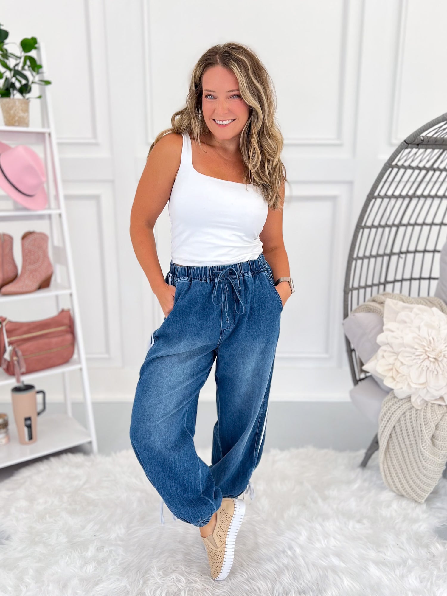 These jogger-style chambray pants are a comfy dream you’ll want on repeat. Lightweight, butter-soft, and easy to move in, they’re perfect for everything from lounging to running errands. Style with sneakers and a tee for a sporty vibe or dress them up with a cropped sweater and platforms