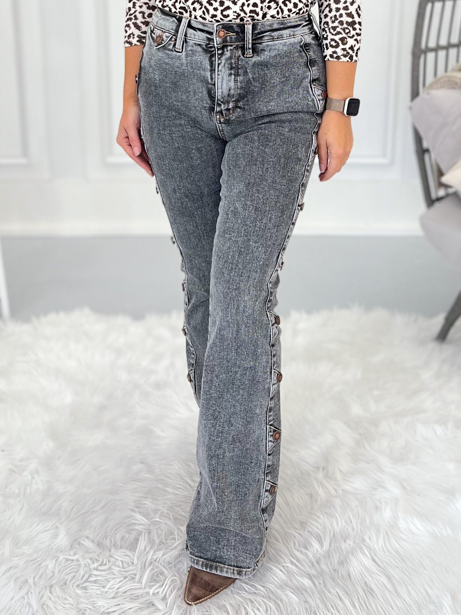 Western charm meets modern style in these Judy Blue bootcut jeans. Designed with a subtle grey vintage wash, high-contrast grain, and side seam button details, they strike the perfect balance of chic and country cool. The tummy control panel smooths, while the soft, stretchy denim keeps you comfortable all day long. Finished with a flattering bootcut leg, dart back detail, and a polished hem, these jeans are a true standout.
