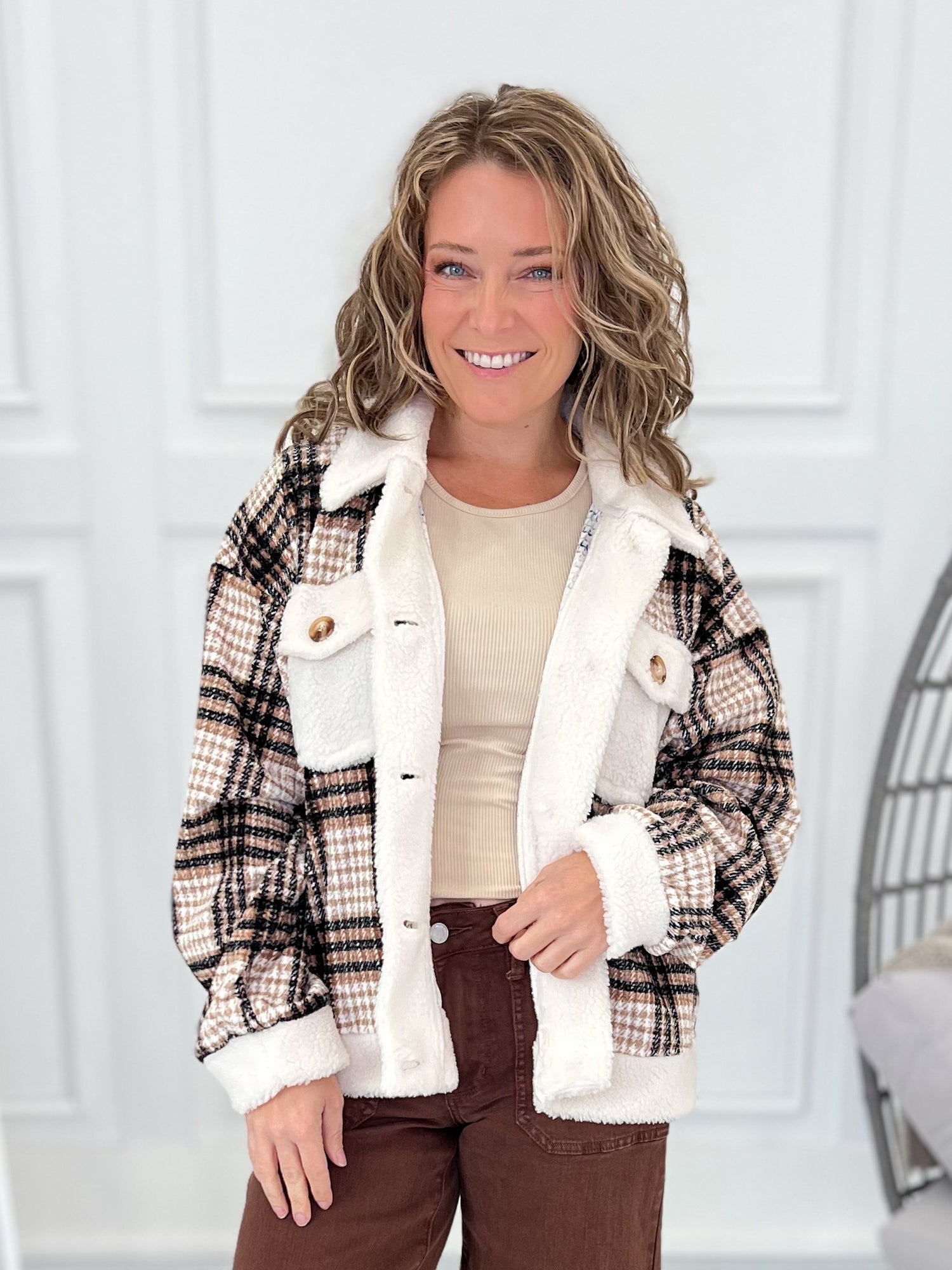 This cozy plaid shacket is all about comfort and charm. The inside feels as soft as your favorite sweatshirt, while the sherpa trim adds that extra touch of warmth and style. Perfect for layering over tees or sweaters, it’s an easy favorite for chilly days.