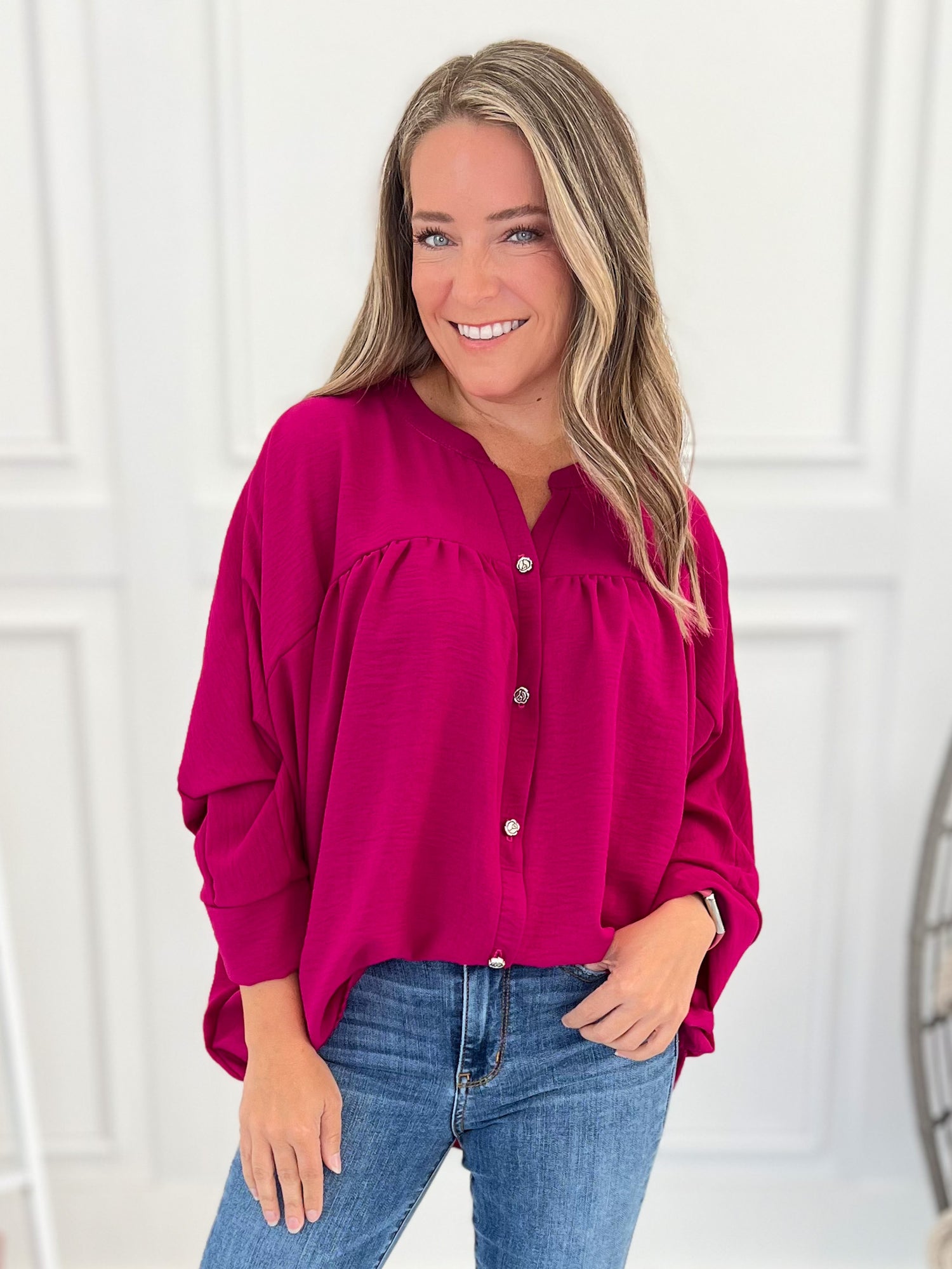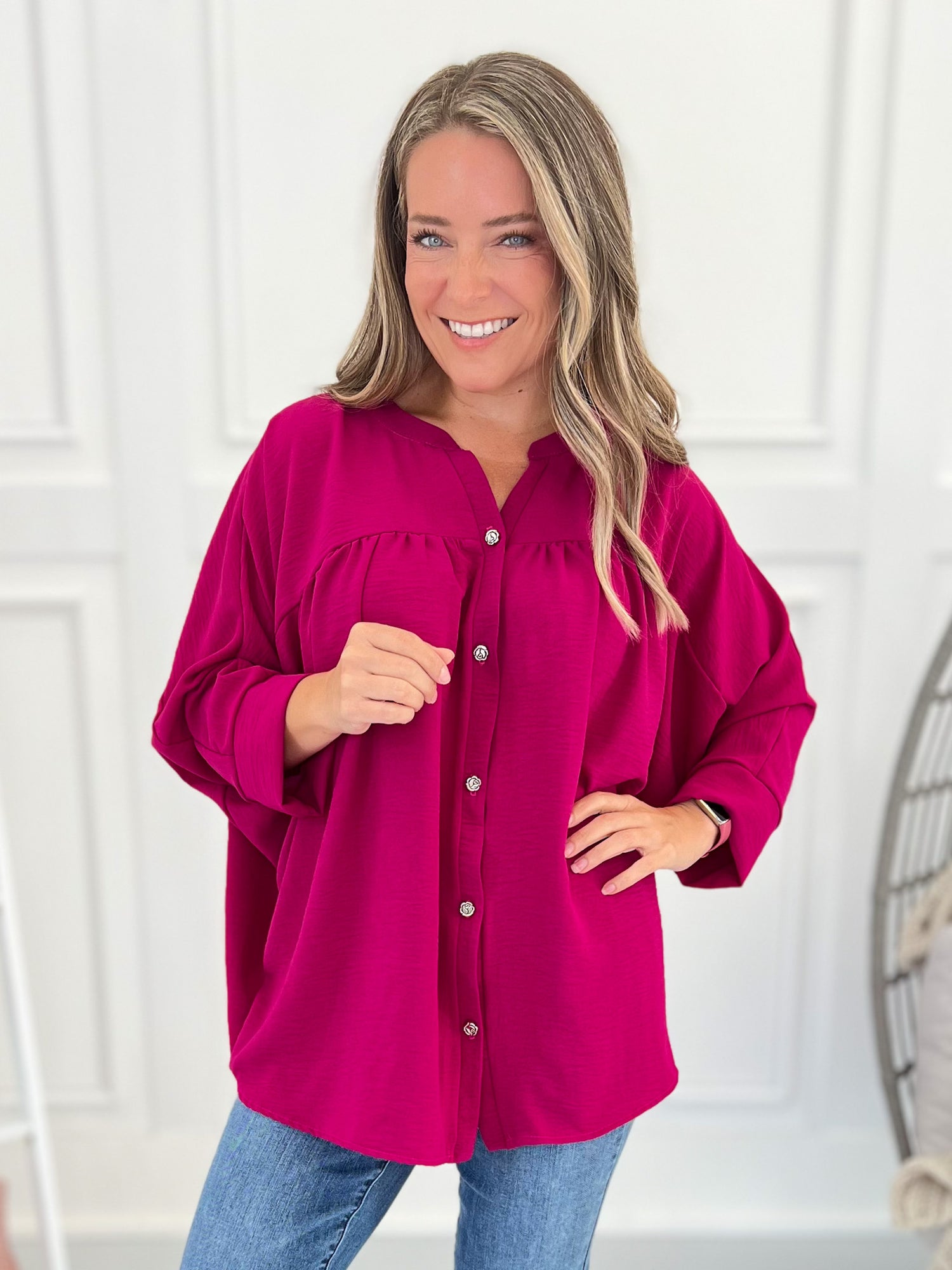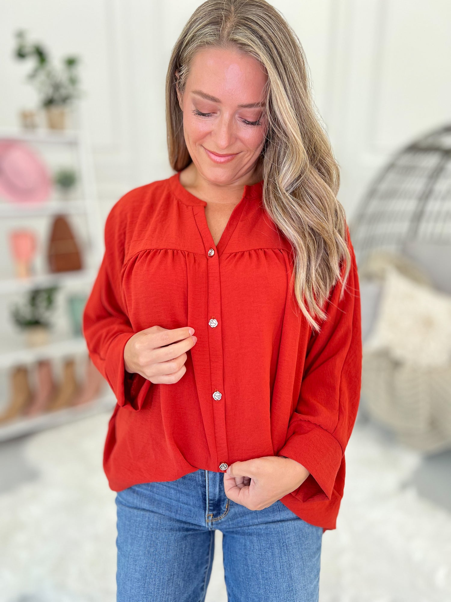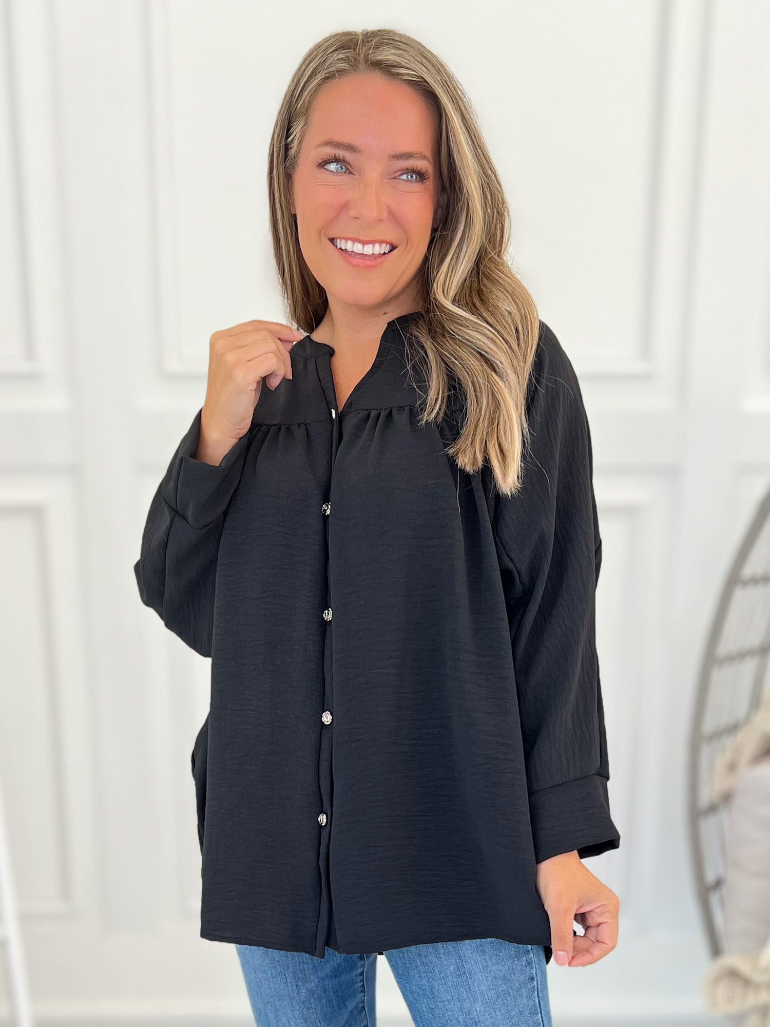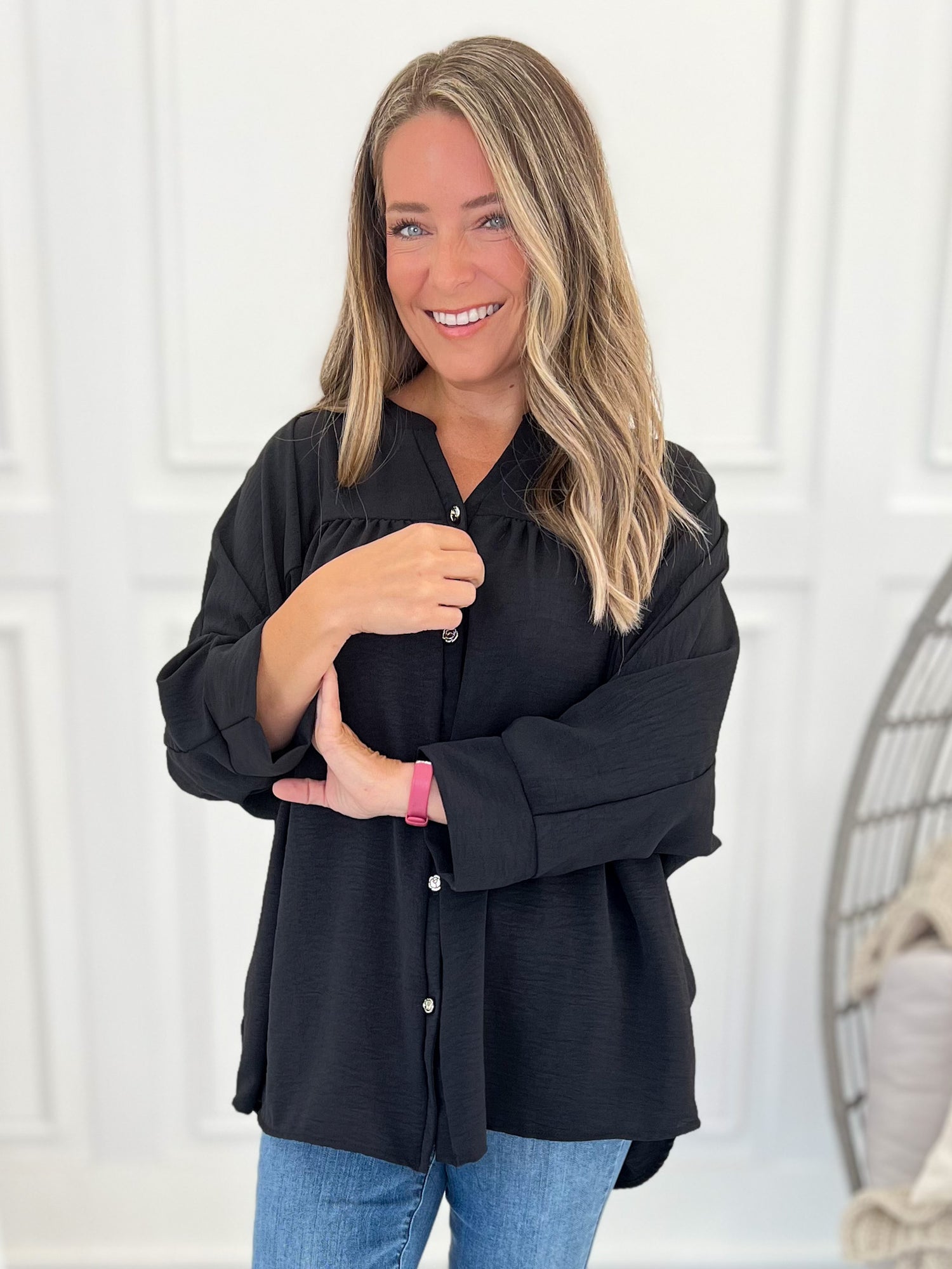 This is a great blouse for work or play! With the gathering shoulder and back details, it gives a loose and trendy drape for an effortlessly chic vibe. The rose shaped buttons add a feminine touch that we love! Pair with denim or dress pants - you'll be able to get so much wear out of this one!