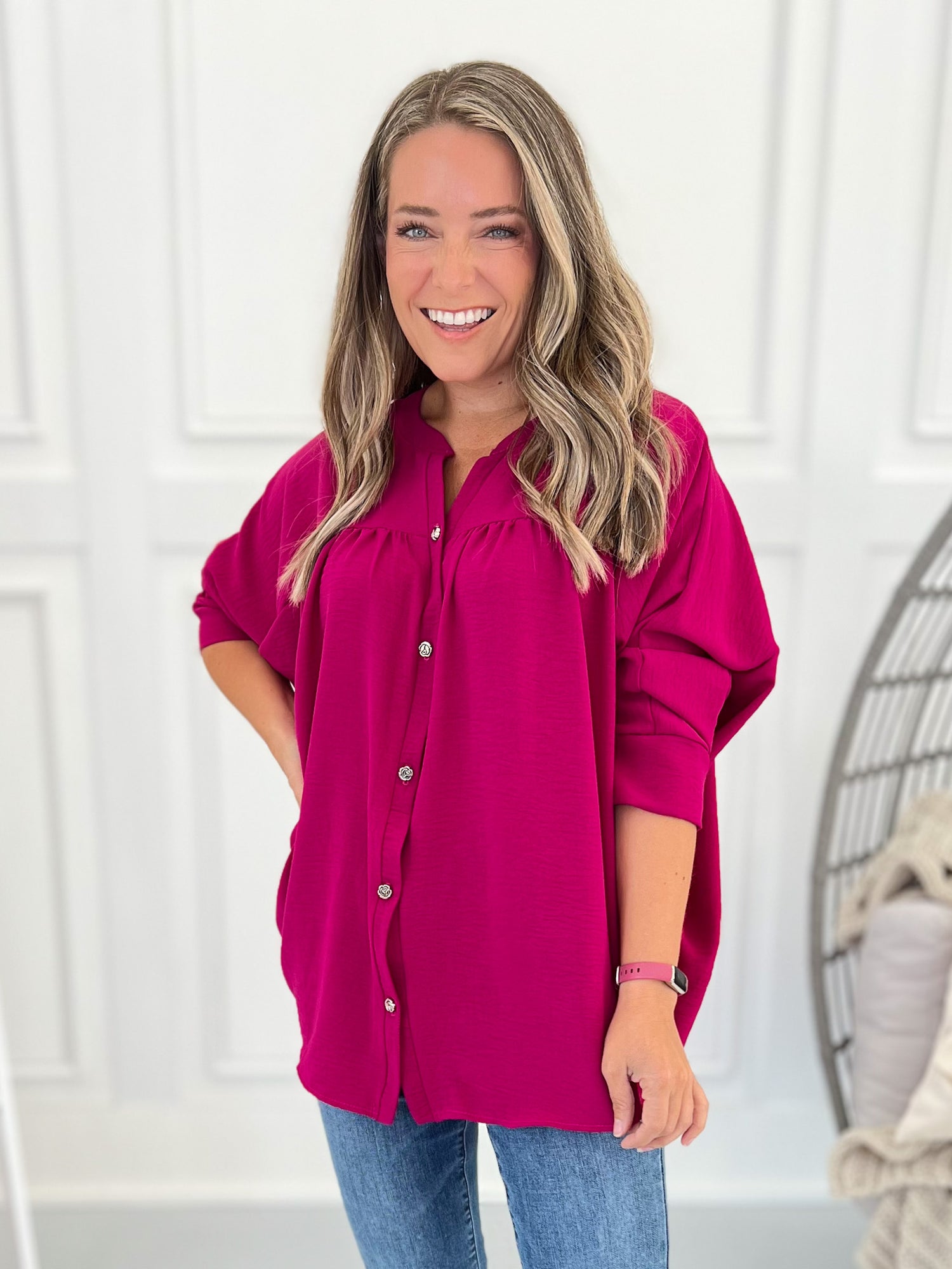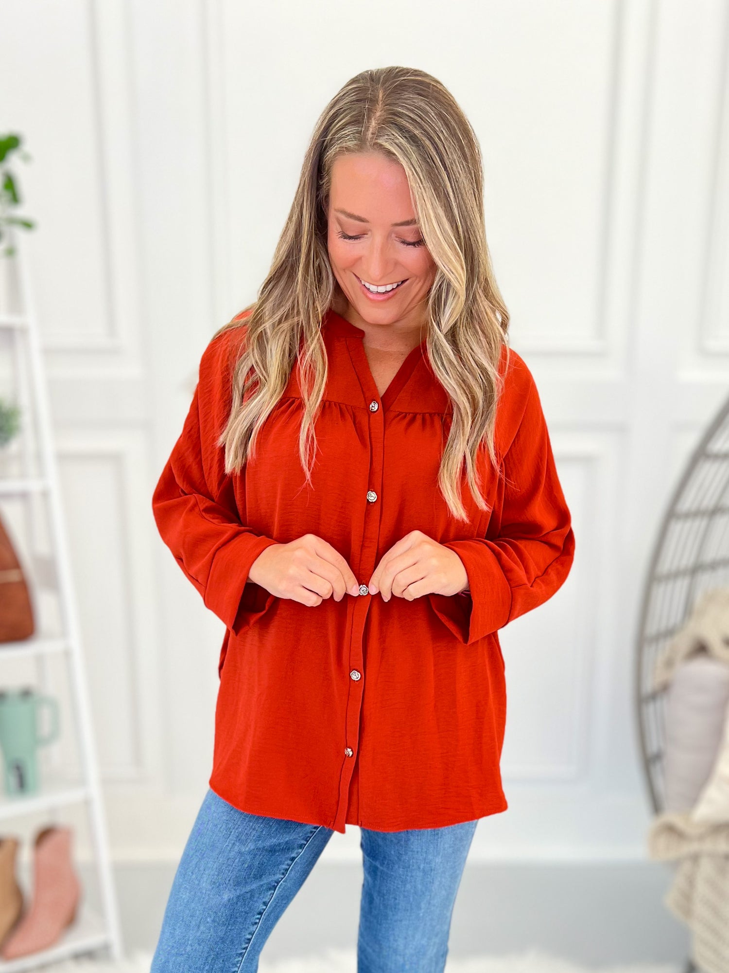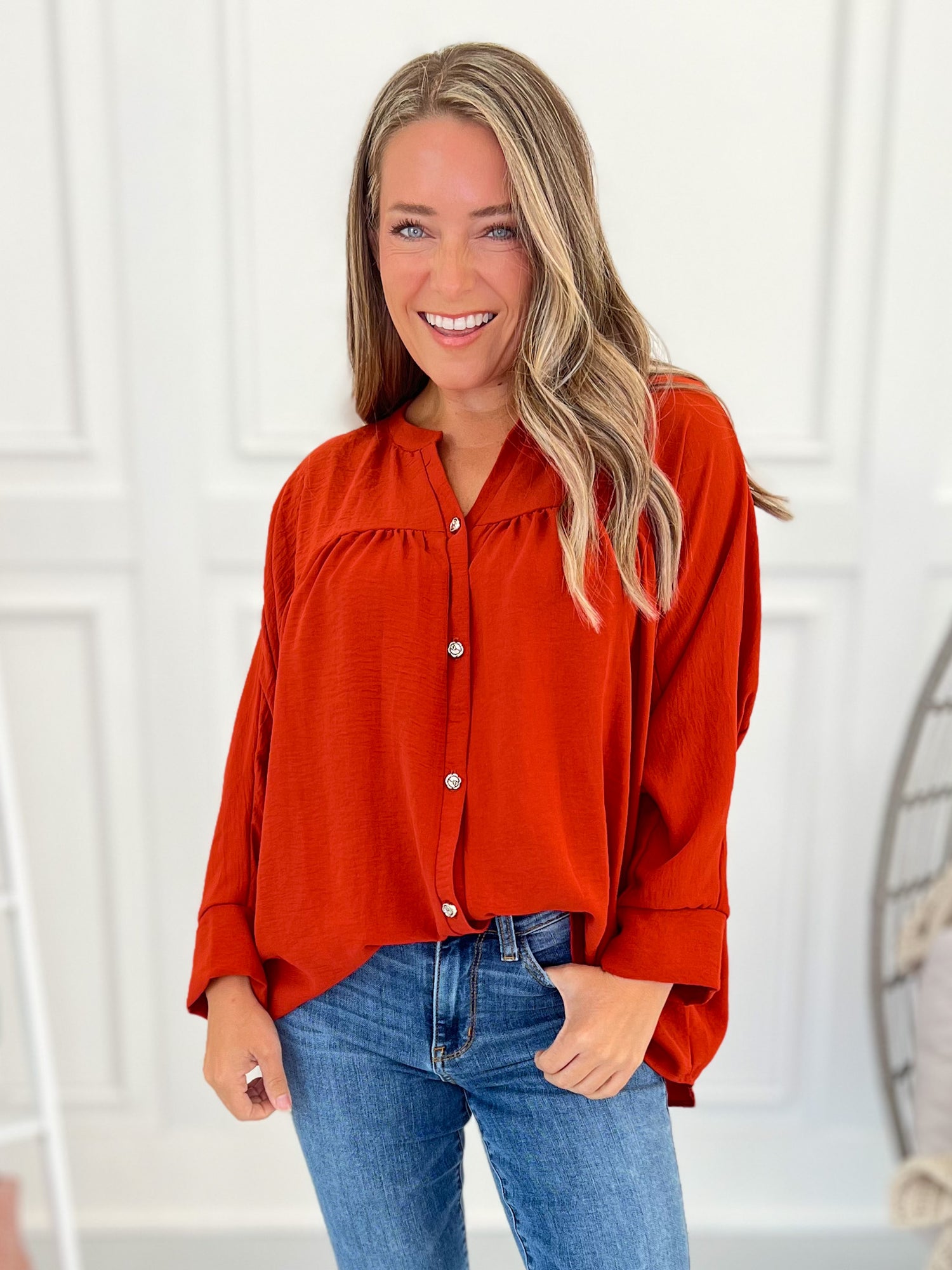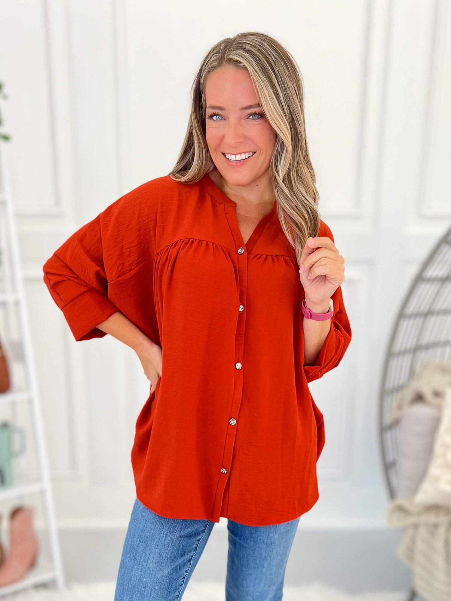 This is a great blouse for work or play! With the gathering shoulder and back details, it gives a loose and trendy drape for an effortlessly chic vibe. The rose shaped buttons add a feminine touch that we love! Pair with denim or dress pants - you'll be able to get so much wear out of this one!