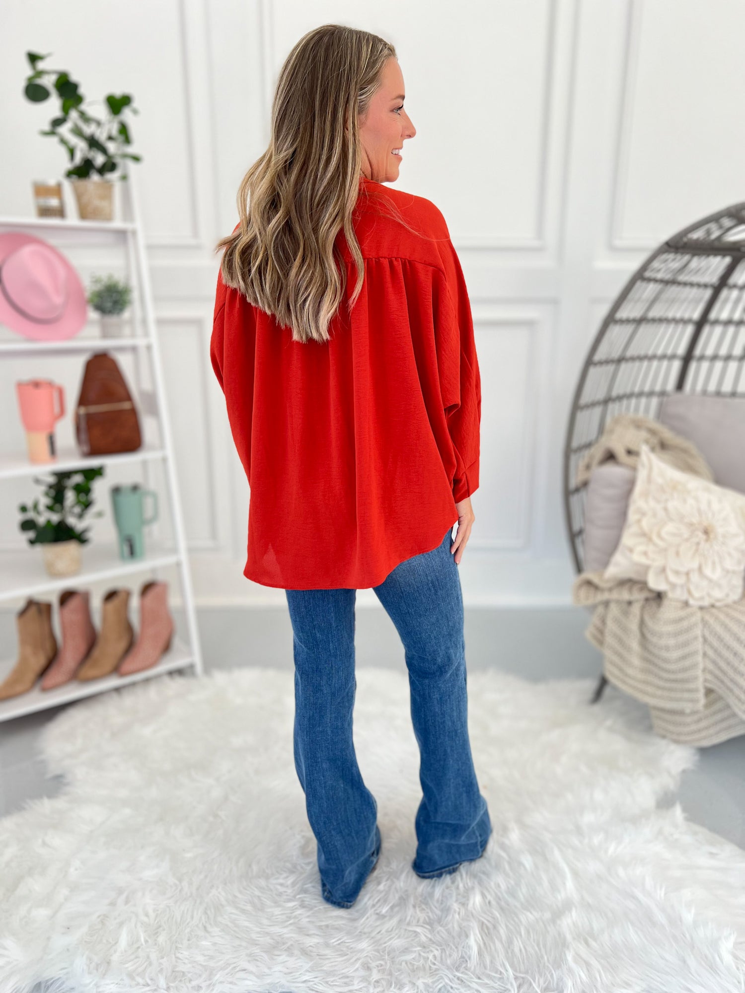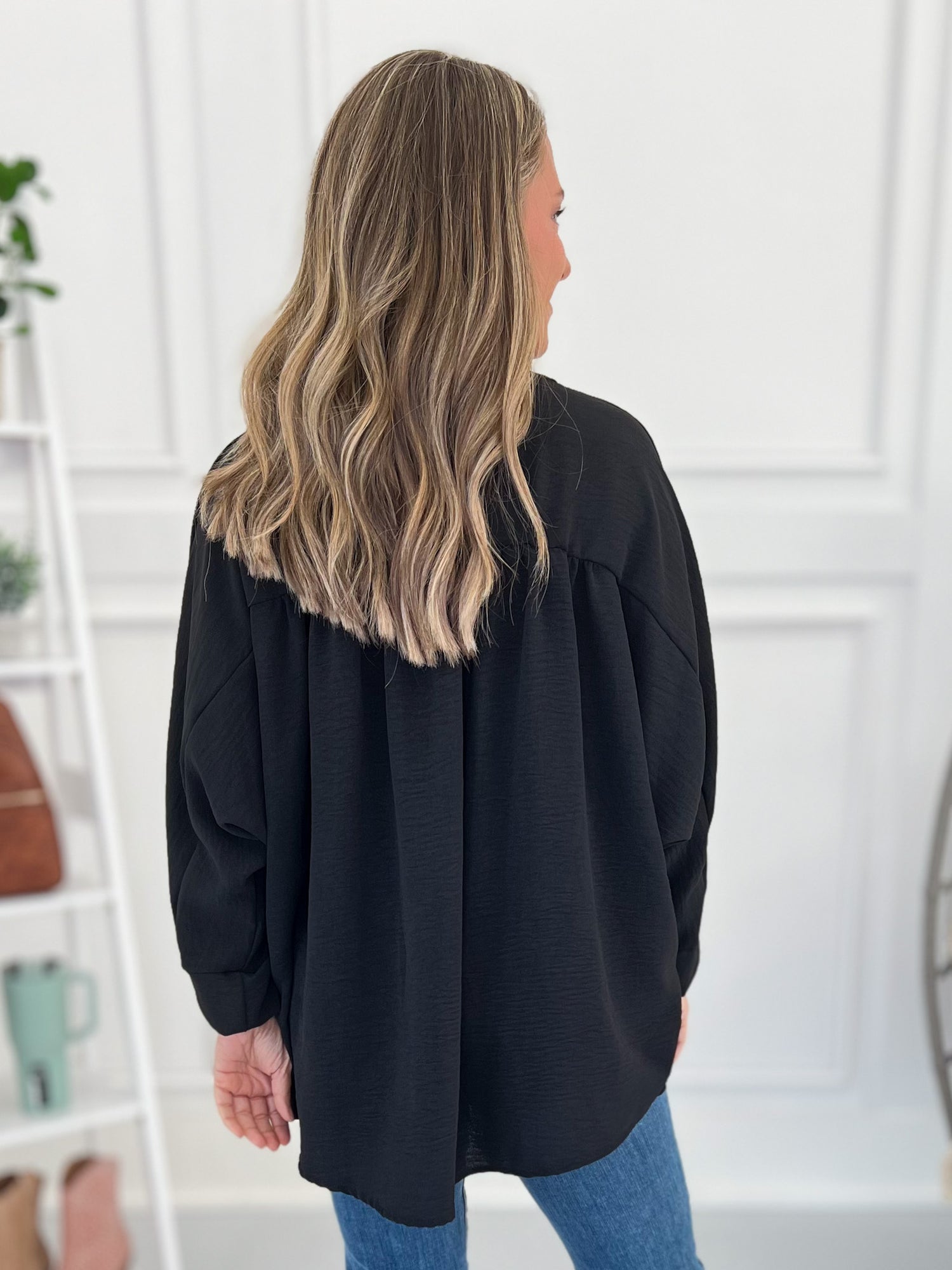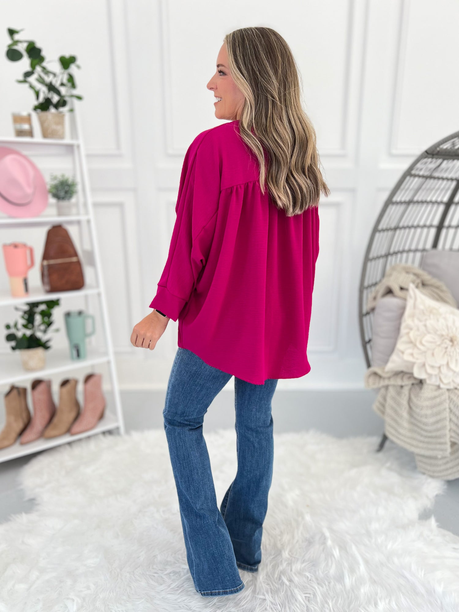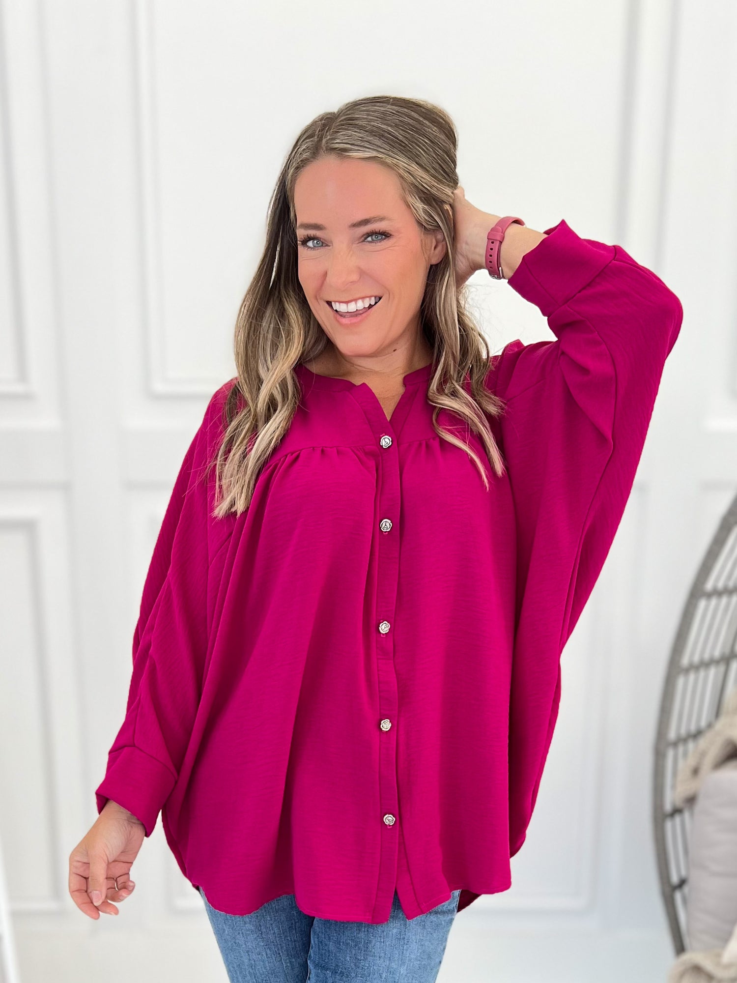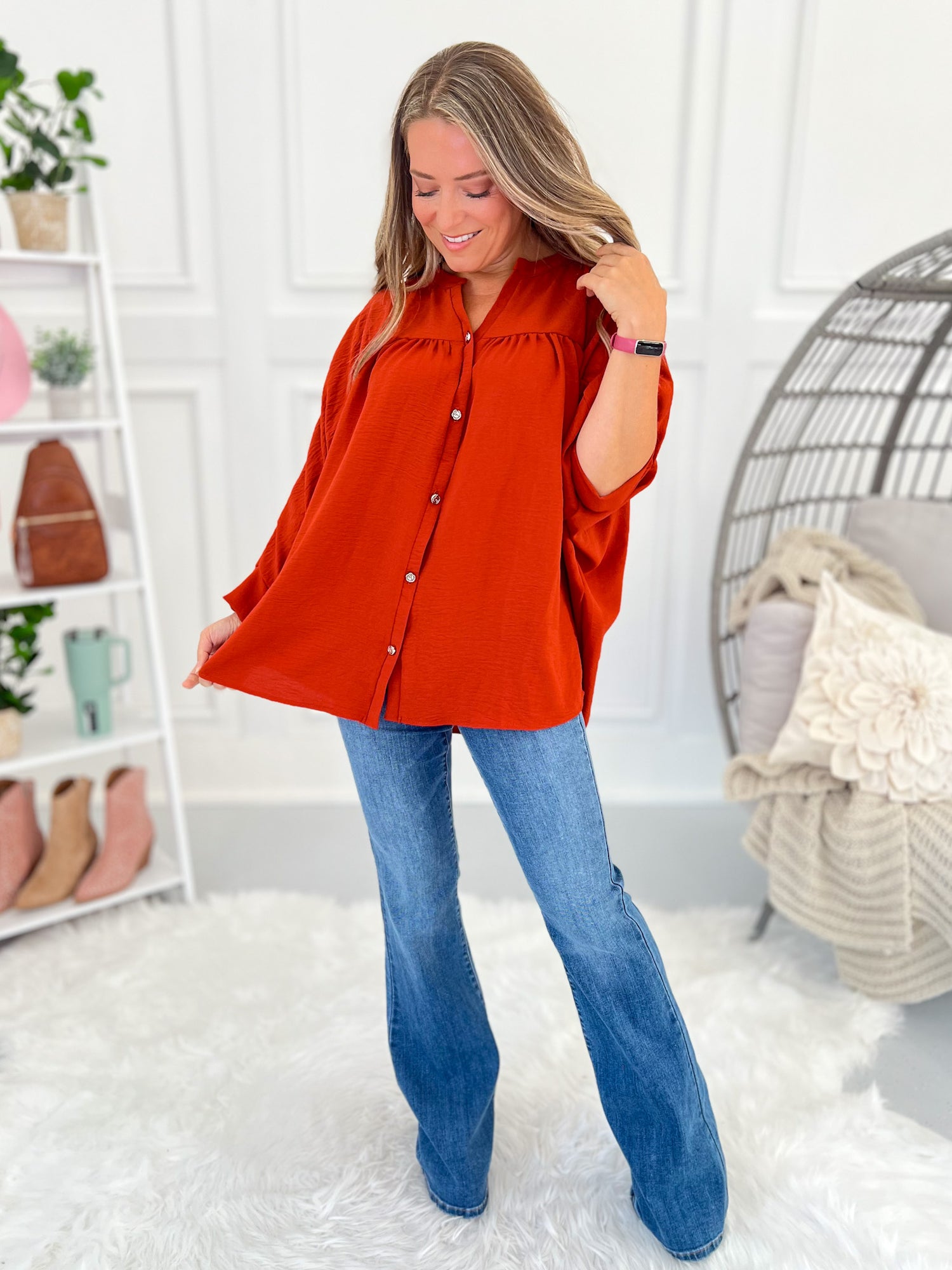 This is a great blouse for work or play! With the gathering shoulder and back details, it gives a loose and trendy drape for an effortlessly chic vibe. The rose shaped buttons add a feminine touch that we love! Pair with denim or dress pants - you'll be able to get so much wear out of this one!