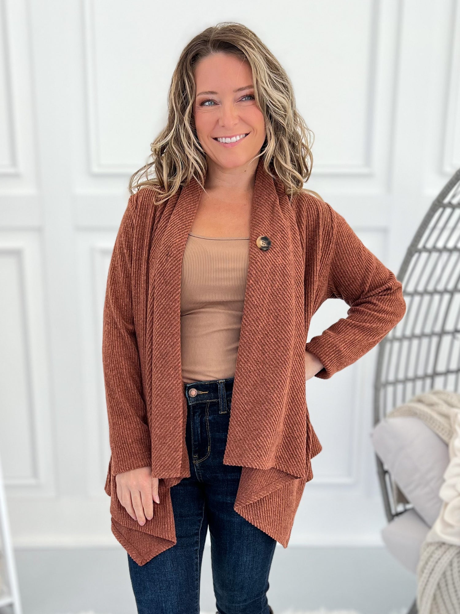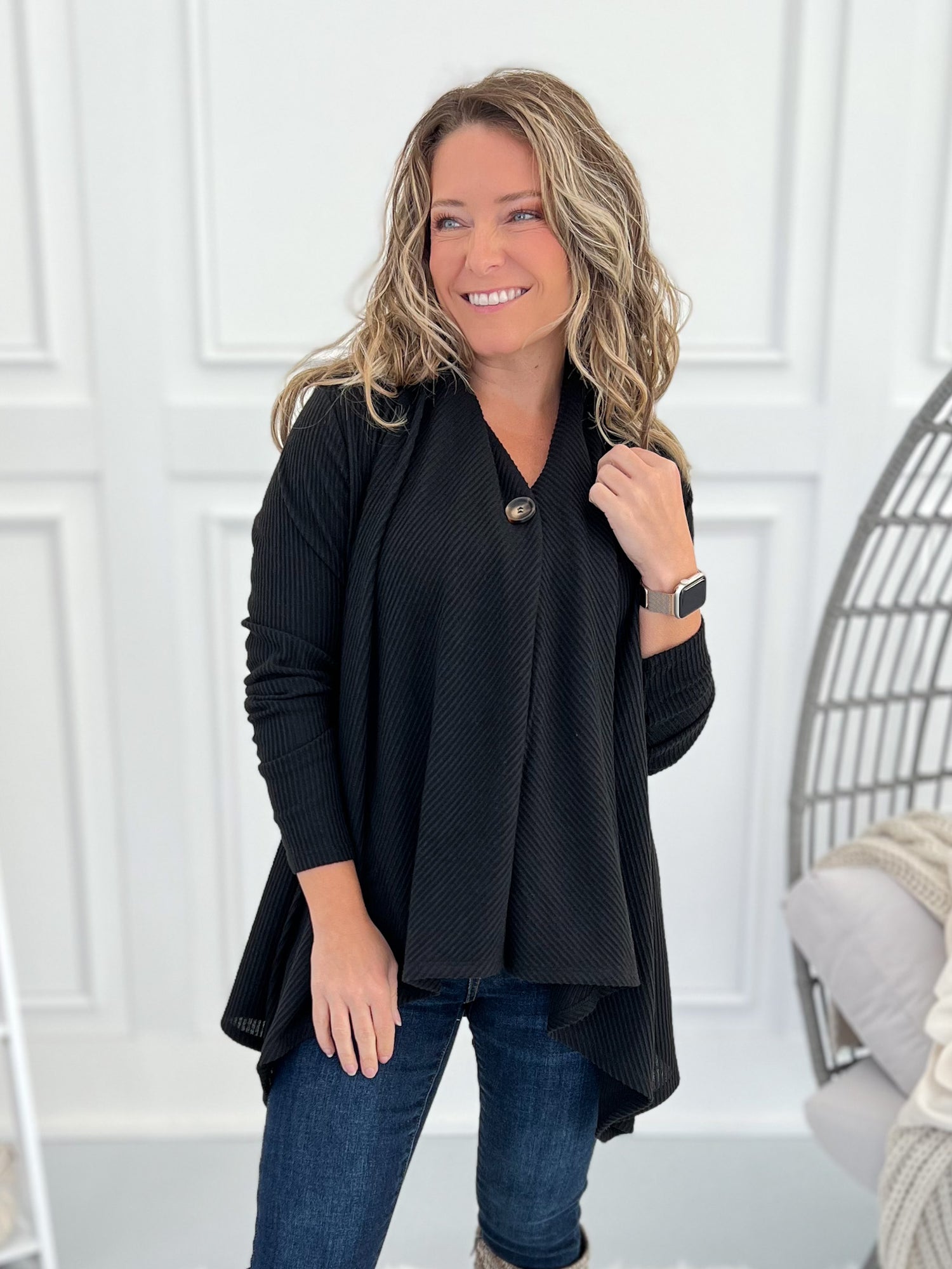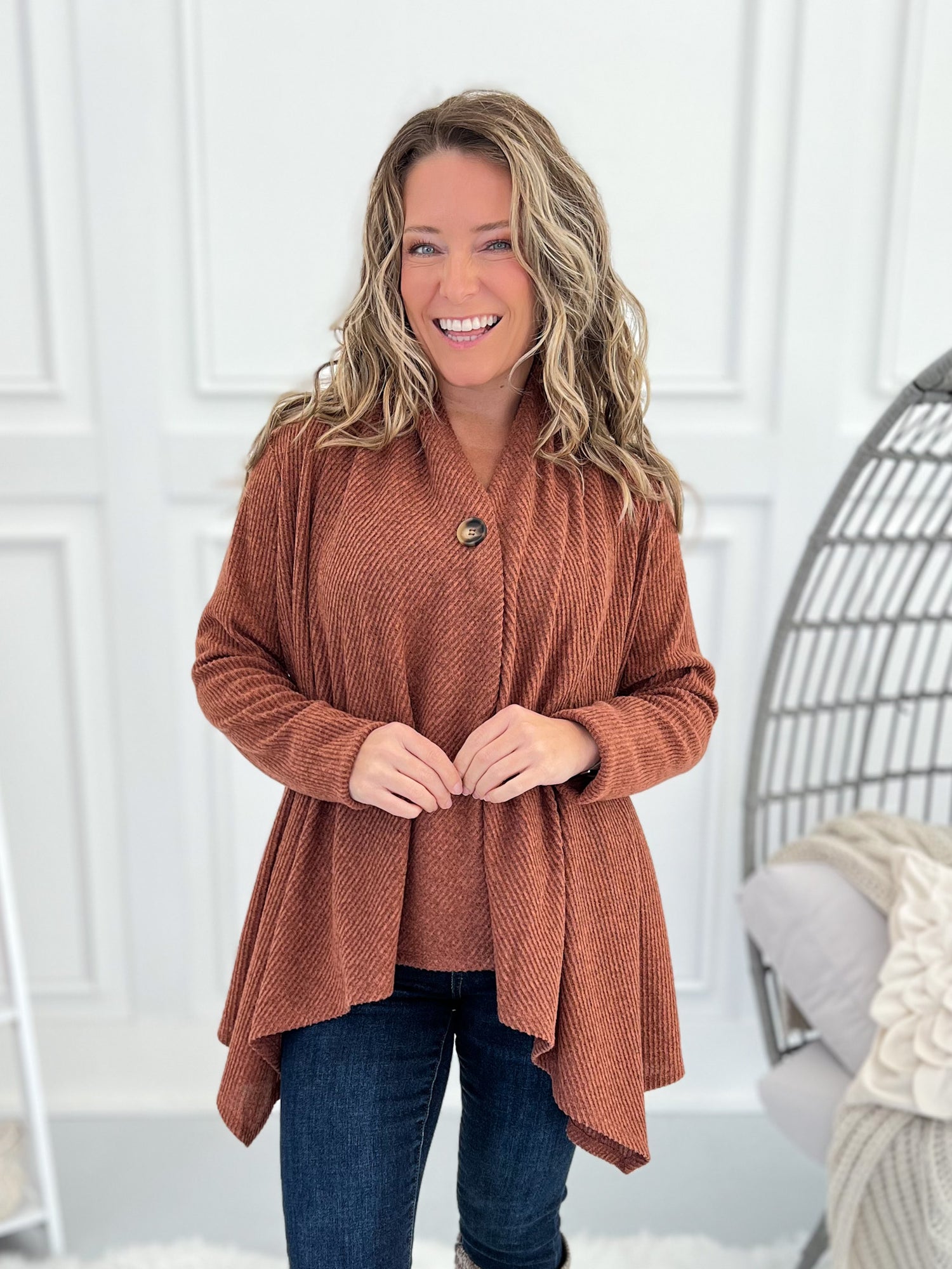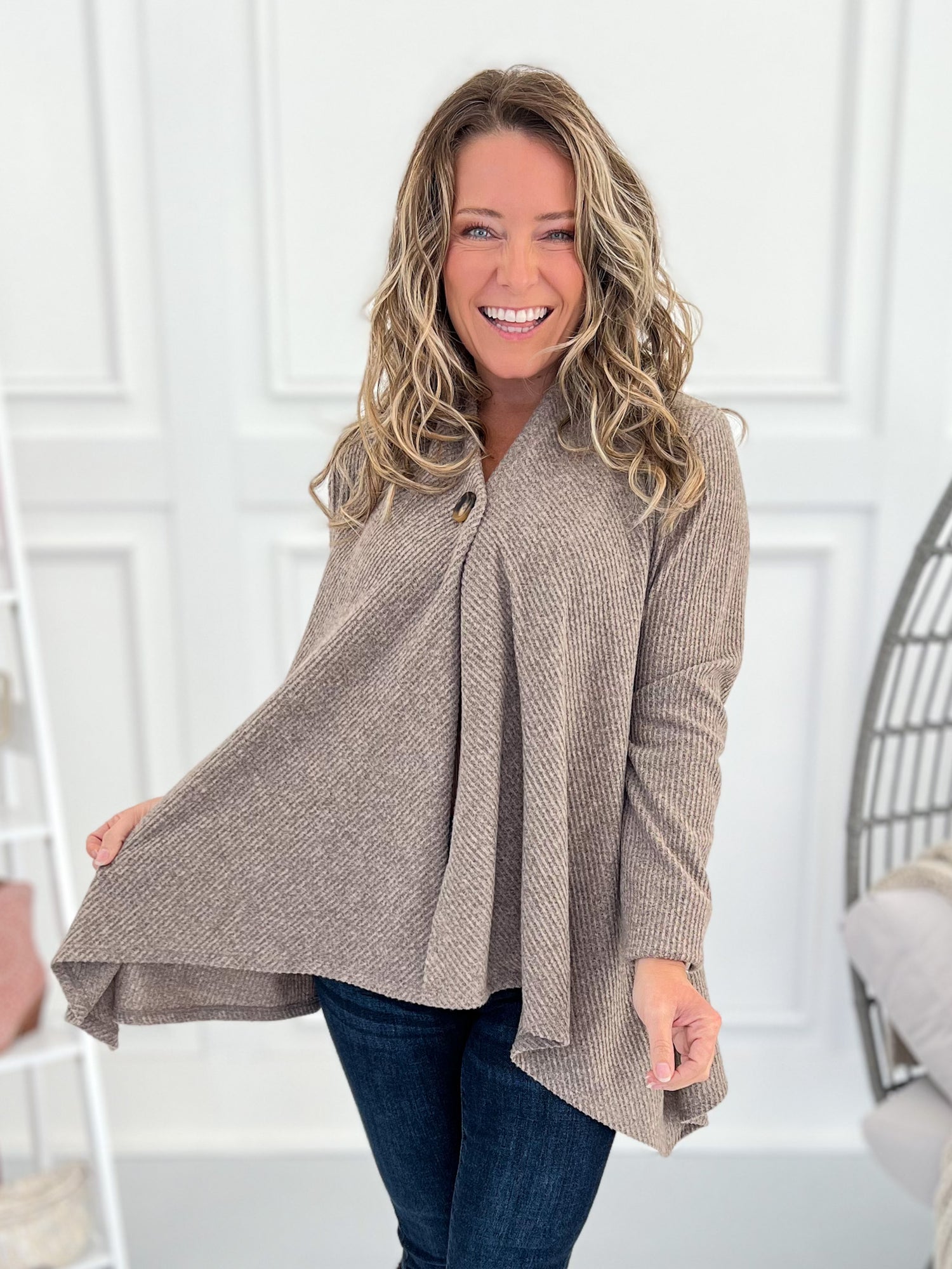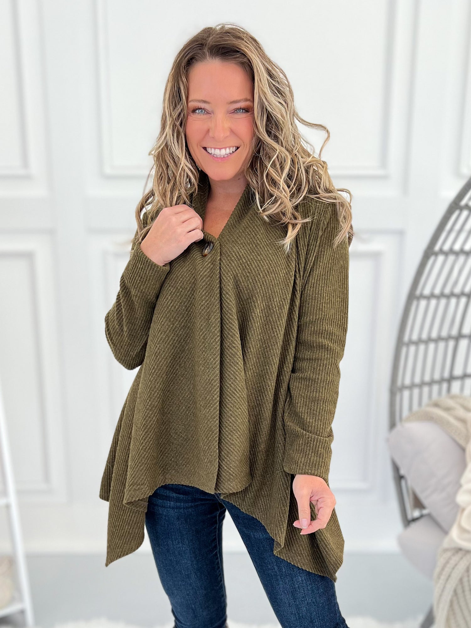 This one’s got options, babe. Wear it buttoned for a flattering swing tunic look or open for a chic, cascade drape cardigan vibe. The brushed ribbed knit is soft, stretchy, and lightweight—perfect for layering all season long with jeans, leggings, or trousers.