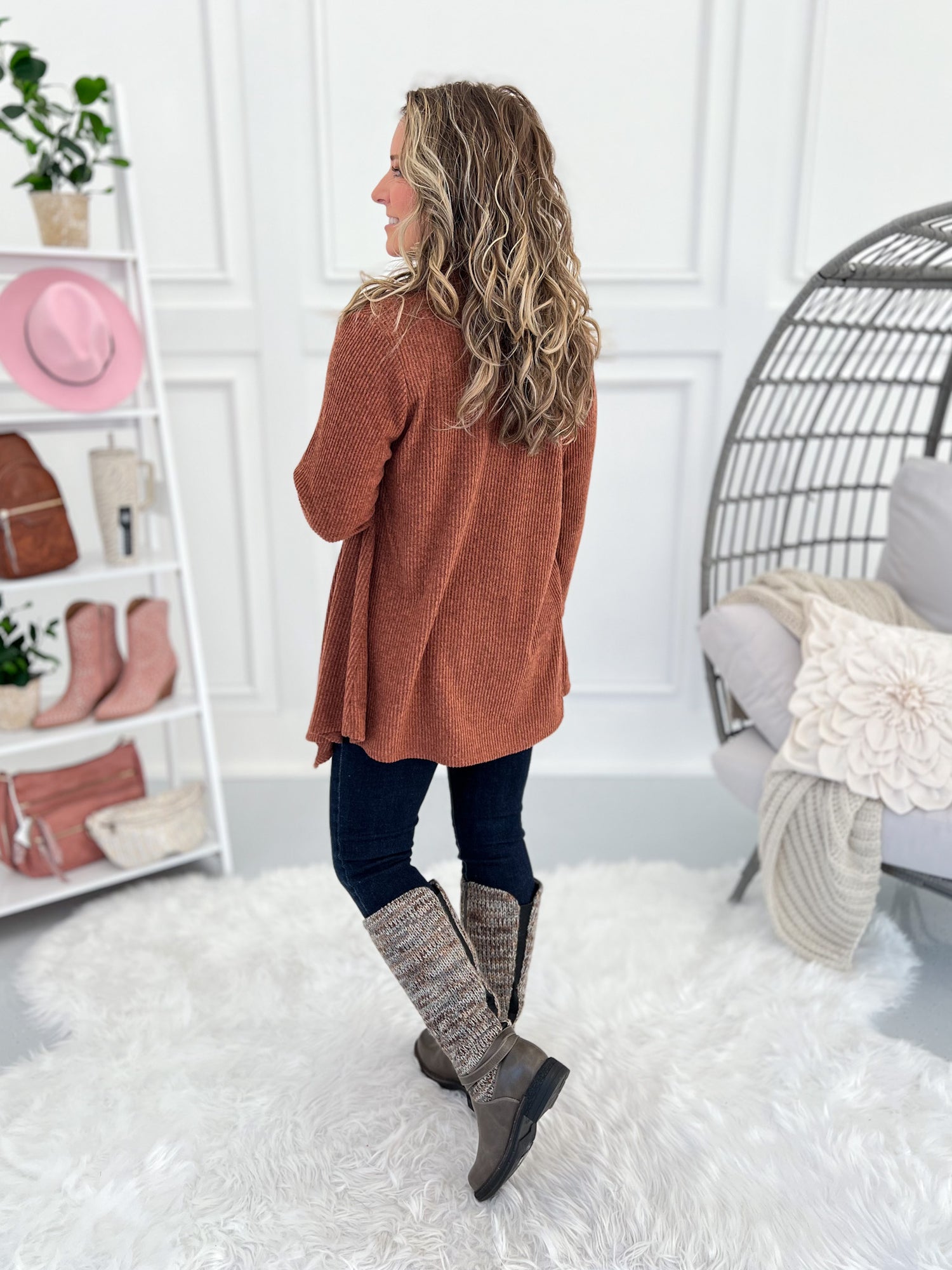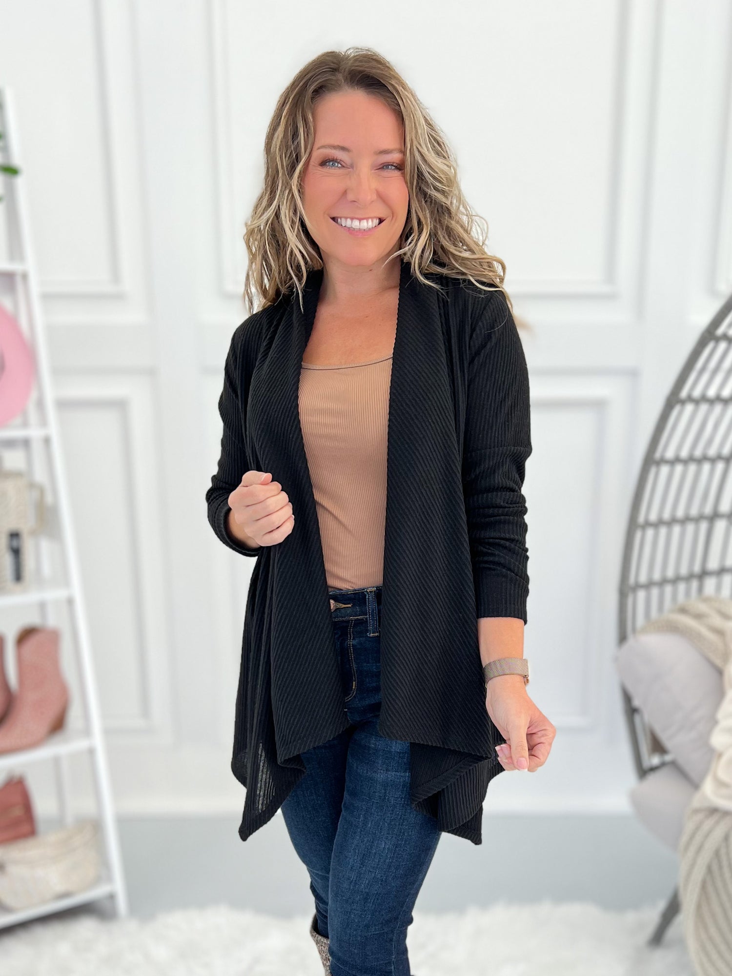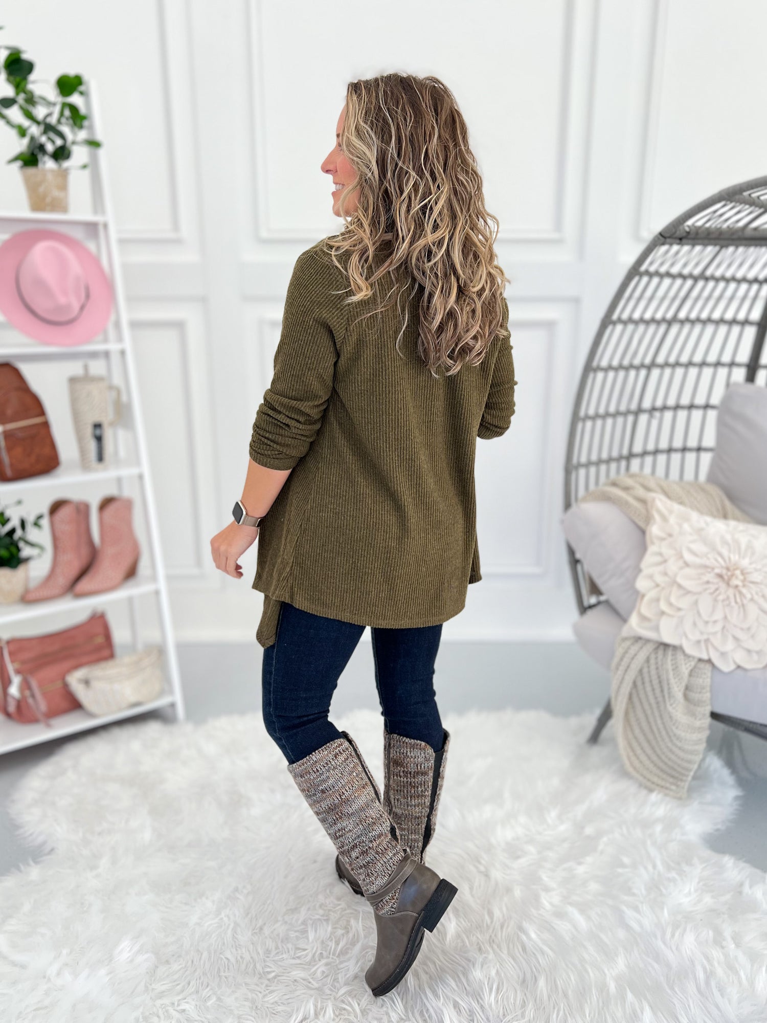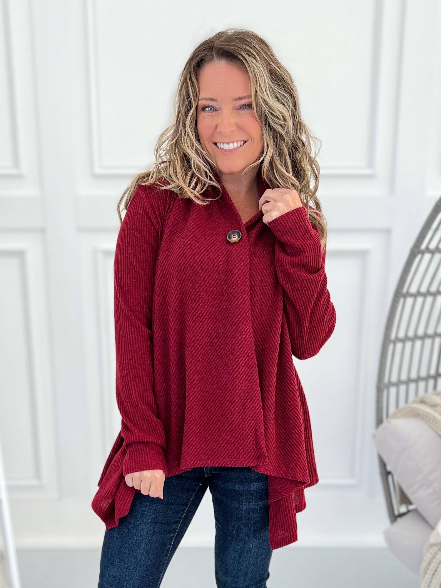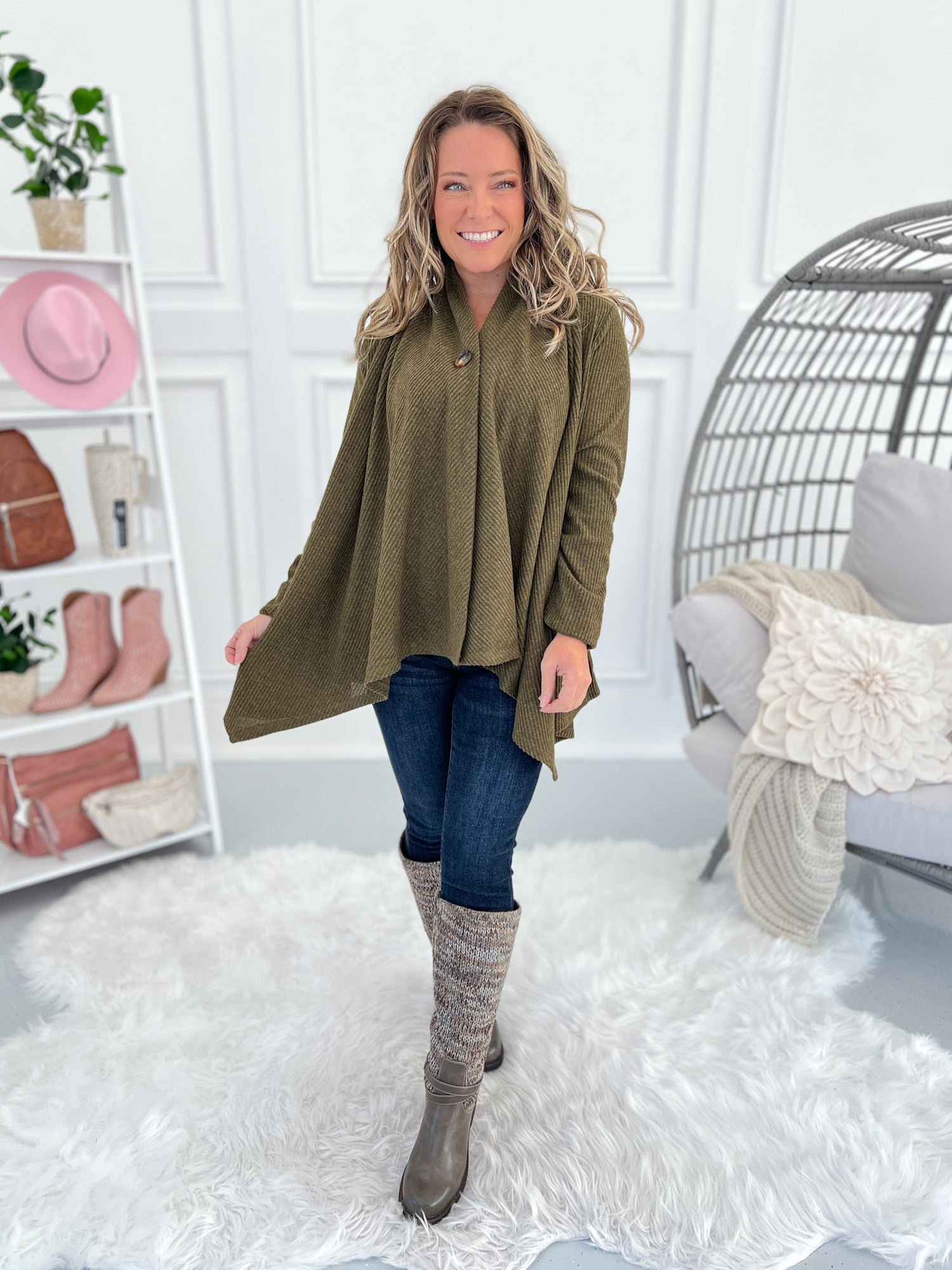 This one’s got options, babe. Wear it buttoned for a flattering swing tunic look or open for a chic, cascade drape cardigan vibe. The brushed ribbed knit is soft, stretchy, and lightweight—perfect for layering all season long with jeans, leggings, or trousers.