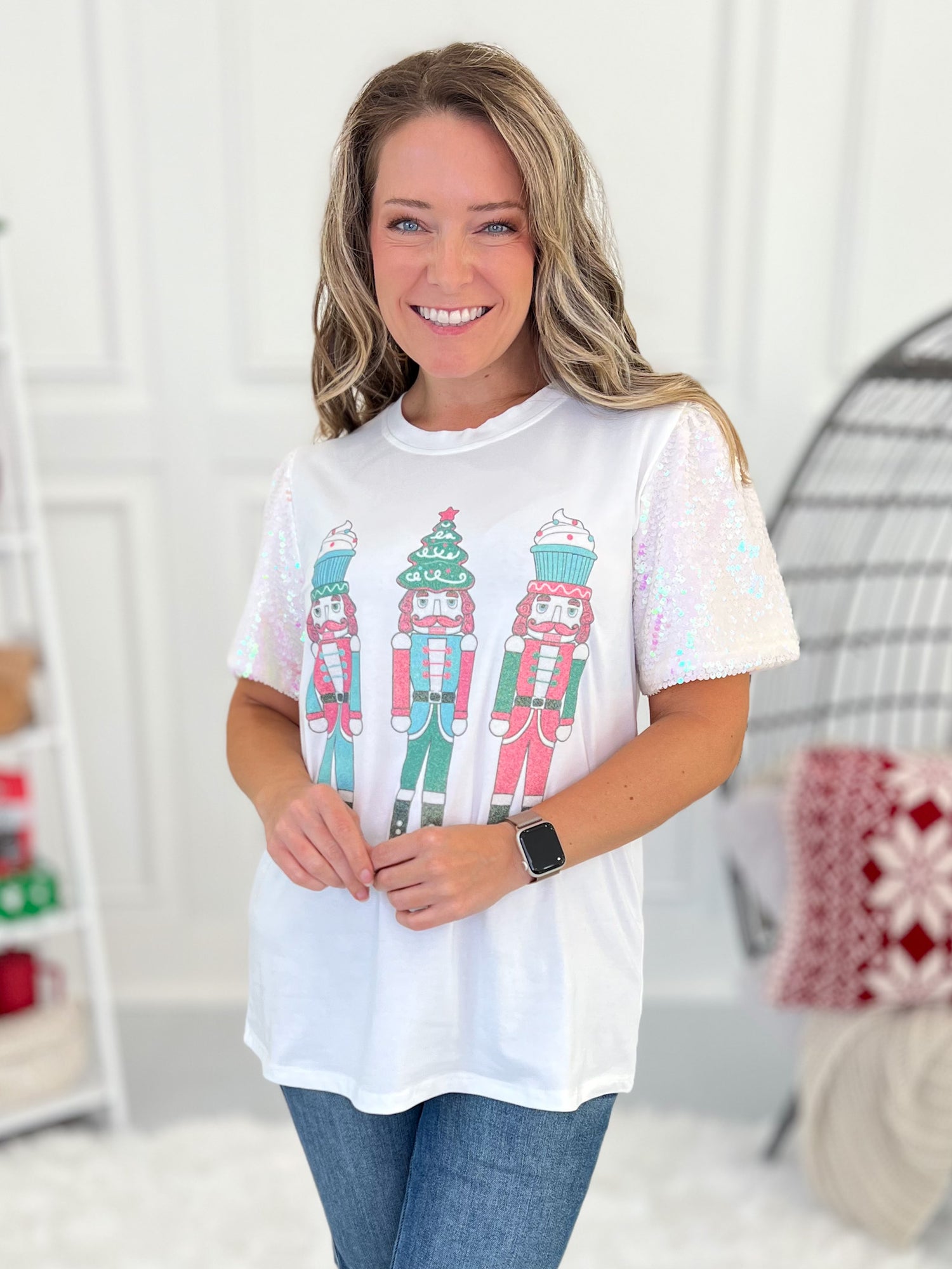 Say it loud—the Son of a Nutcracker Tee brings the fun and sparkle of the season with a glitter screen print that shines (and won’t rub off). Made from a thick, soft cotton blend with lined iridescent sequin sleeves, this tee is your go-to for all things merry and bright. Pair with jeans and layer over a sparkly mesh top for that festive statement look!