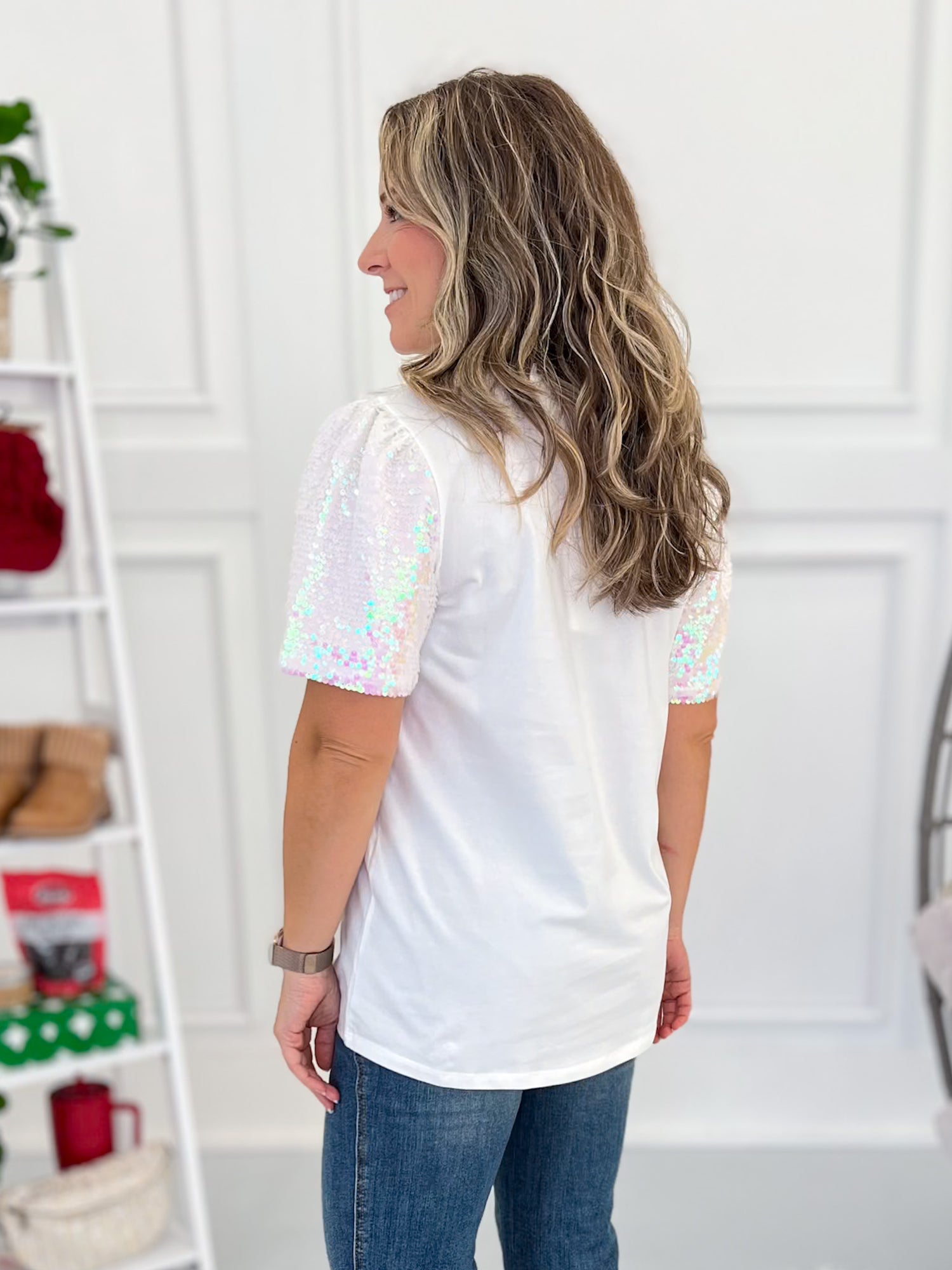 • Iridescent Sequin Sleeves: Fully lined for comfort and full-on holiday sparkle.