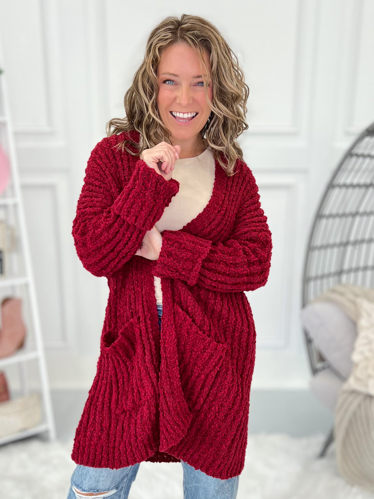The kind of cardi you’ll reach for again and again—this popcorn crochet knit is cozy yet breathable, making it perfect year-round. With its open drape and flattering length, it layers effortlessly over tanks, tees, or blouses. Style it with denim, leggings, or even over a dress for a comfy-chic vibe.