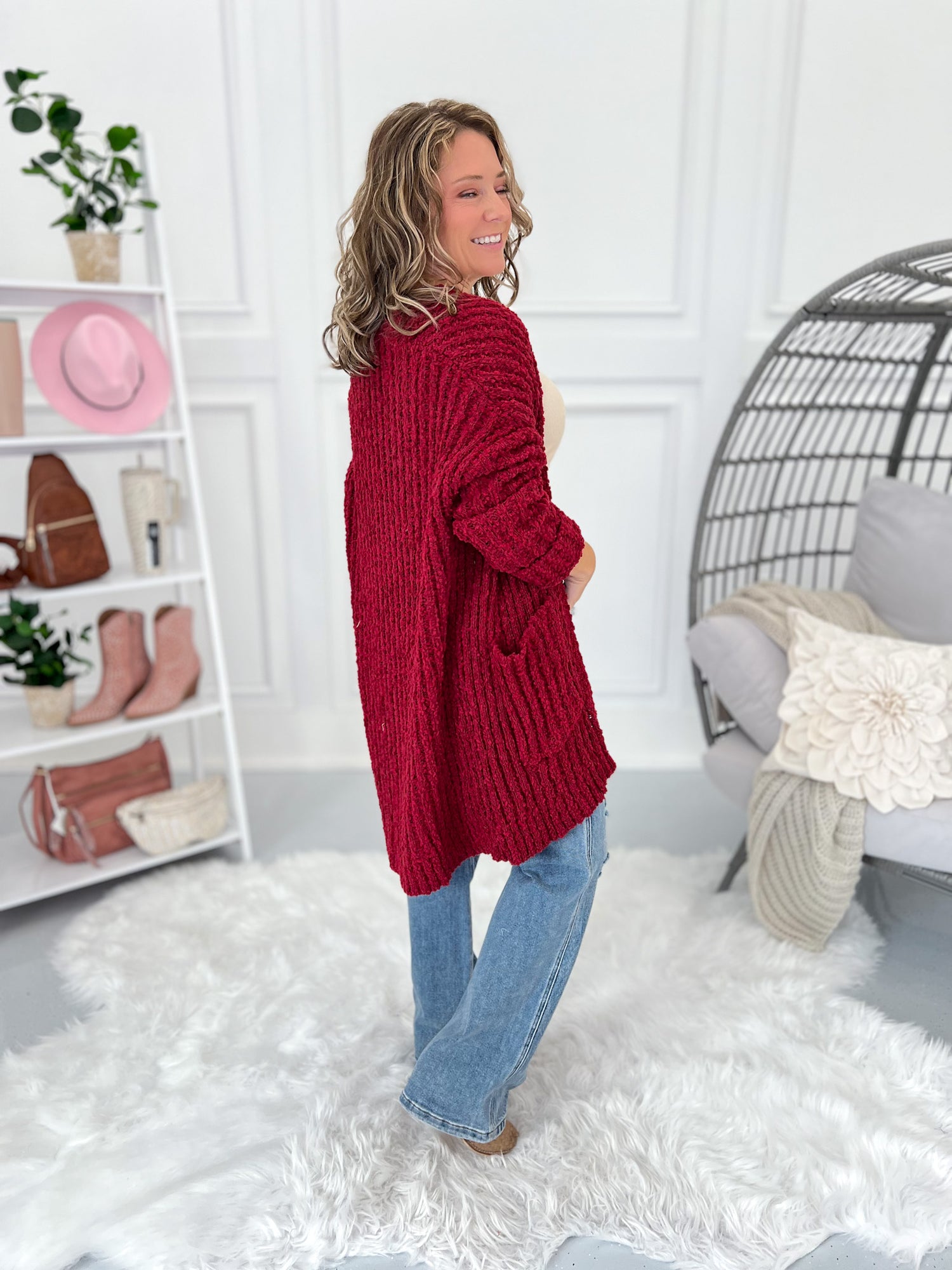 Stay With It Popcorn Crochet Cardigan - Burgundy