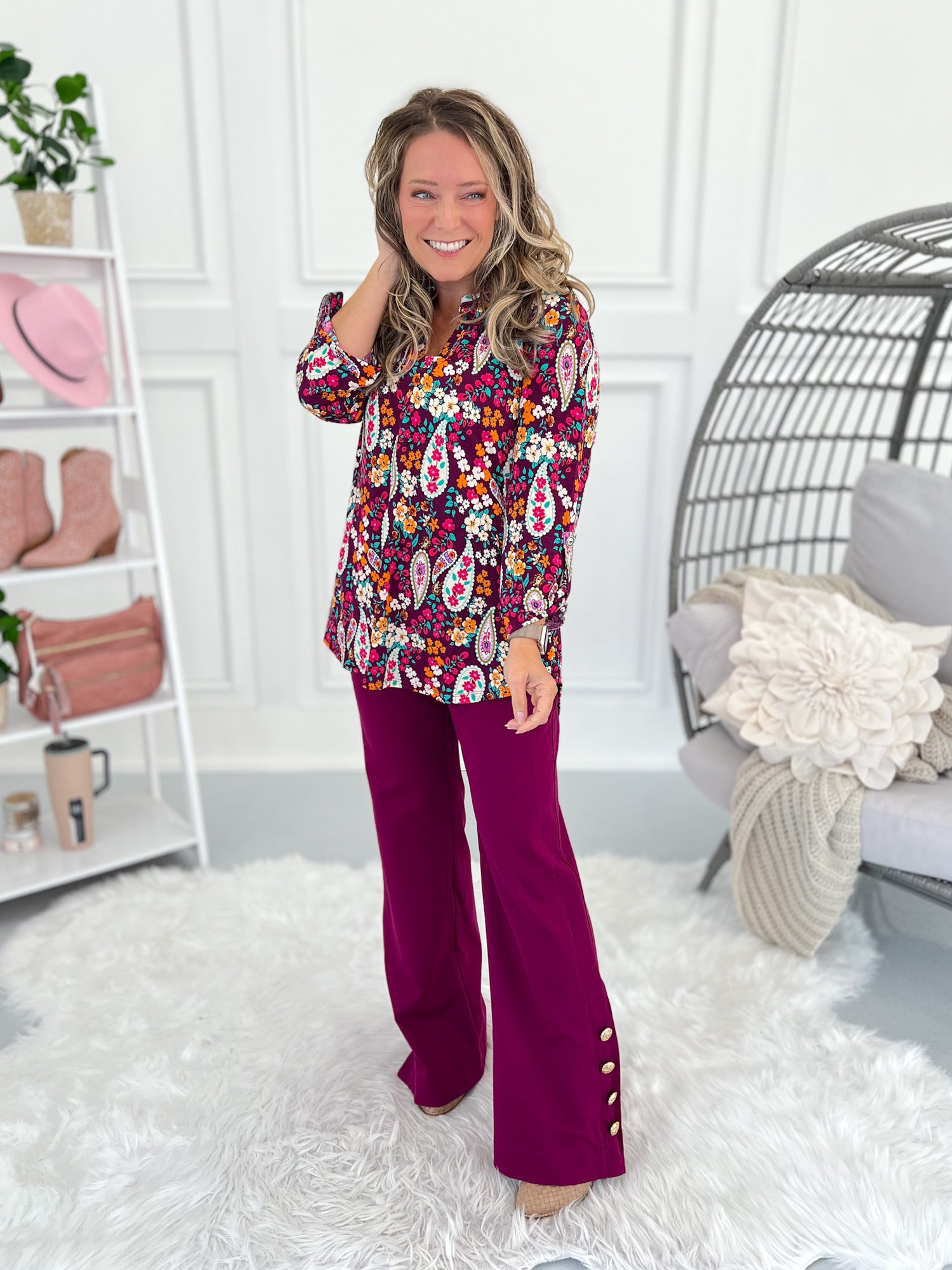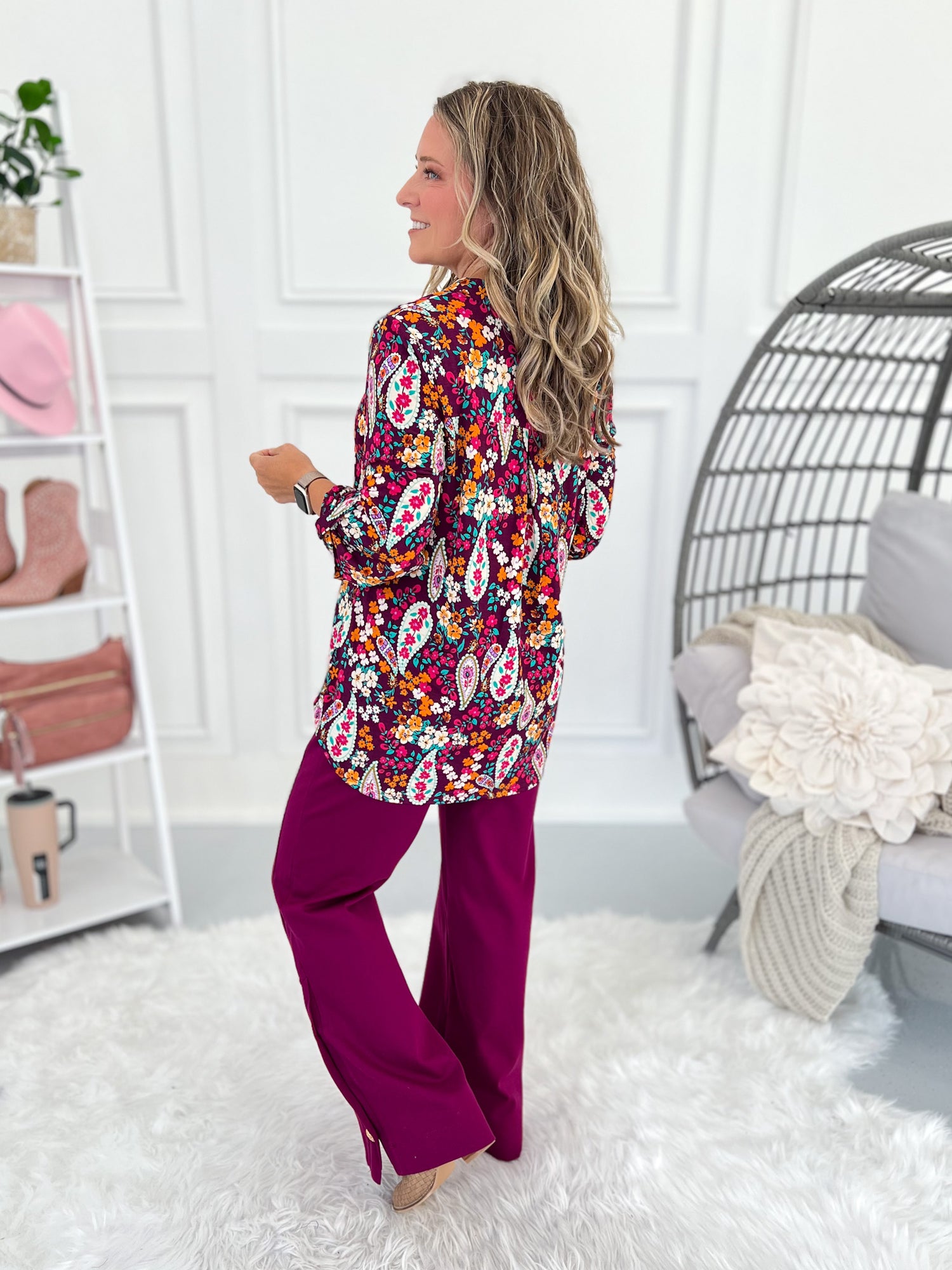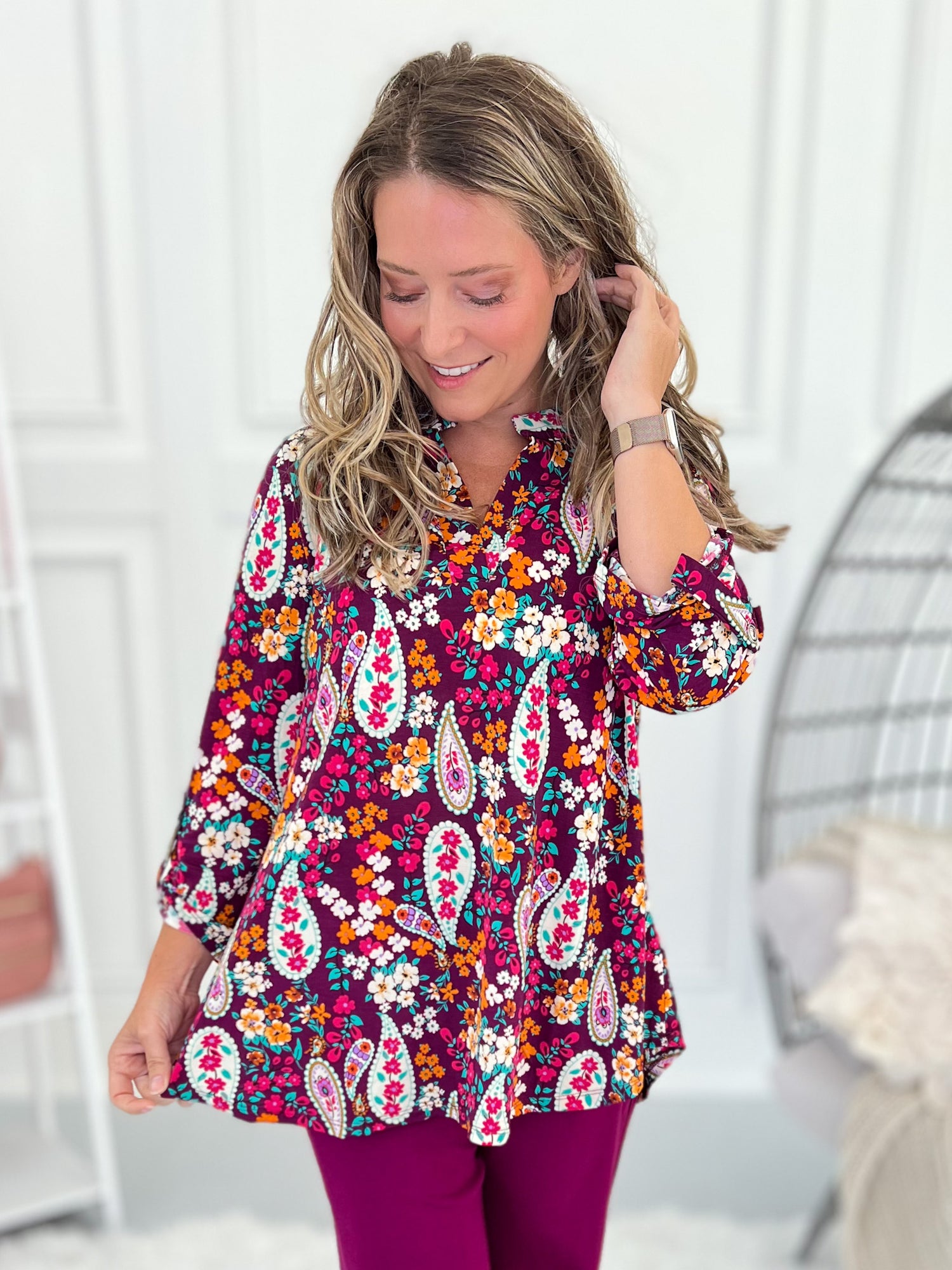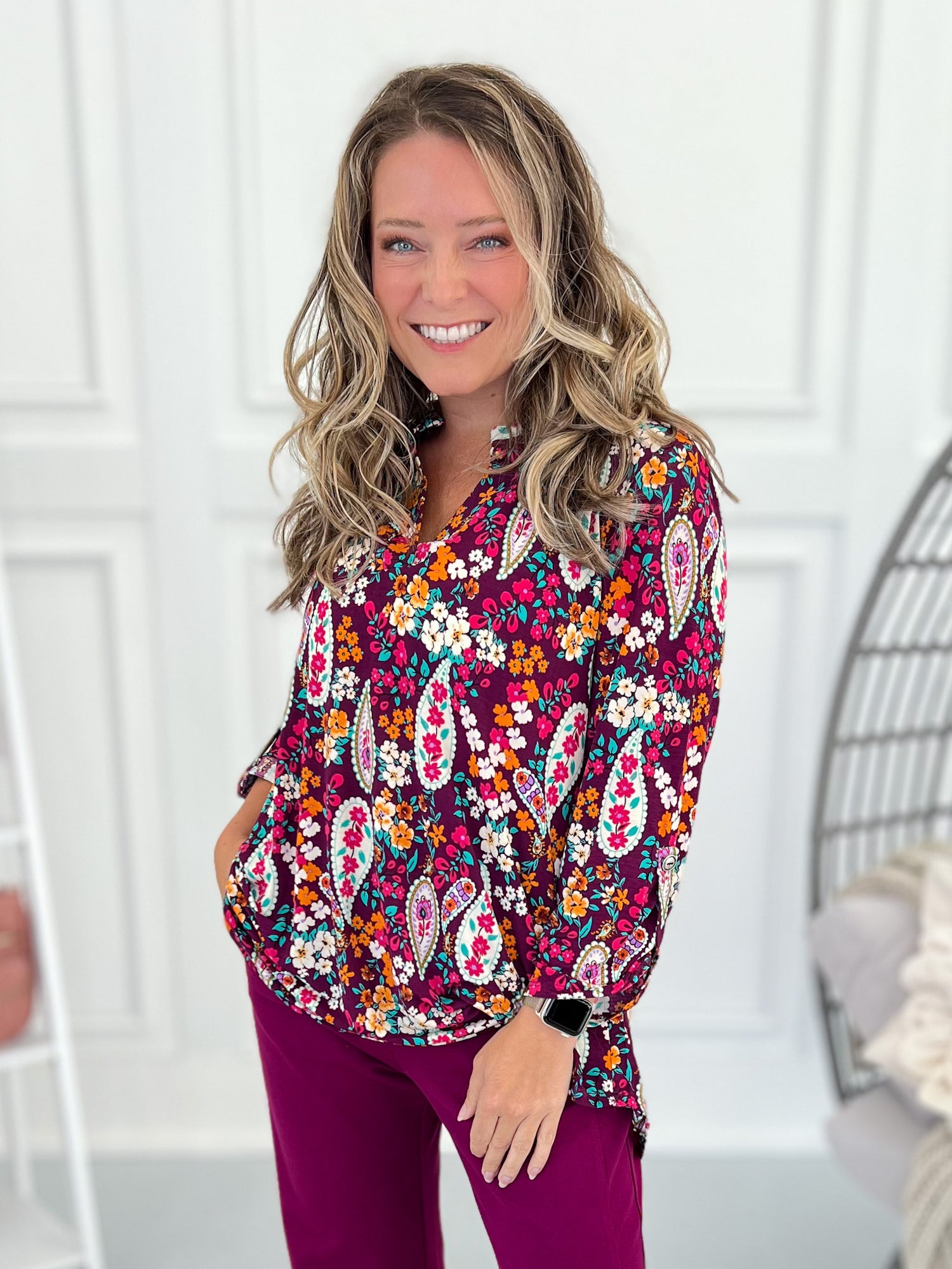 A fresh spin on classic paisley—this Lizzy top mixes rich burgundy with colorful accents for a look that’s anything but ordinary. The lightweight stretch makes it a dream to wear, while the wrinkle-free fabric keeps it sharp all day. Pair it with slacks for the office or denim for weekend wear.