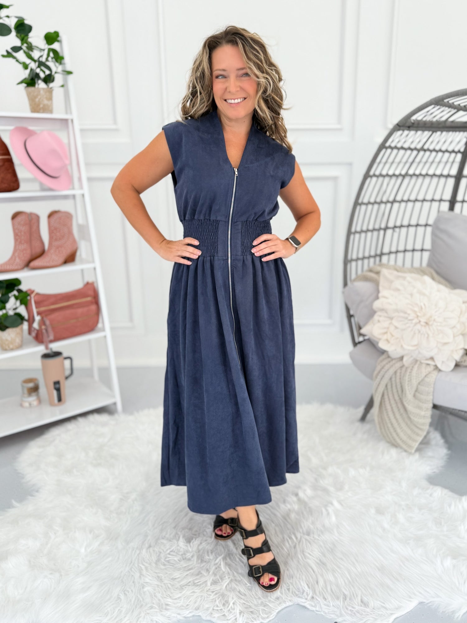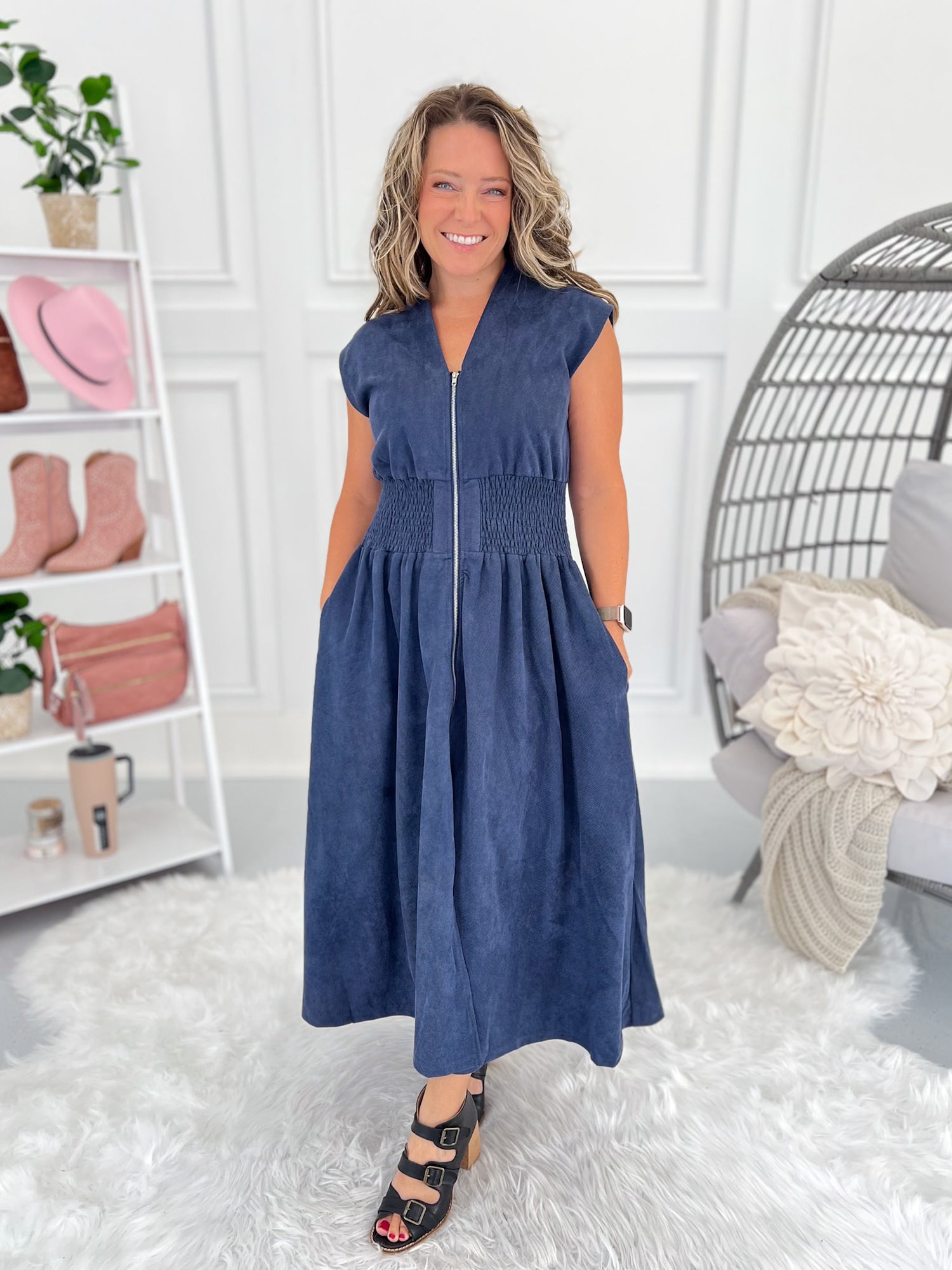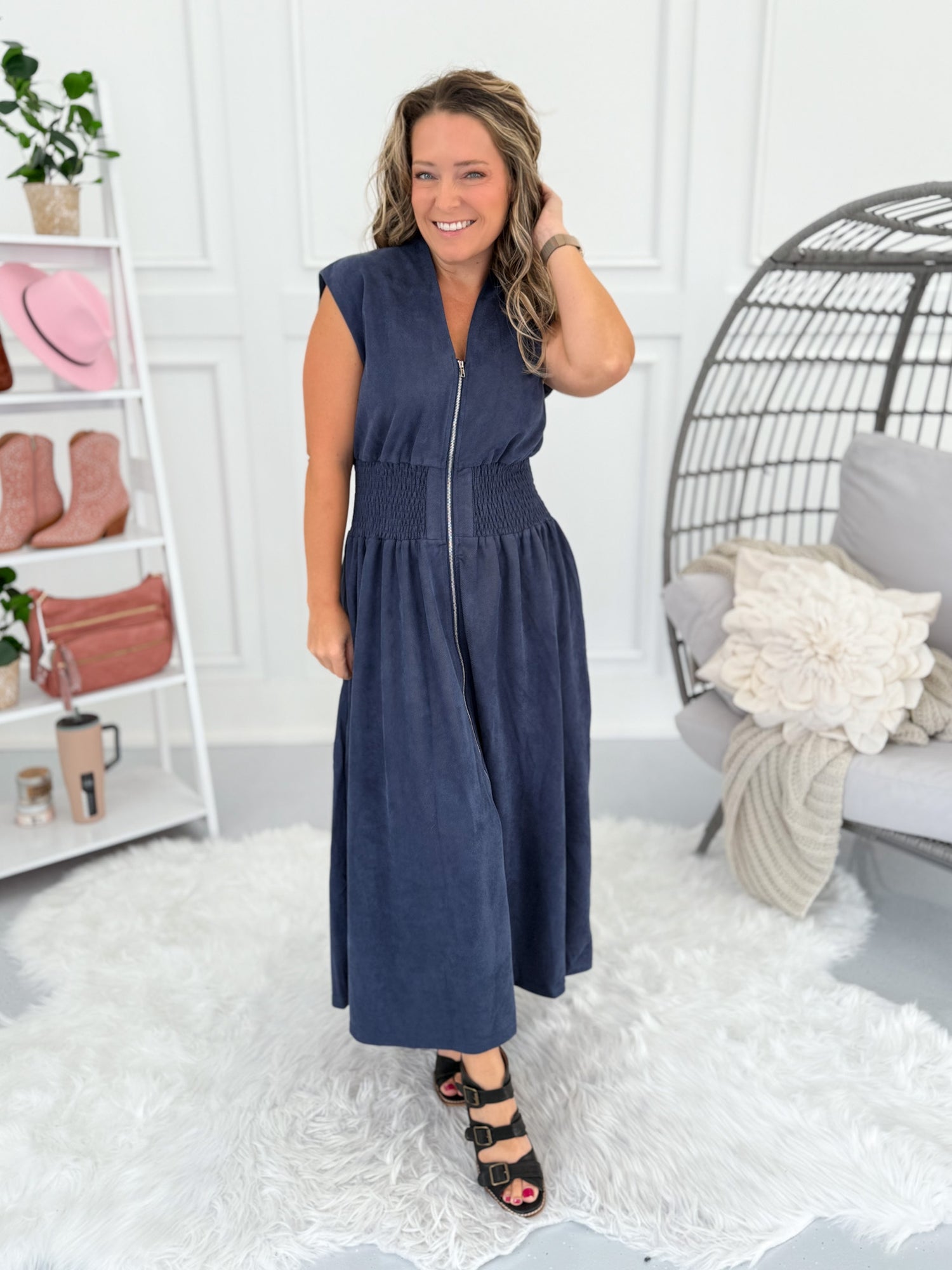 This dress is all about chic simplicity with a flattering fit you’ll want to wear on repeat. The suede-brushed fabric feels luxe, while the smocked waist pulls you in for a perfect shape. The front zip makes it easy to slip on and off, and the cap sleeves give it a cool, modern edge. Pair it with heeled sandals for dinner out or sneakers for a casual day look.