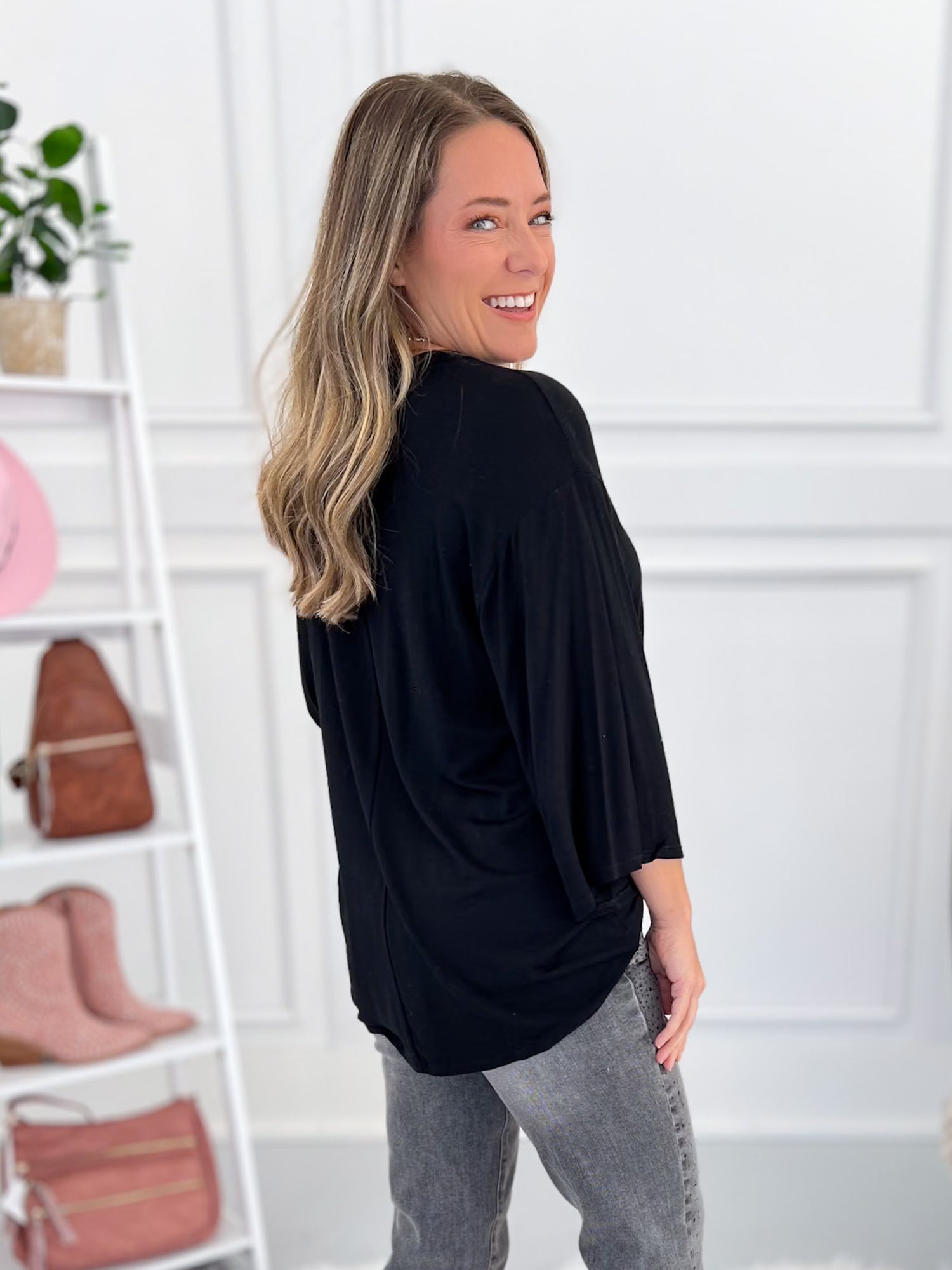 Every close needs a basic black top that can take on any look! This one can be worn on it's own with jeans, under a blazer with dress pants, paired with some cute overalls - it's perfect for any occasion.