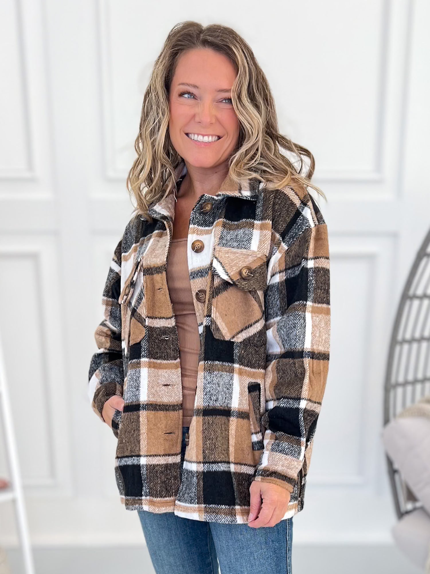 Cozy plaid perfection with a soft brushed feel and just the right fit — not too oversized, not too snug. Easy to layer over your favorite tee or fitted turtleneck with jeans and boots for an effortlessly polished fall look.