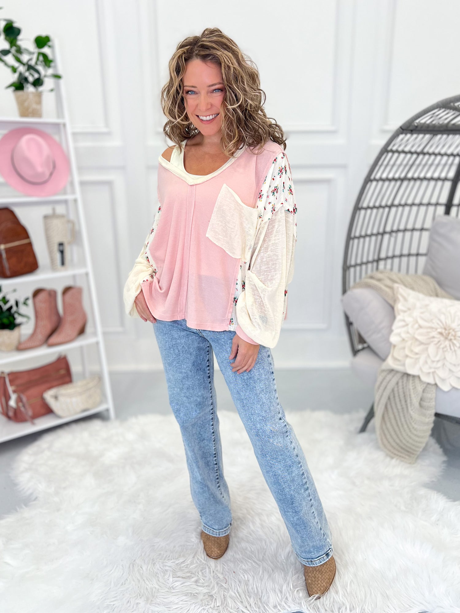 This sweet and airy knit is all about effortless charm — the kind you throw on and instantly feel pretty in. The burnout-style fabric is lightweight and dreamy, and the floral patchwork sleeves add that soft, feminine touch we all love. Style it with denim, shorts, or a bralette to drape the neckline off one shoulder for an easy, romantic vibe.
