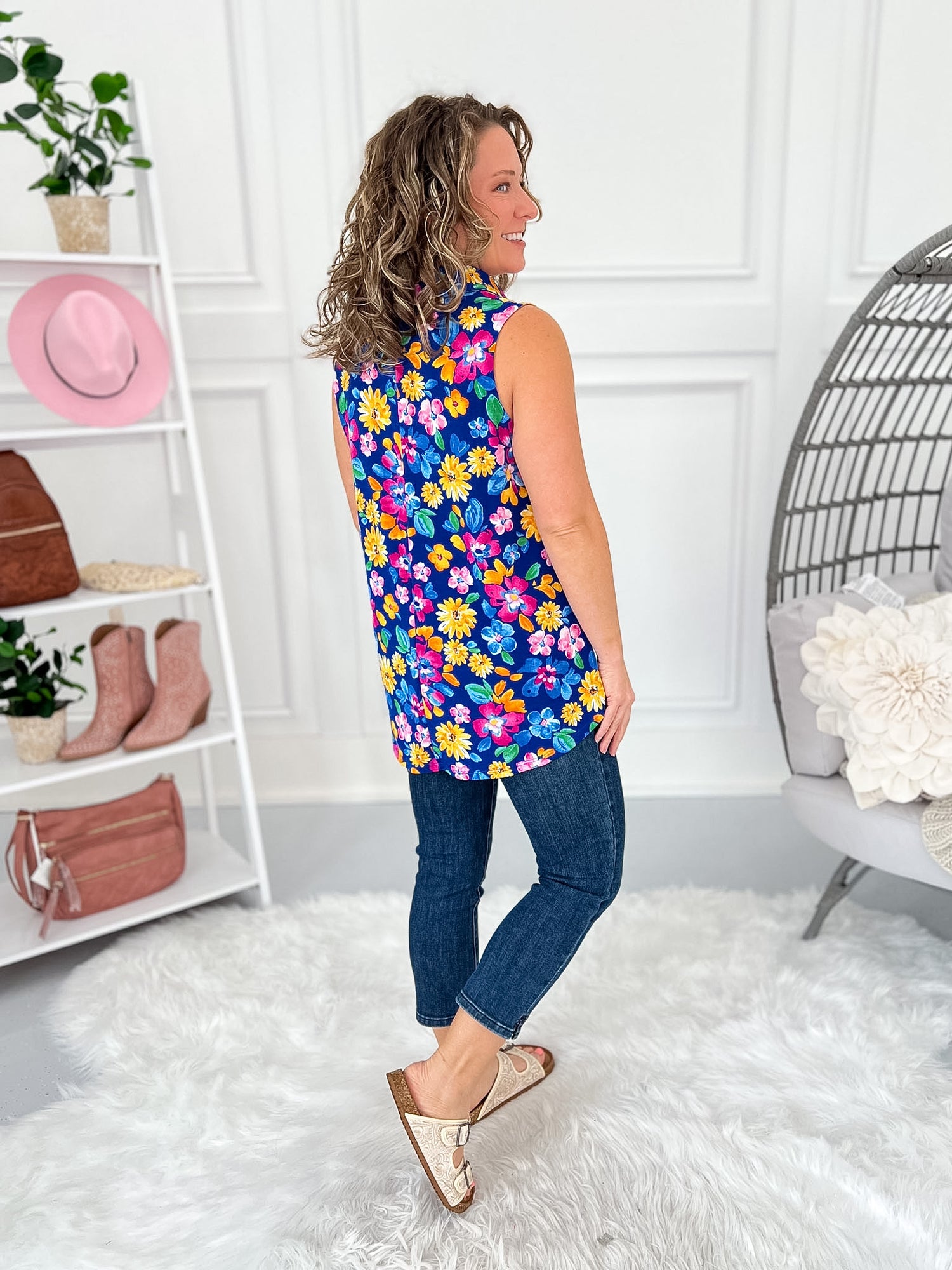 Blue floral sleeveless tank top with button neckline and collar. Lightweight, moisture-wicking Dear Scarlett athleisure tank with stretch and flattering A-line fit—perfect for everyday wear.