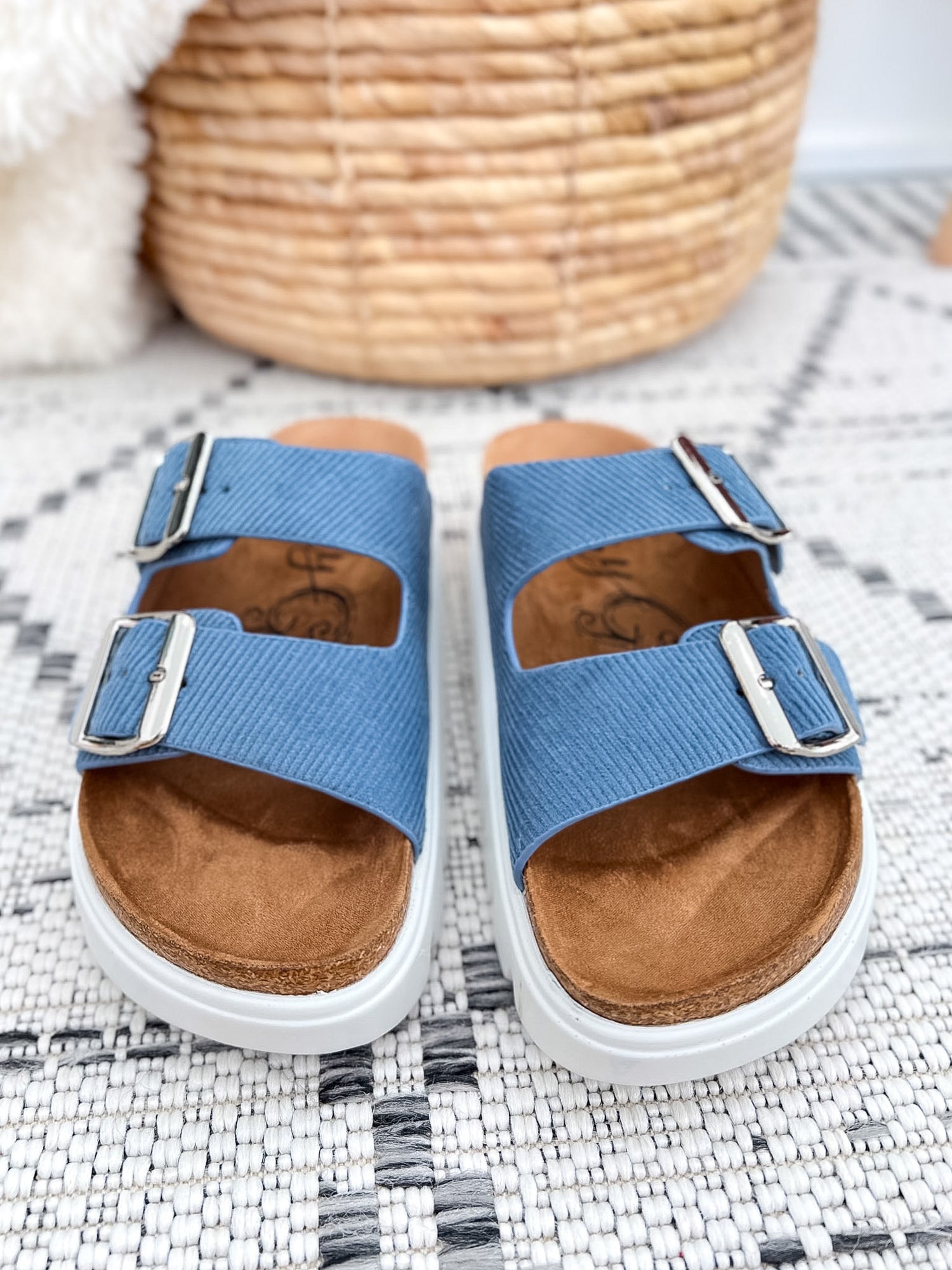 A comfortable Very G platform sandal with ribbed faux suede straps, adjustable buckles, and a cushioned footbed—finished in a soft blue for an easy pop of color.