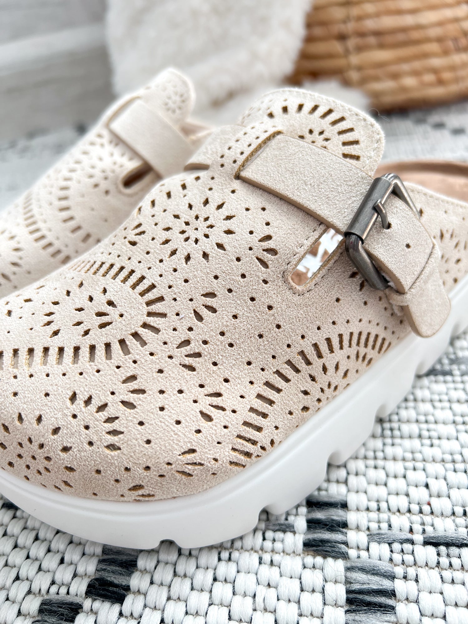 The Very G Lulu Platform Clog in cream is the perfect blend of comfort and laid-back style. With a laser cut faux suede upper, supportive platform sole, and cushioned memory foam footbed, this easy slide clog adds comfort and subtle height to your everyday look.