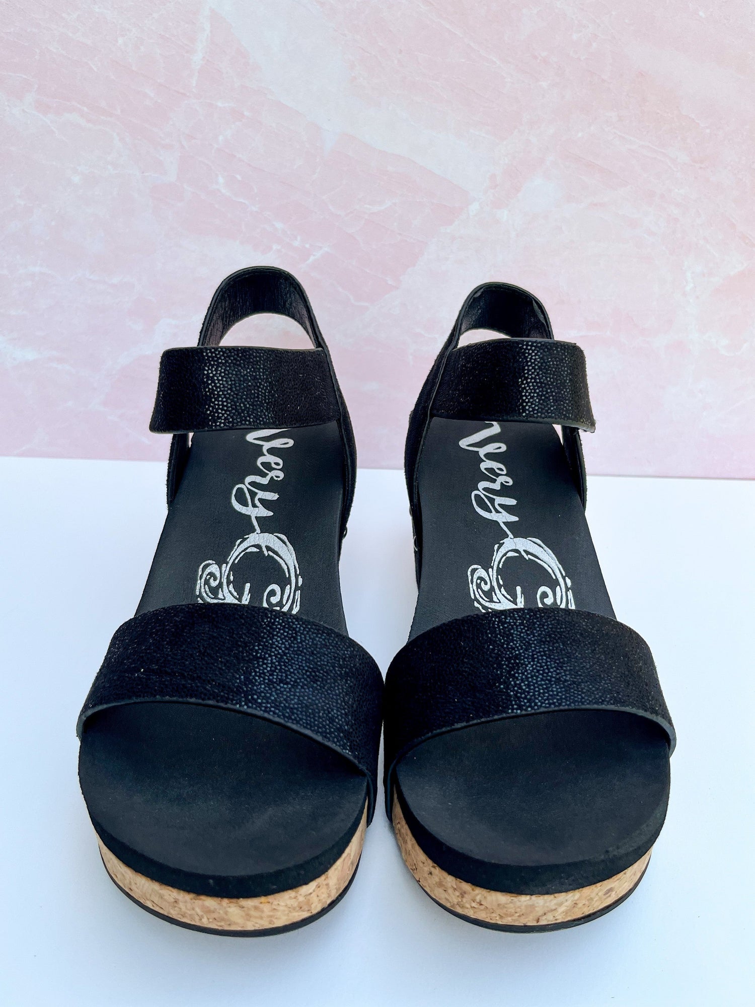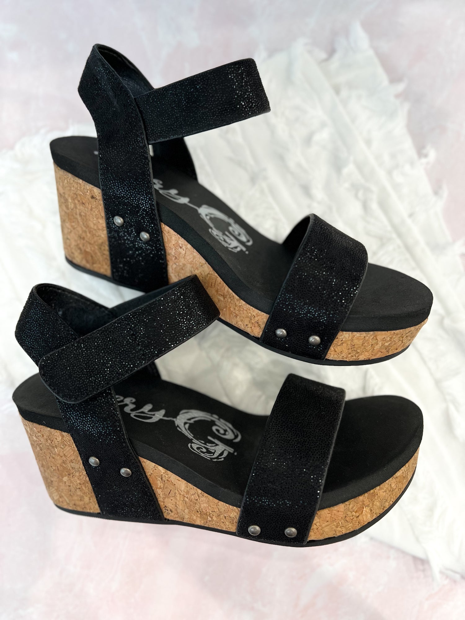 Step into sparkle with these lightweight wedge sandals! The black faux leather straps have just the right amount of shimmer, while the cushy memory foam footbed keeps you comfy all day long. Finished with a cork-style wedge and easy velcro ankle closure, these are the perfect pair to take from casual days to dressed-up nights.