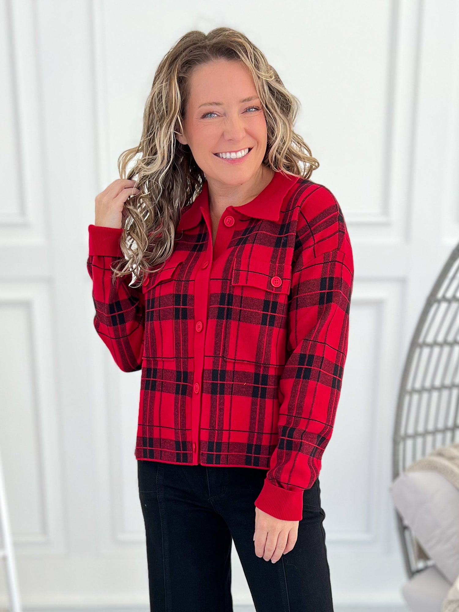 Nothing says cozy-chic quite like this festive plaid knit. The Warm Hugs Button Up is that buttery-soft, stretchy sweater that feels like a hug but looks totally put-together. With its luxe viscose knit, bold red-and-black plaid, and collared button-up style, it’s an instant outfit maker—wear it buttoned up, open over a tee, or layered under a vest for a little extra flair.