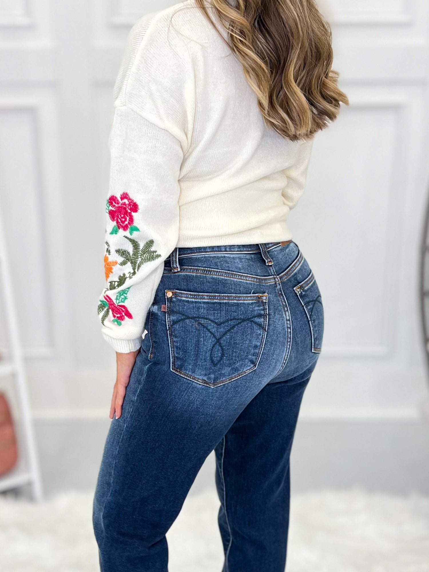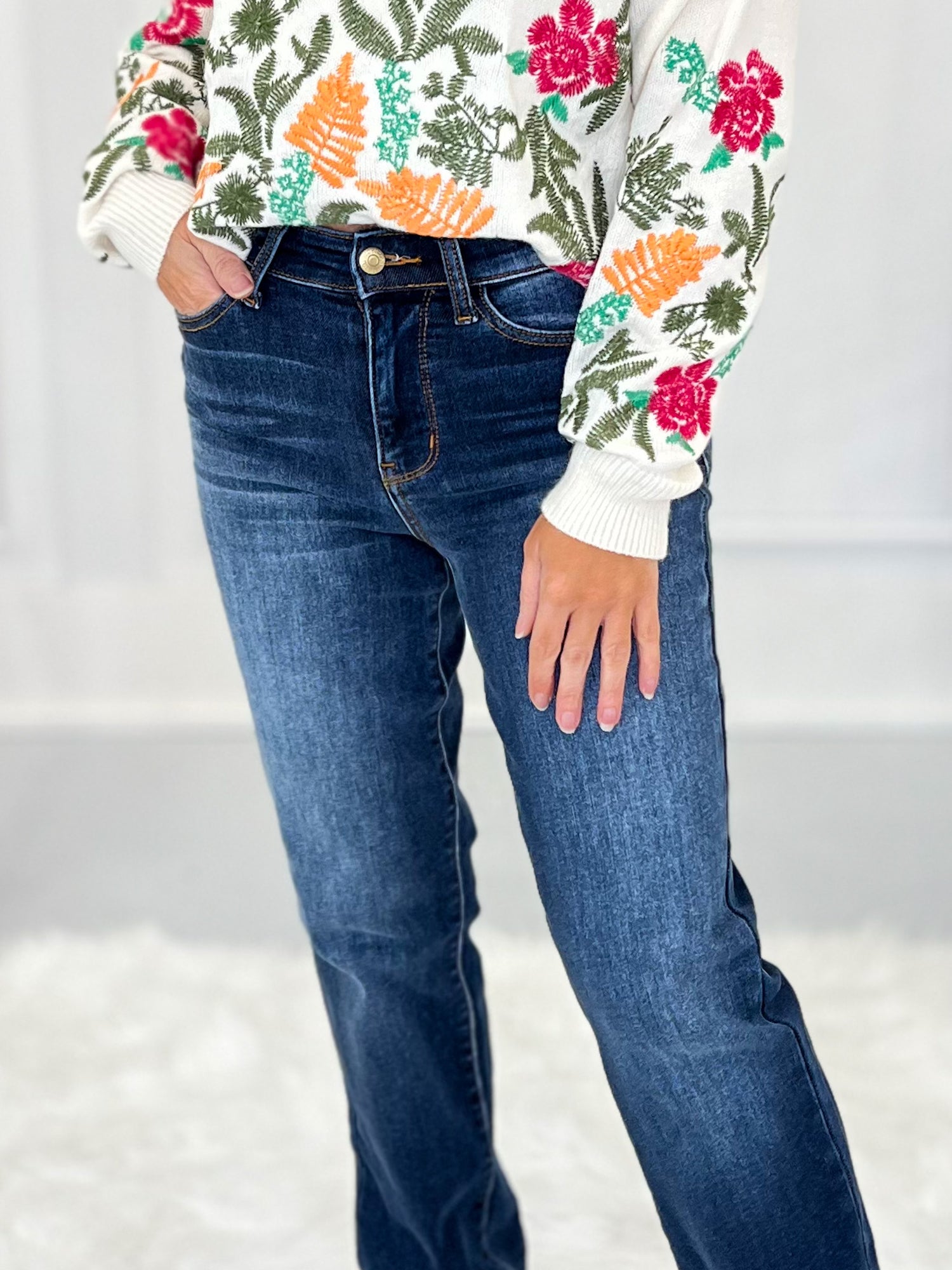 To get your perfect fit, first, let's find your true Judy Blue size. This will be your starting point for all Judy Blue jeans. This brand is generously cut, so you'll find your true Judy Blue size by taking your even, department store pant size and subtracting a number. Once you have determined your true Judy Blue size, then take a peek at the product description of each pair of jeans to see how we recommend sizing! This part is super important - they all fit and stretch a bit different! Lastly - don’t forget to check the item details to see the inseam, rise and fabric for each pair of jeans! Remember that rise is body type dependent (so a high-rise on a short torso may be a mid-rise on a long torso) and we all have multiple inseam preferences depending on the style of jeans we are shopping for!