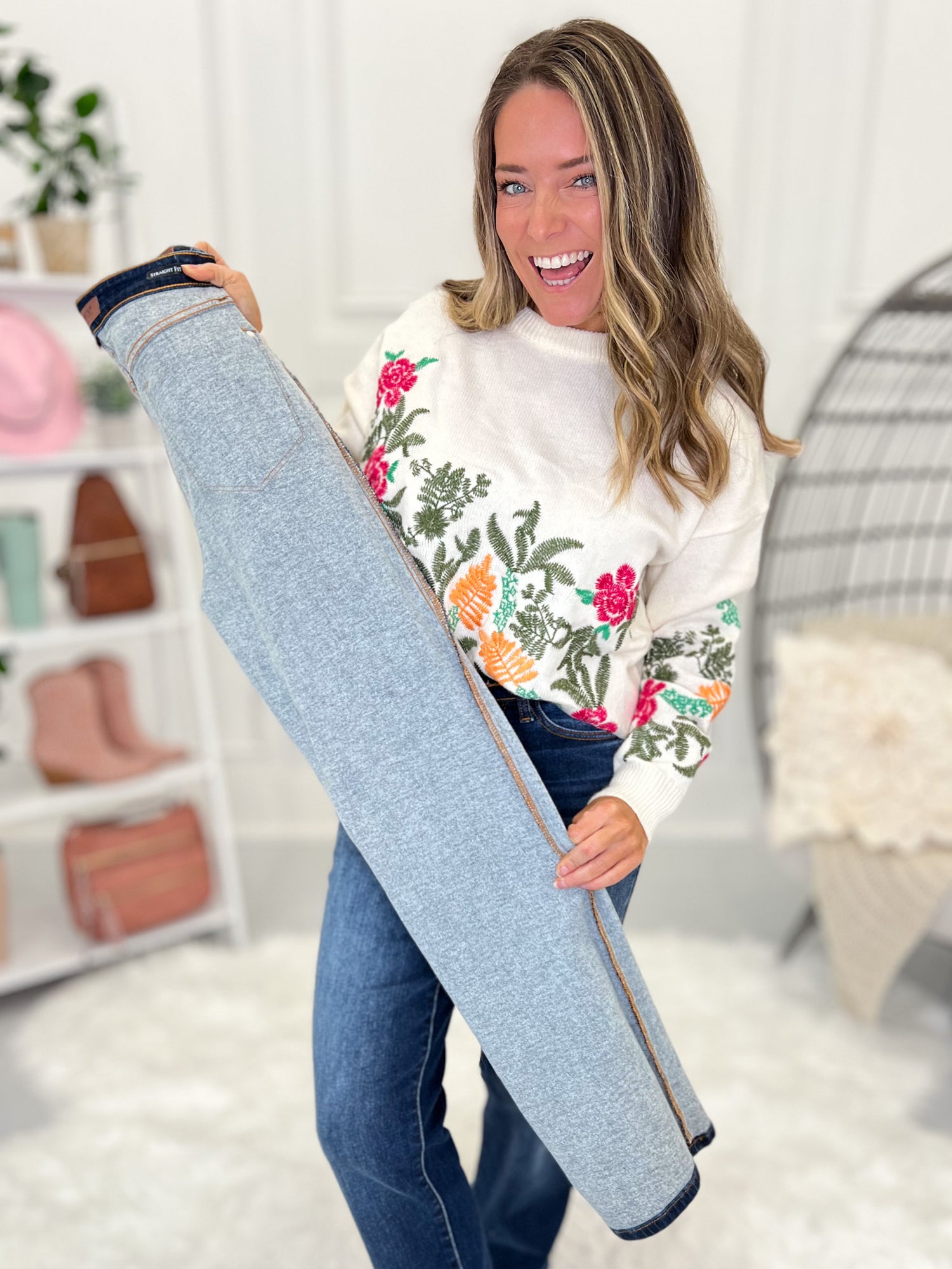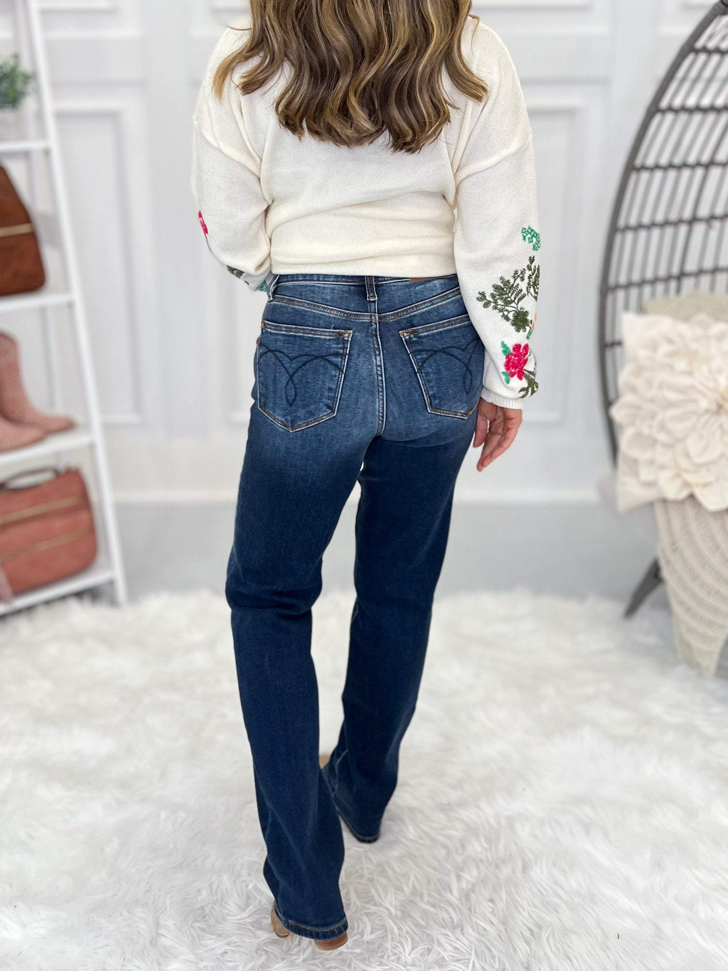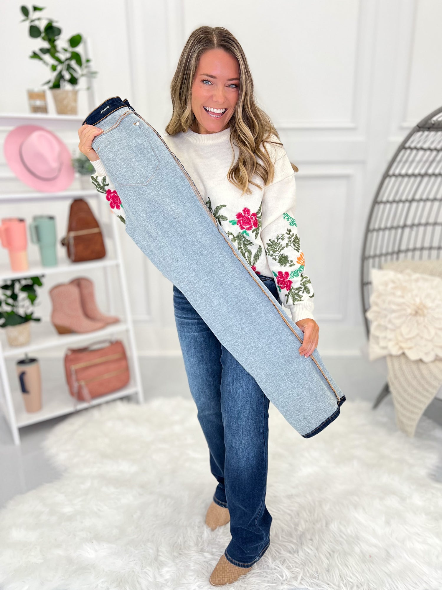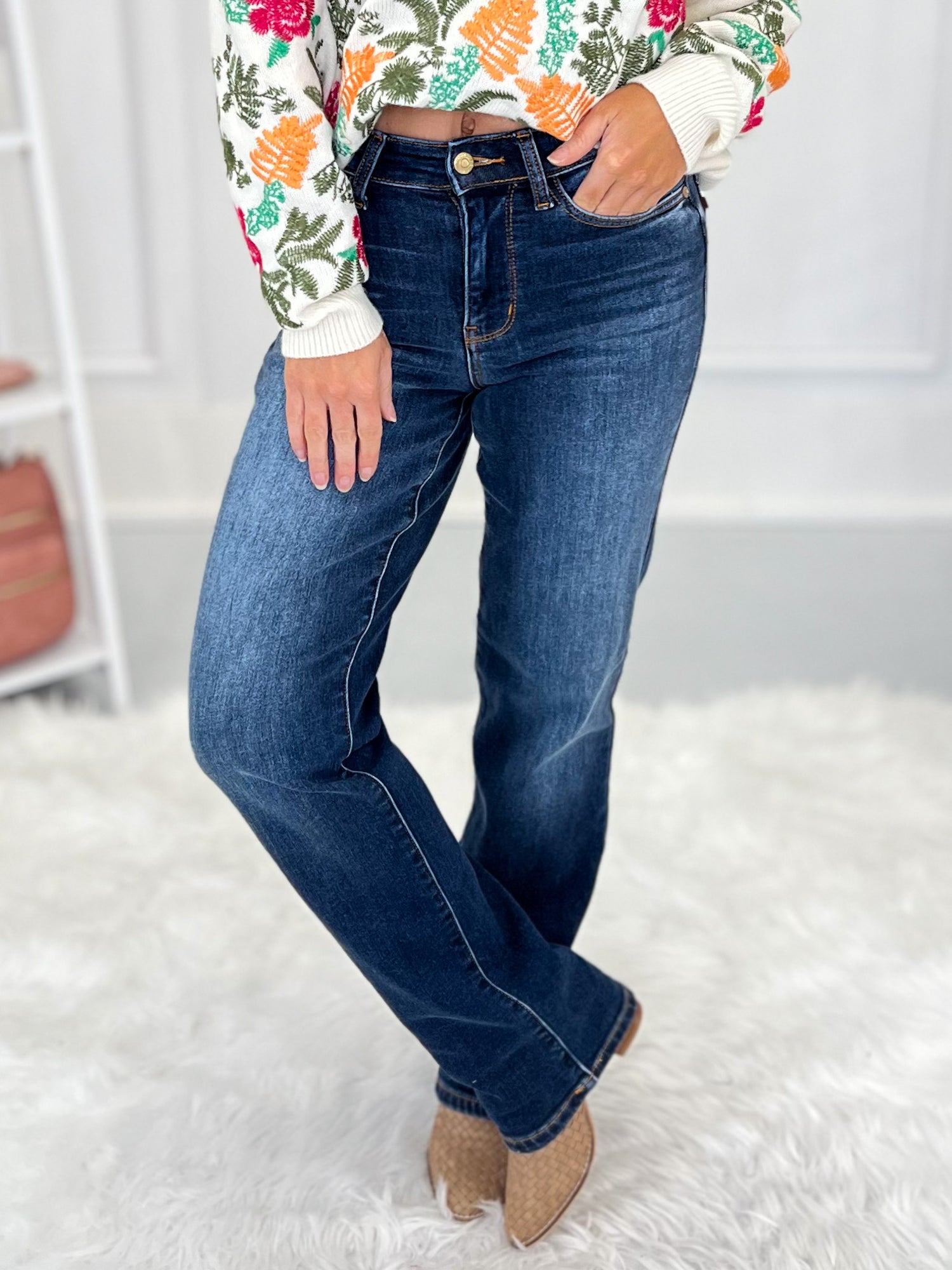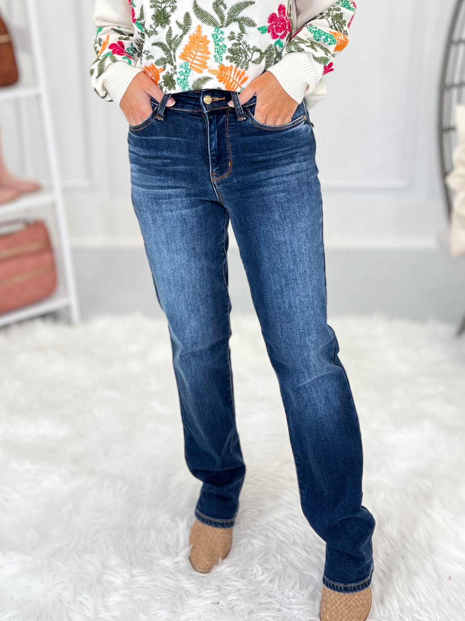 Play up the cozy vibe of these amazing, Judy Blue thermal jeans by pairing them with your favorite chunky sweater, grandma style cardigan or shacket! The straight leg silhouette makes them boot friendly, but they look fantastic with heels, flats or tennis shoes too.