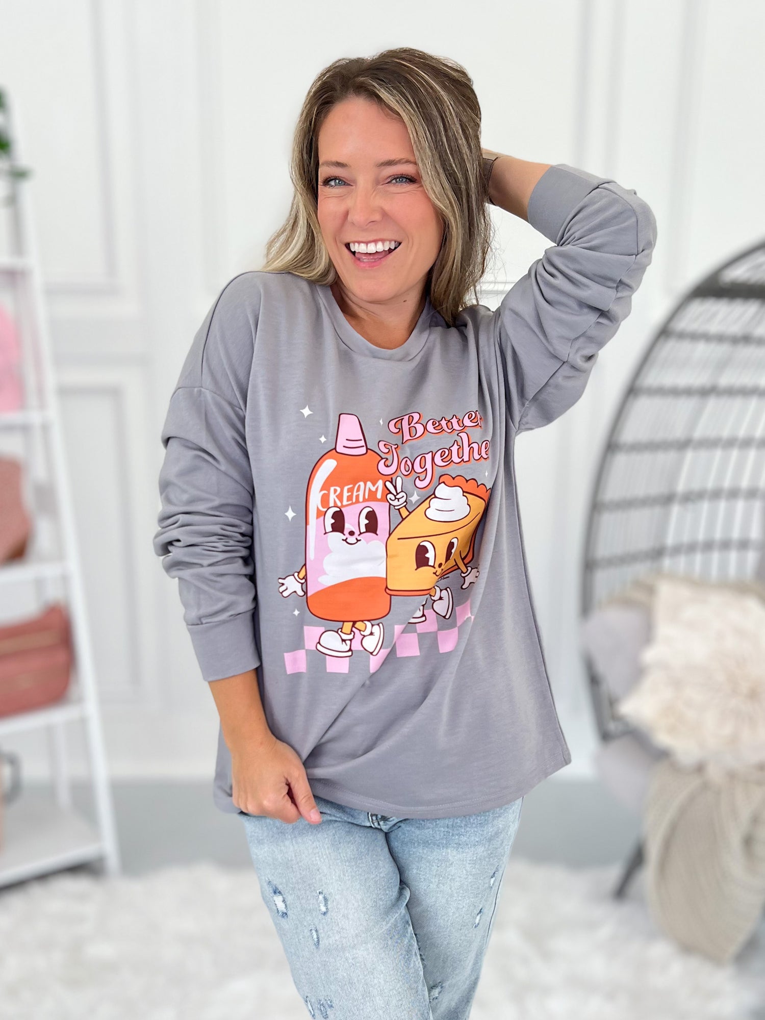 Cozy up in this lightweight terry long sleeve featuring the cutest “Better Together” graphic that’s perfect for fall vibes. Soft, comfy, and fun for pairing with jeans or leggings for an effortless casual look.